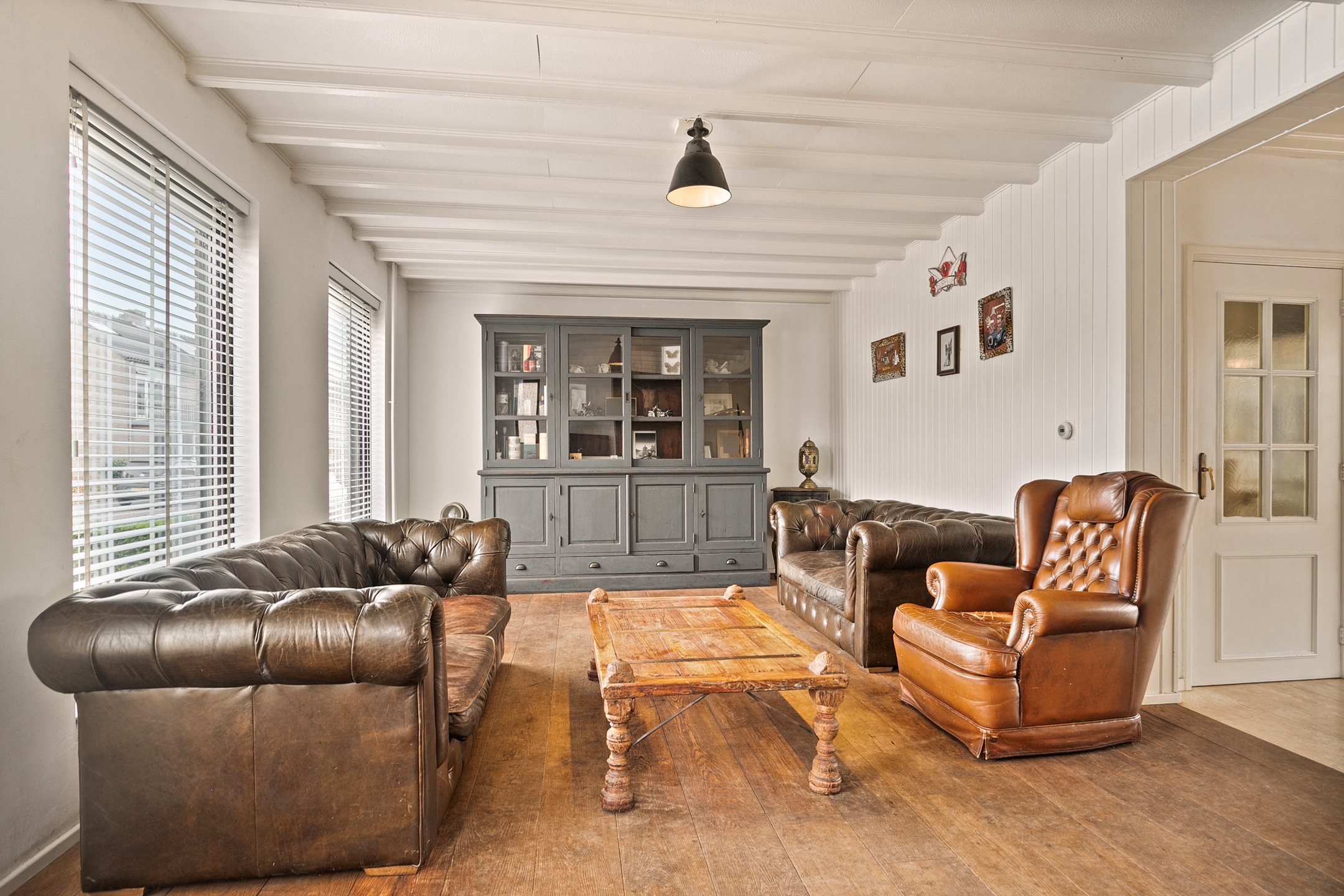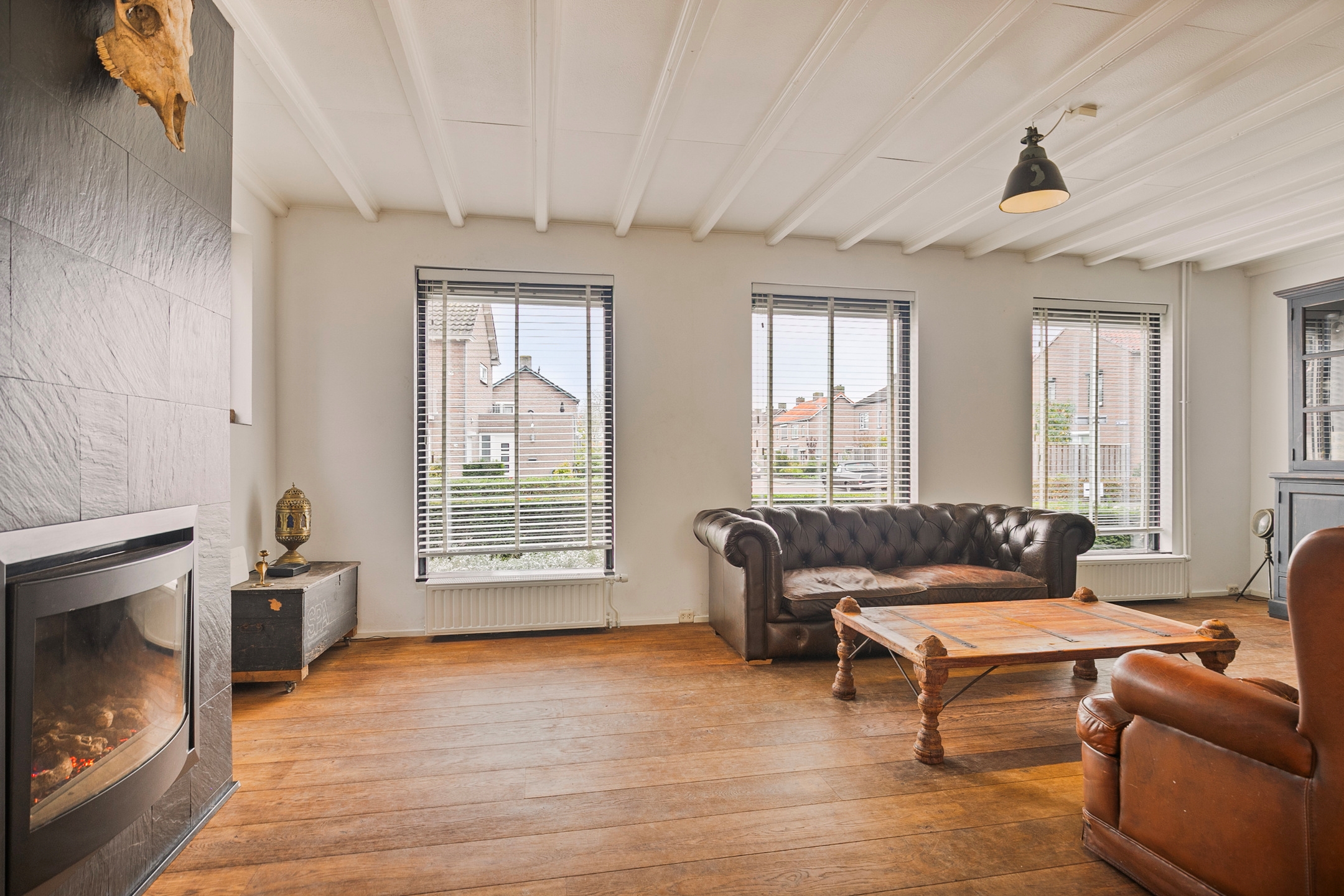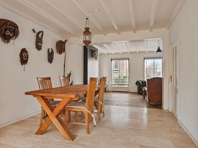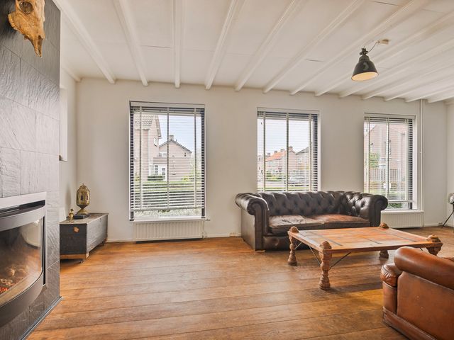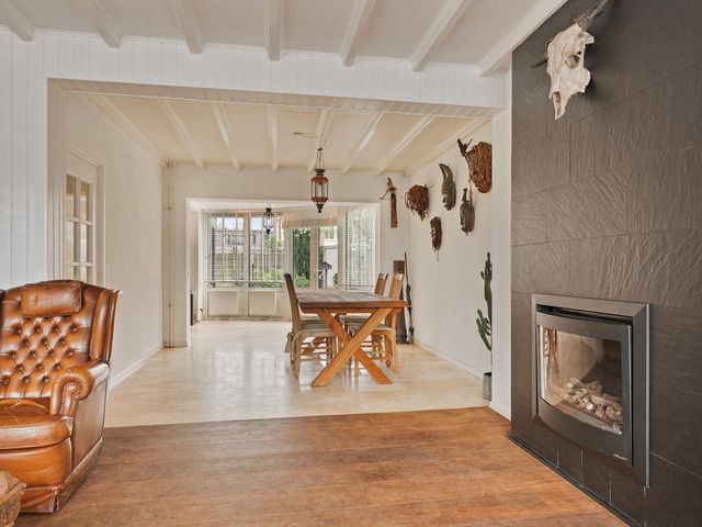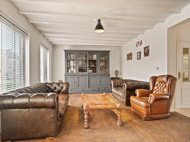 Bij binnenkomst valt direct de ruime en lichte woonkamer op. De klassieke houten vloer in combinatie met de grote raampartijen en wit geschilderde balkenplafonds geven de ruimte een rustieke charme. De sfeervolle haard vormt het middelpunt en nodigt uit tot gezellige avonden met familie en/of vrienden.
