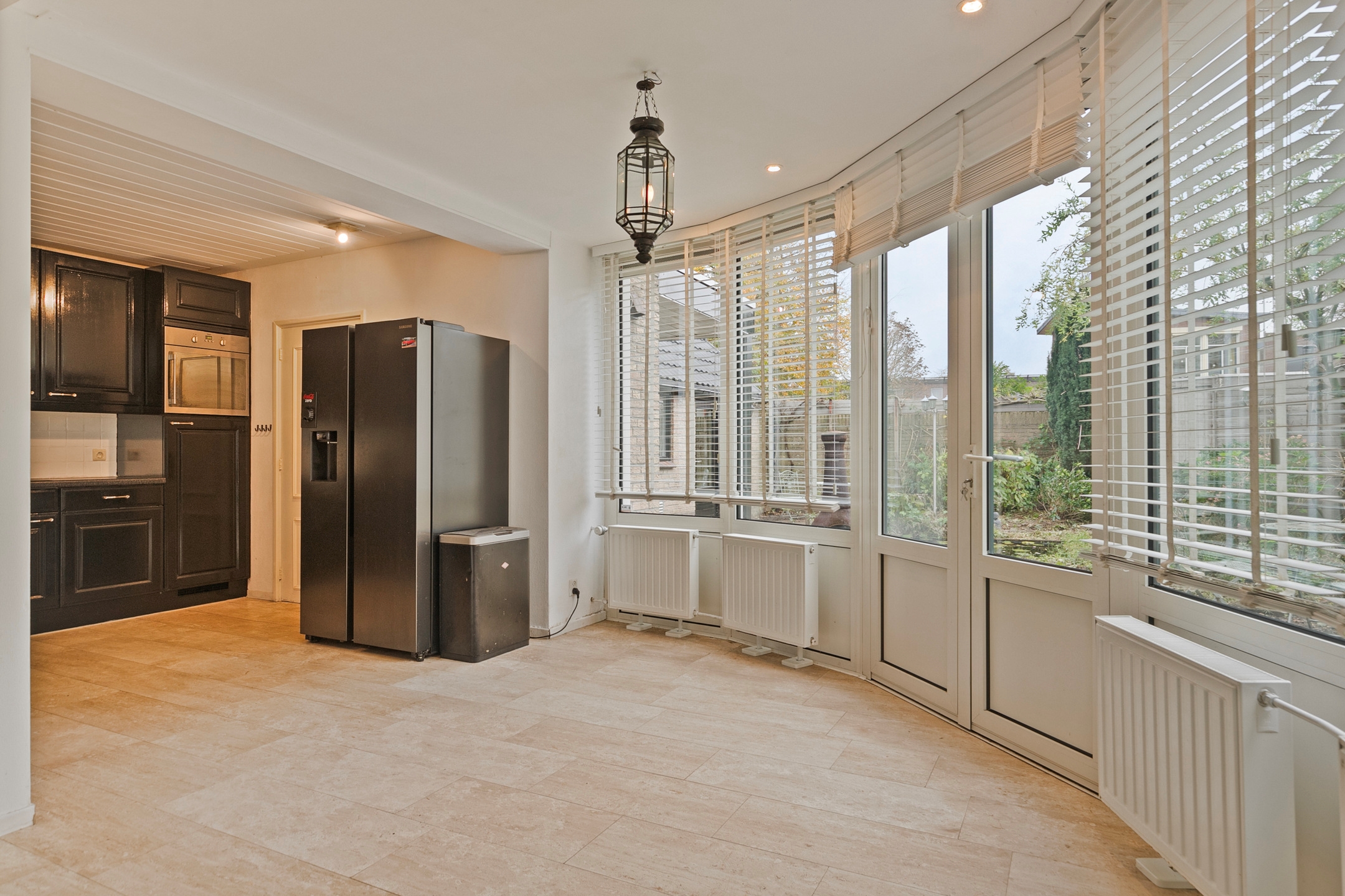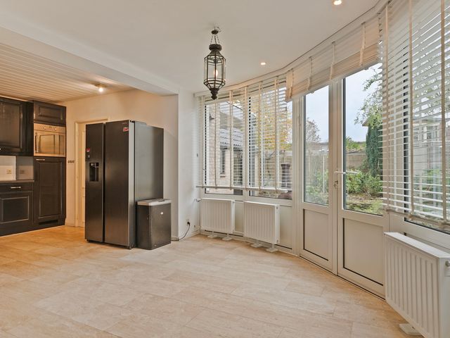 Vanuit de woonkamer loopt u door de eetkamer naar de keuken. Door de doorlopende tegelvloer sluiten de eetkamer en de keuken naadloos op elkaar aan. De grote raampartijen en openslaande deuren naar de tuin zorgen ook in dit gedeelte van de woning voor een opvallende hoeveelheid licht.