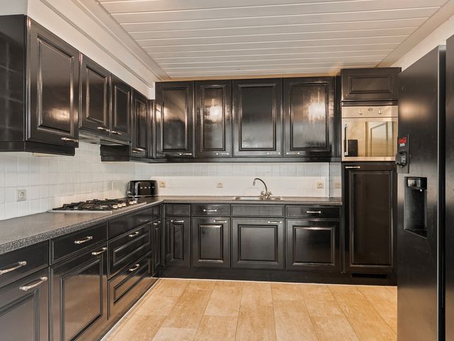 De half open keuken is gelegen aan de achterzijde van de woning en heeft een praktische indeling met veel opbergruimte door de onder- en bovenkasten, een werkblad met voldoende ruimte om te koken en bakken, en diverse inbouwapparatuur.