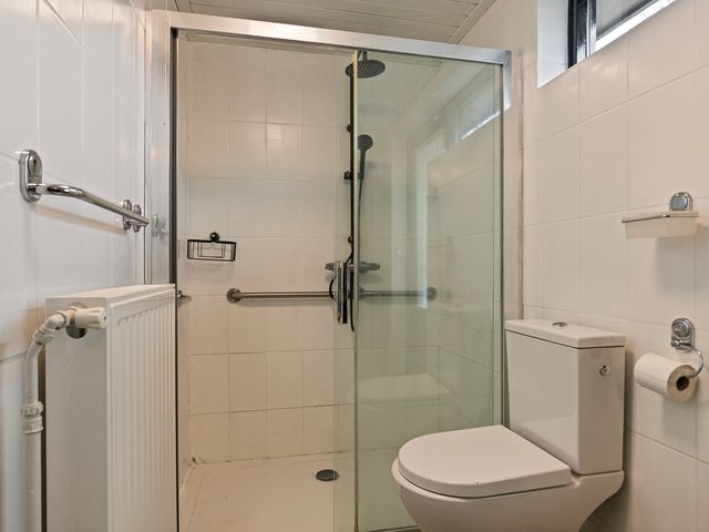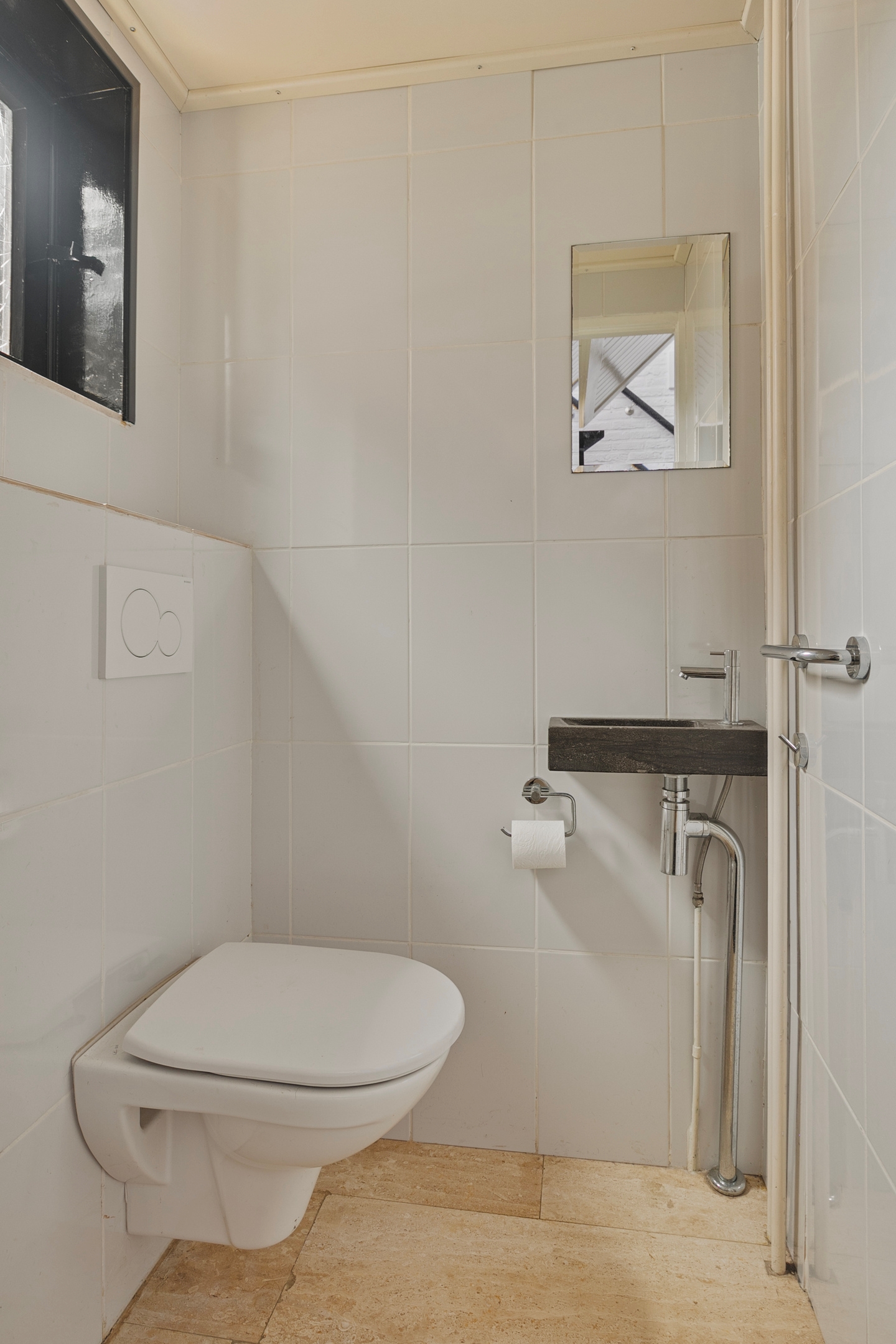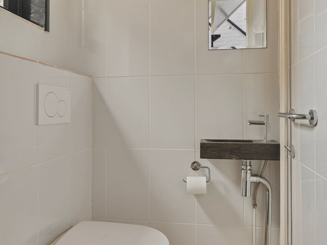 Het toilet is volledig betegeld en voorzien van een hangend toilet en fonteintje voor extra comfort.