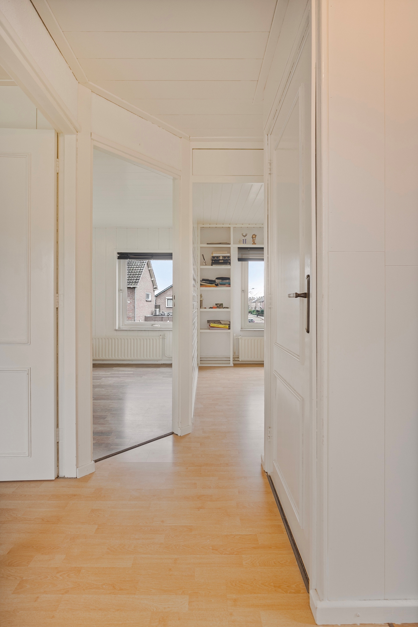De ruime overloop, afgewerkt met een nette laminaatvloer, biedt toegang tot alle kamers op deze verdieping en de trap naar zolder.