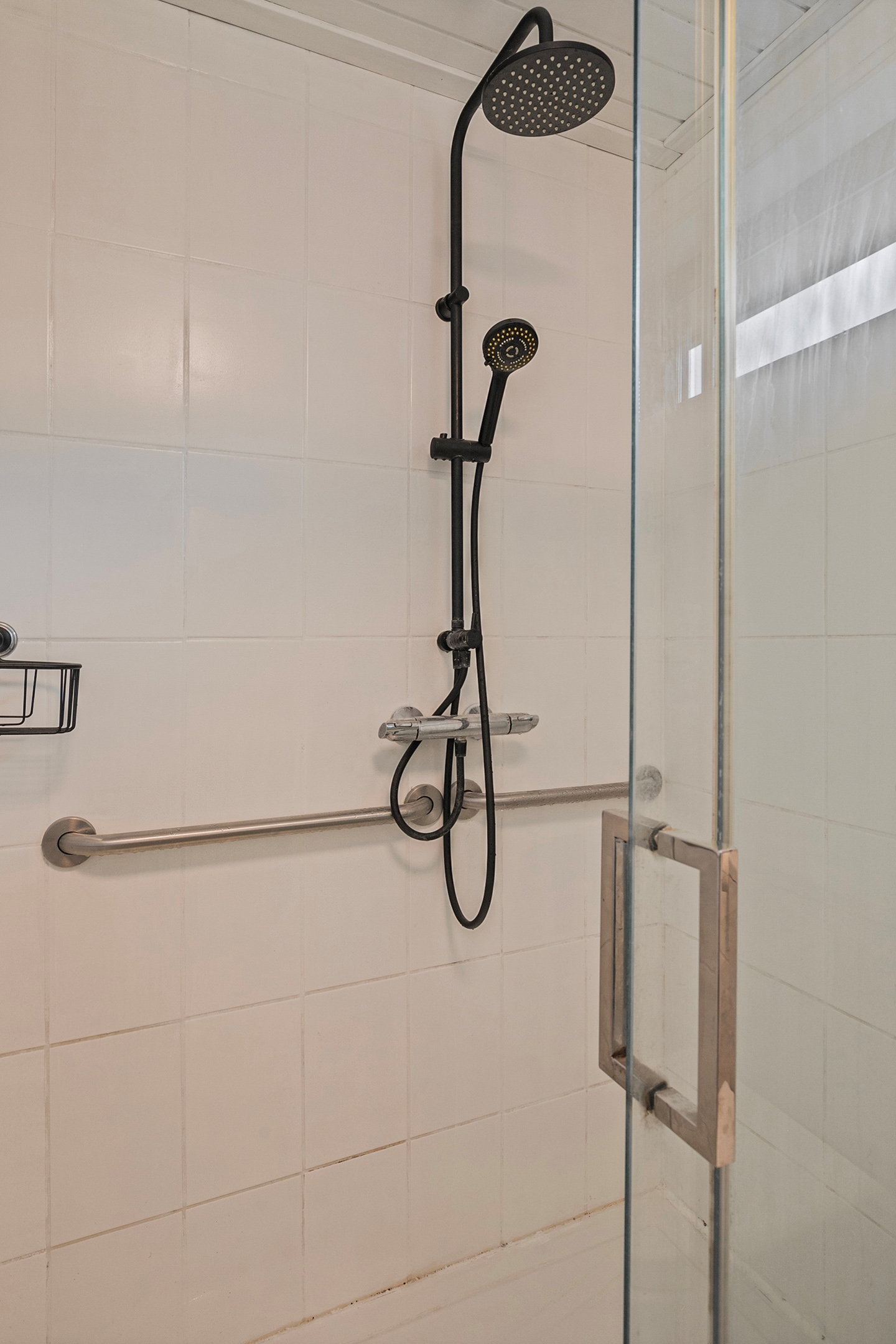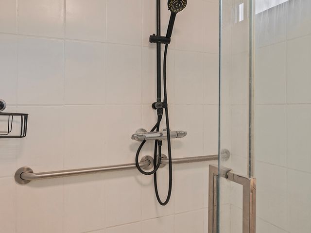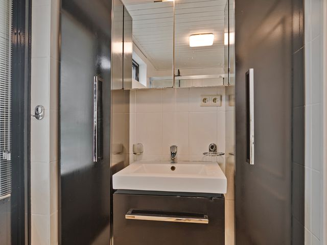 De badkamer op de eerste verdieping is geheel betegeld en voerzien van een douche met glazen wanden en regendouche, een zwevend toilet, en een wastafelmeubel.