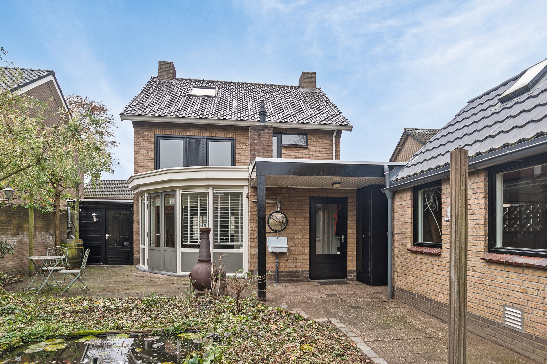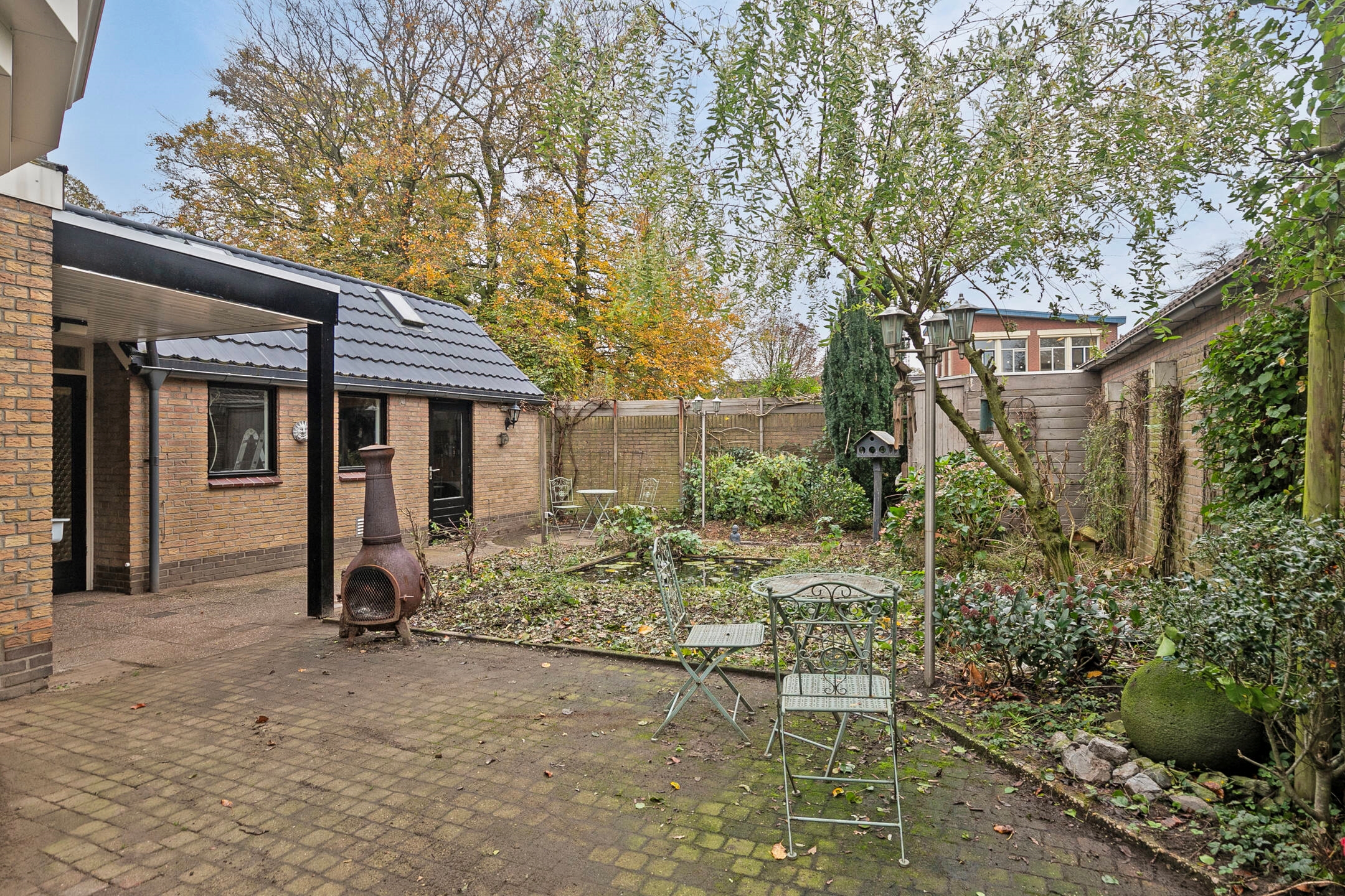 In de beschutte achtertuin ligt een mooie vijver en zijn er diverse zitjes gecreëerd waardoor u heerlijk kunt ontspannen en genieten van de groene omgeving.
