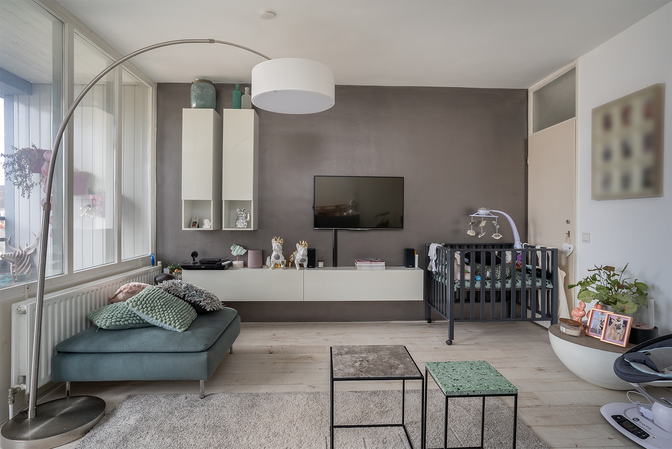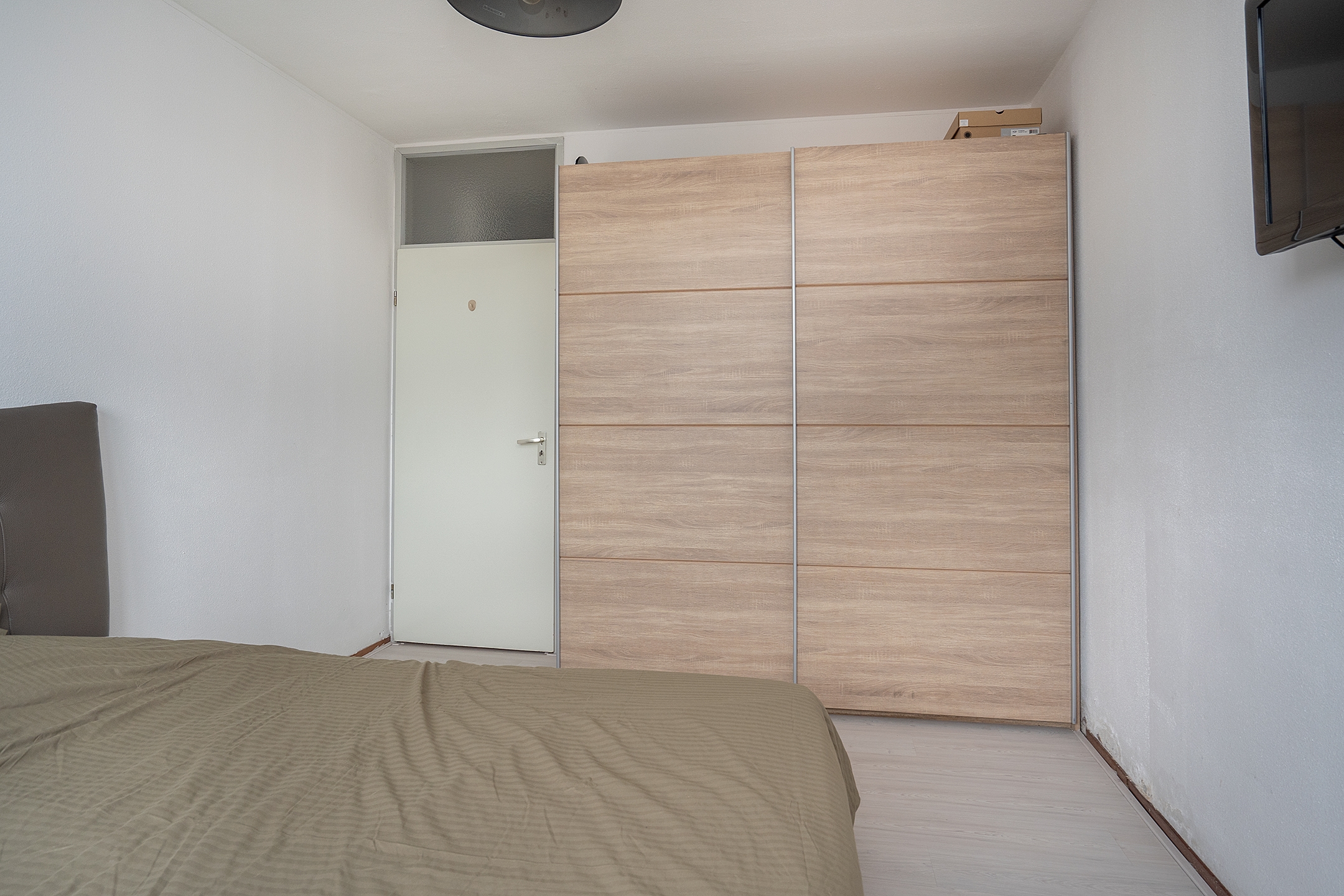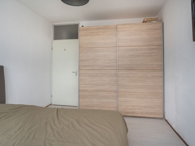 Wij waren verrast door de ruimte van de woonkamer. Deze woonkamer is een fijne lichte ruimte met twee praktische inbouwkasten en is afgewerkt met een laminaatvloer en de wanden zijn gestuct. Vanuit de woonkamer is er toegang tot het balkon aan de voorzijde van het appartement.