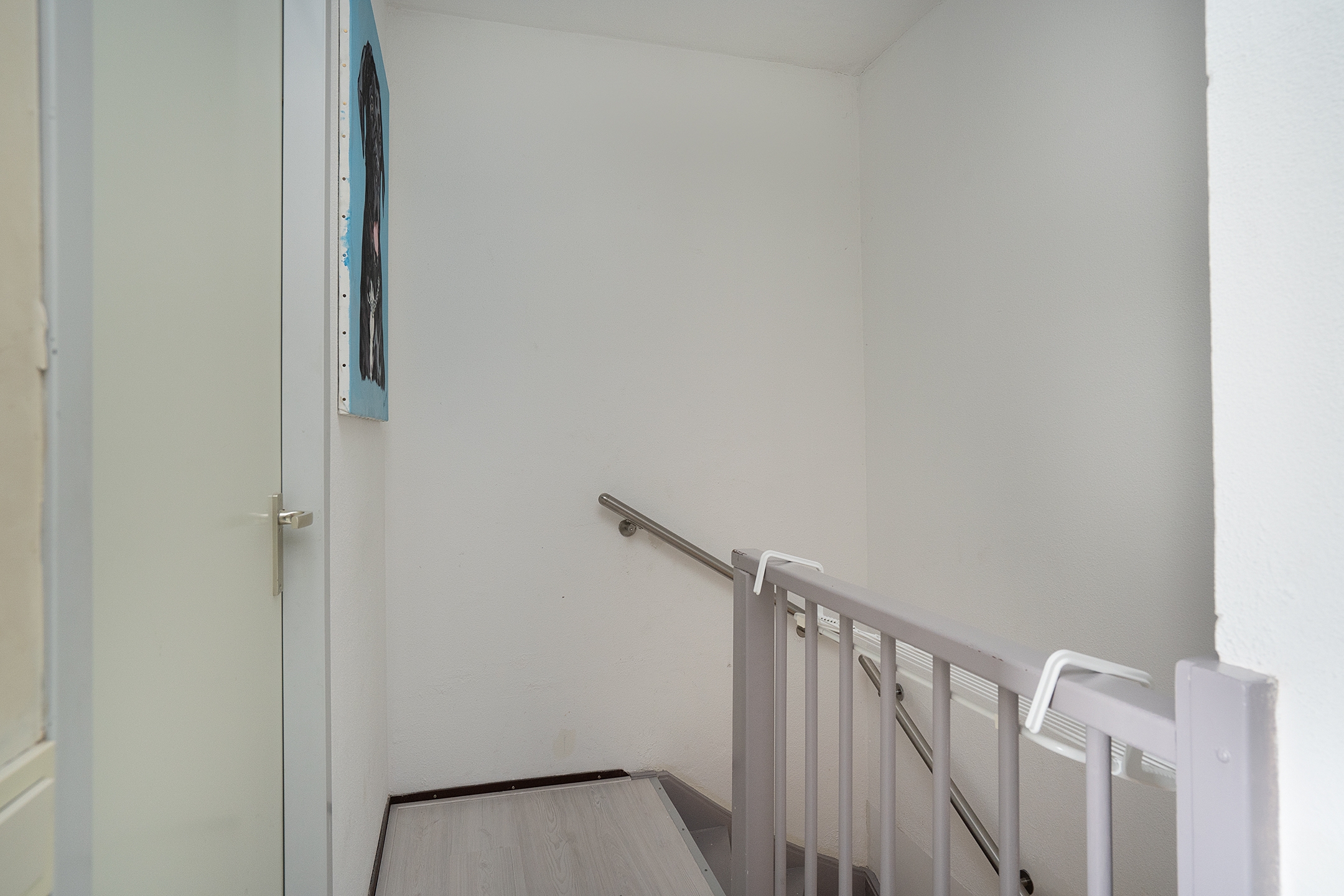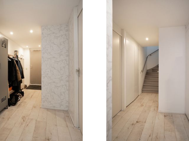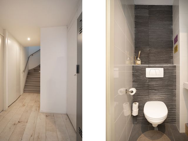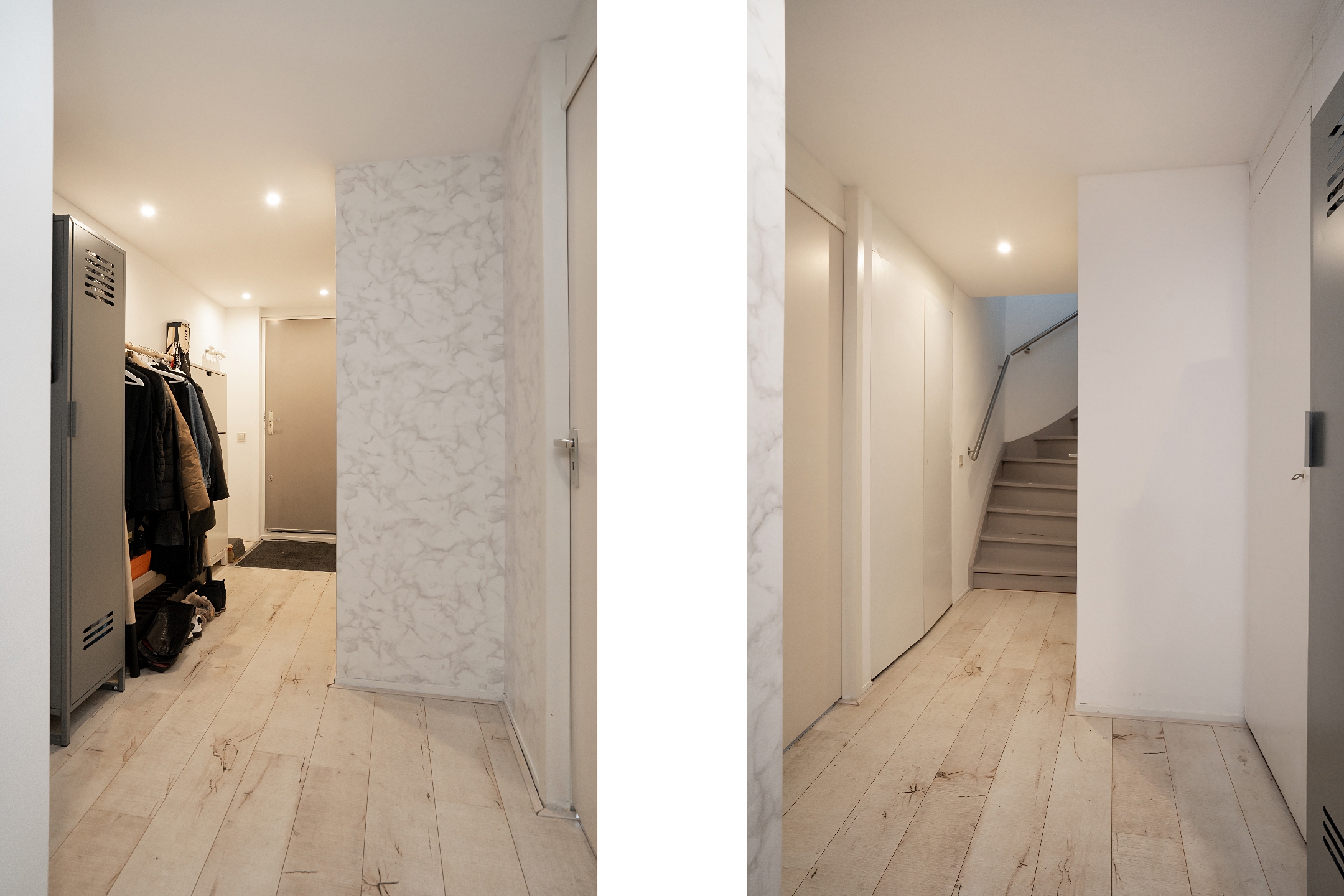 De entree/hal biedt toegang tot de woonkamer, het toilet, een ruimte met c.v.-ketel, de meterkast en de trapopgang naar de tweede woonlaag.