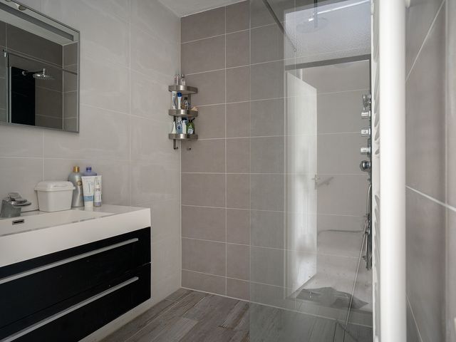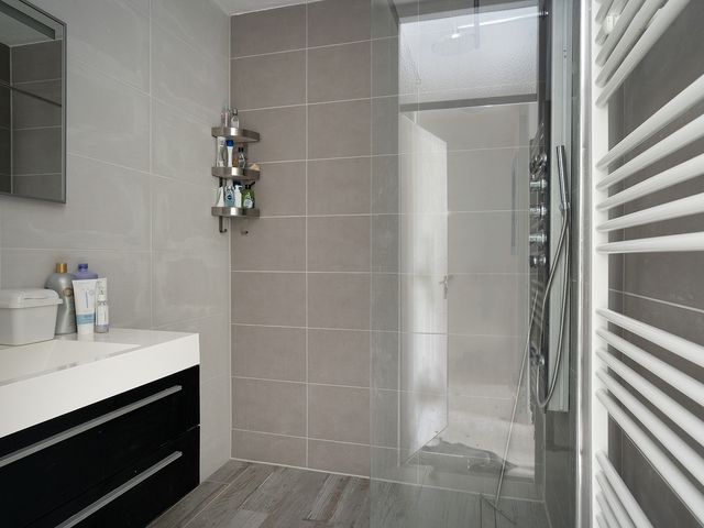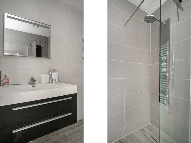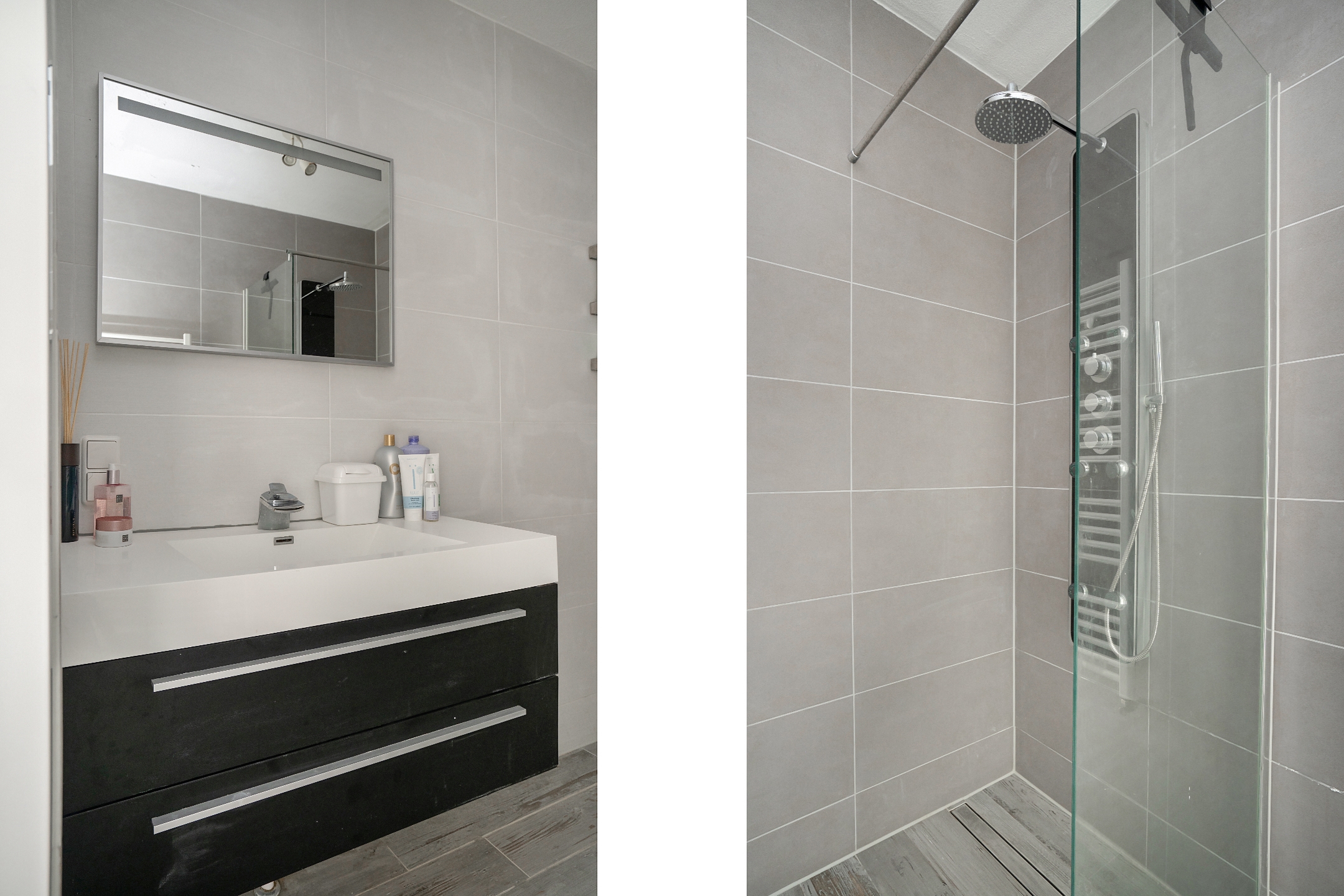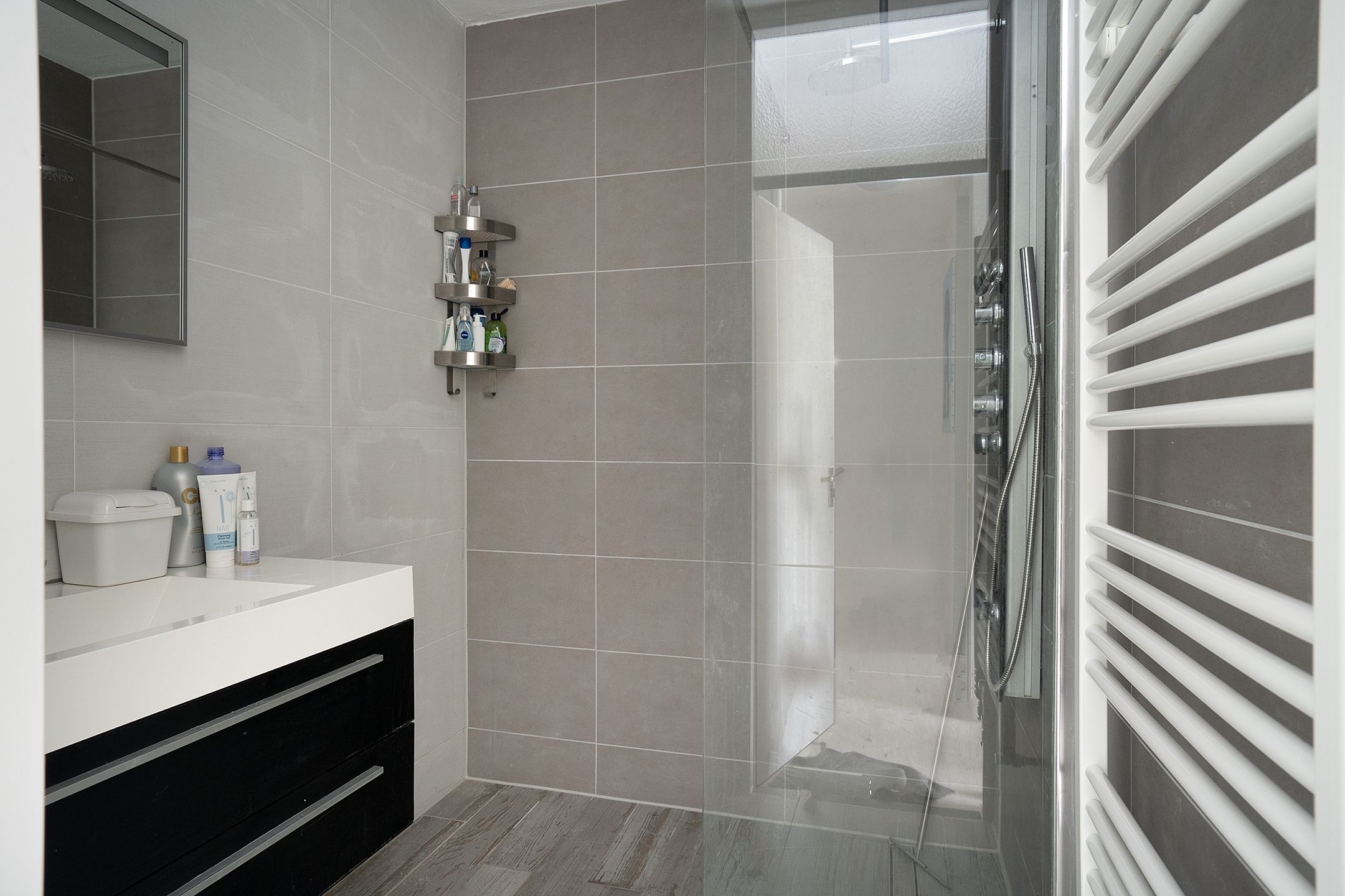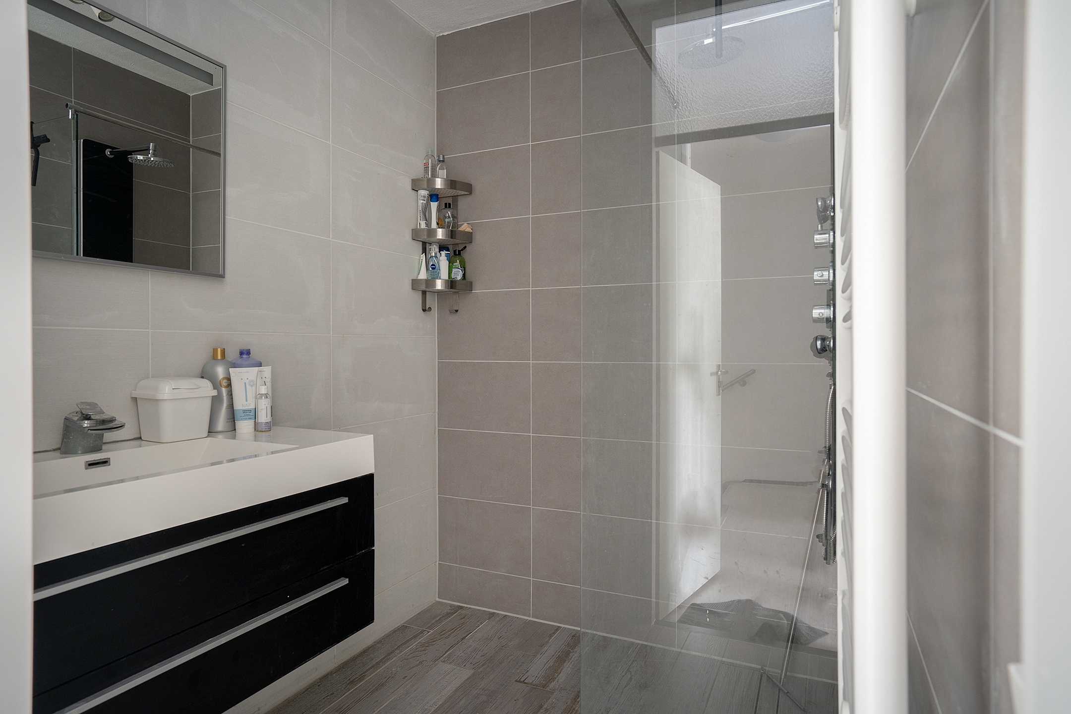 De badkamer is geheel betegeld en is voorzien van een inloopdouche met een douchepaneel met massage functie, een regendouche en een wastafel in een badkamermeubel.
