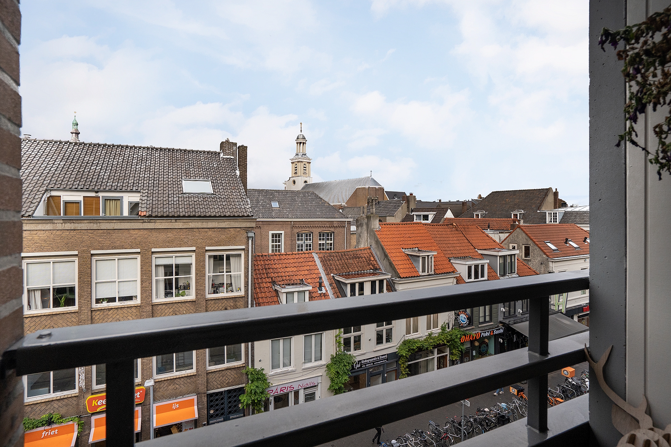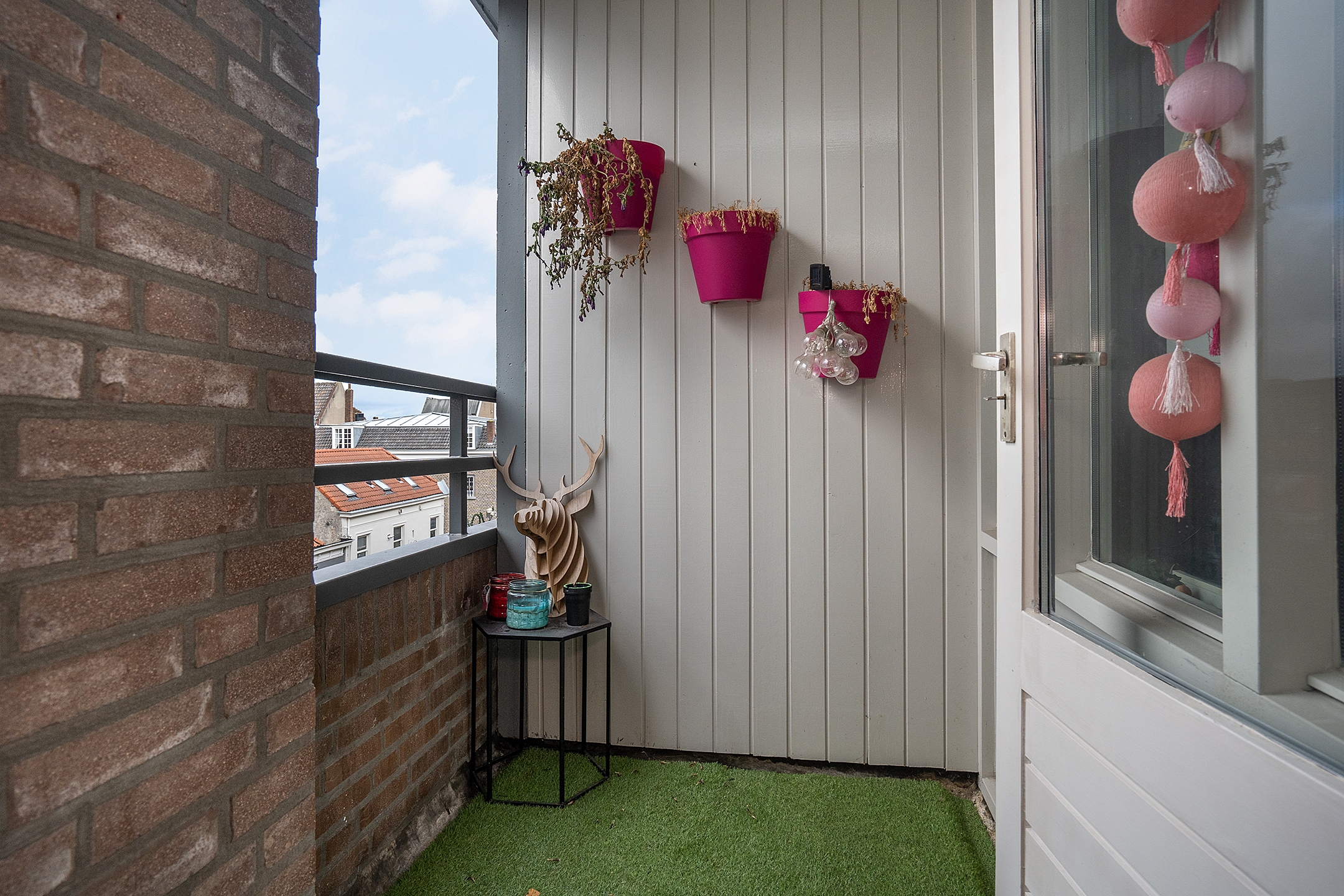 Op het balkon is het heerlijk vertoeven en kijk je uit op de levendigheid van de Karnemelkstraat.