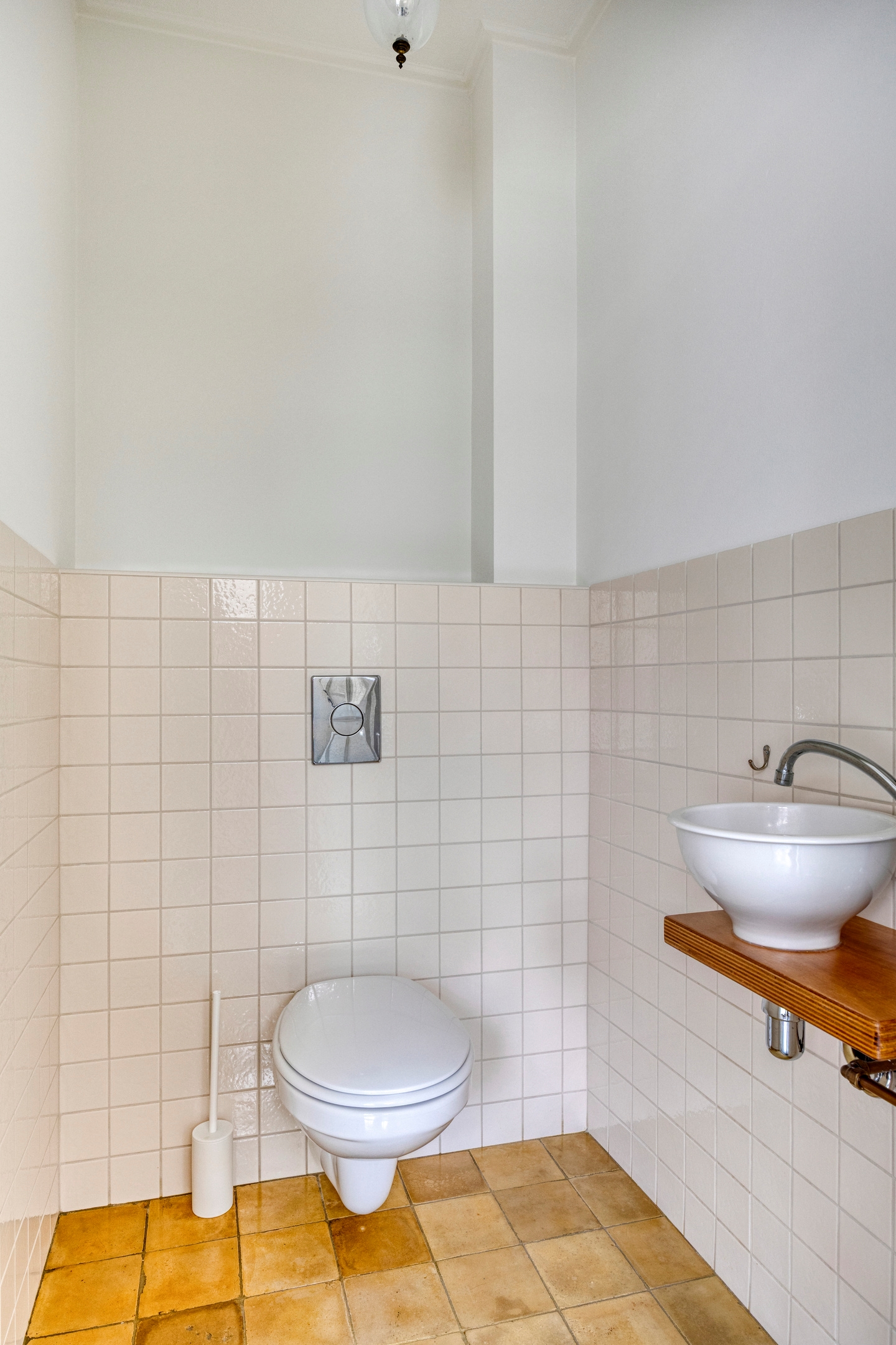 Via de voordeur betreedt u de sfeervolle/royale hal met een soort erker, een moderne meterkast en een garderobenis. Vanuit de royale hal zijn het vrijhangend toilet met waskom en de aantrekkelijke woonkamer (plafondhoogte ca. 2.82 m) te bereiken. De lichte woonkamer heeft een betonvloer, met een prachtige white wash houten delen vloer, een strakke gestucte platte plafondband, een sierhaard en openslaande tuindeuren.