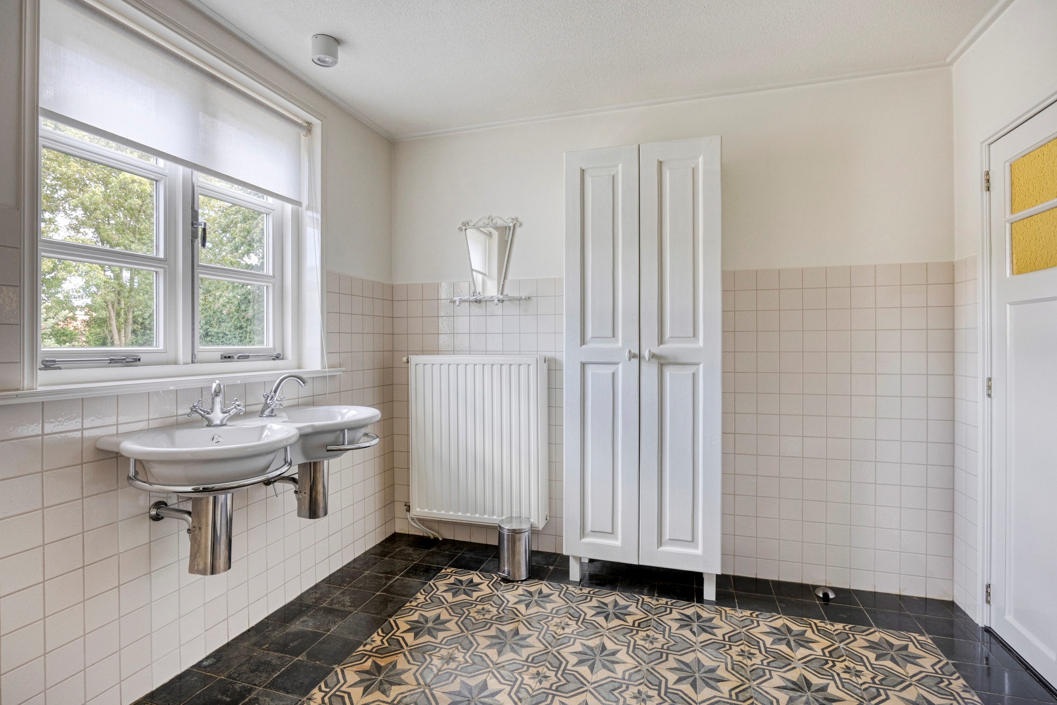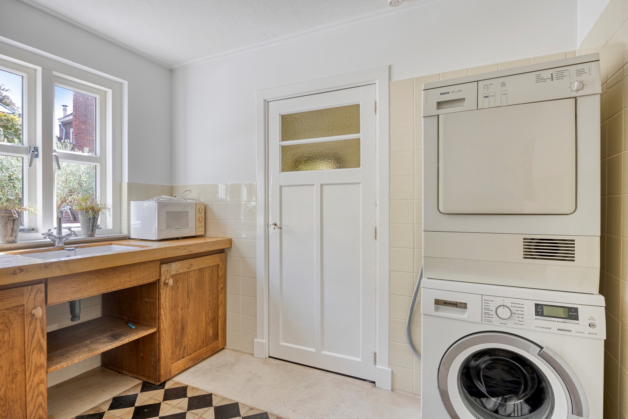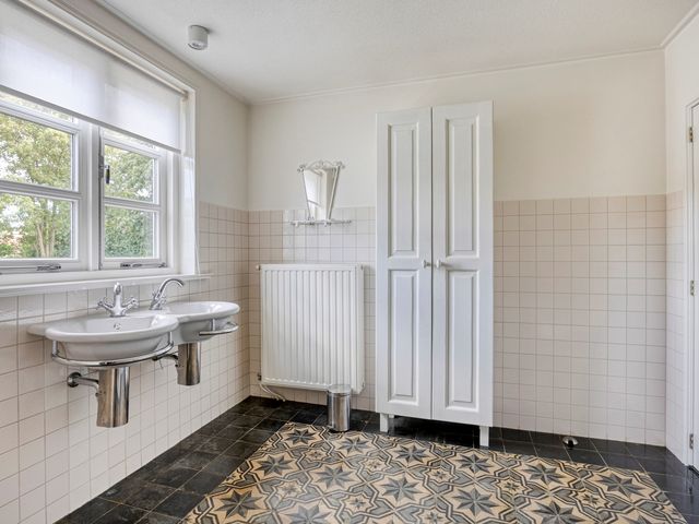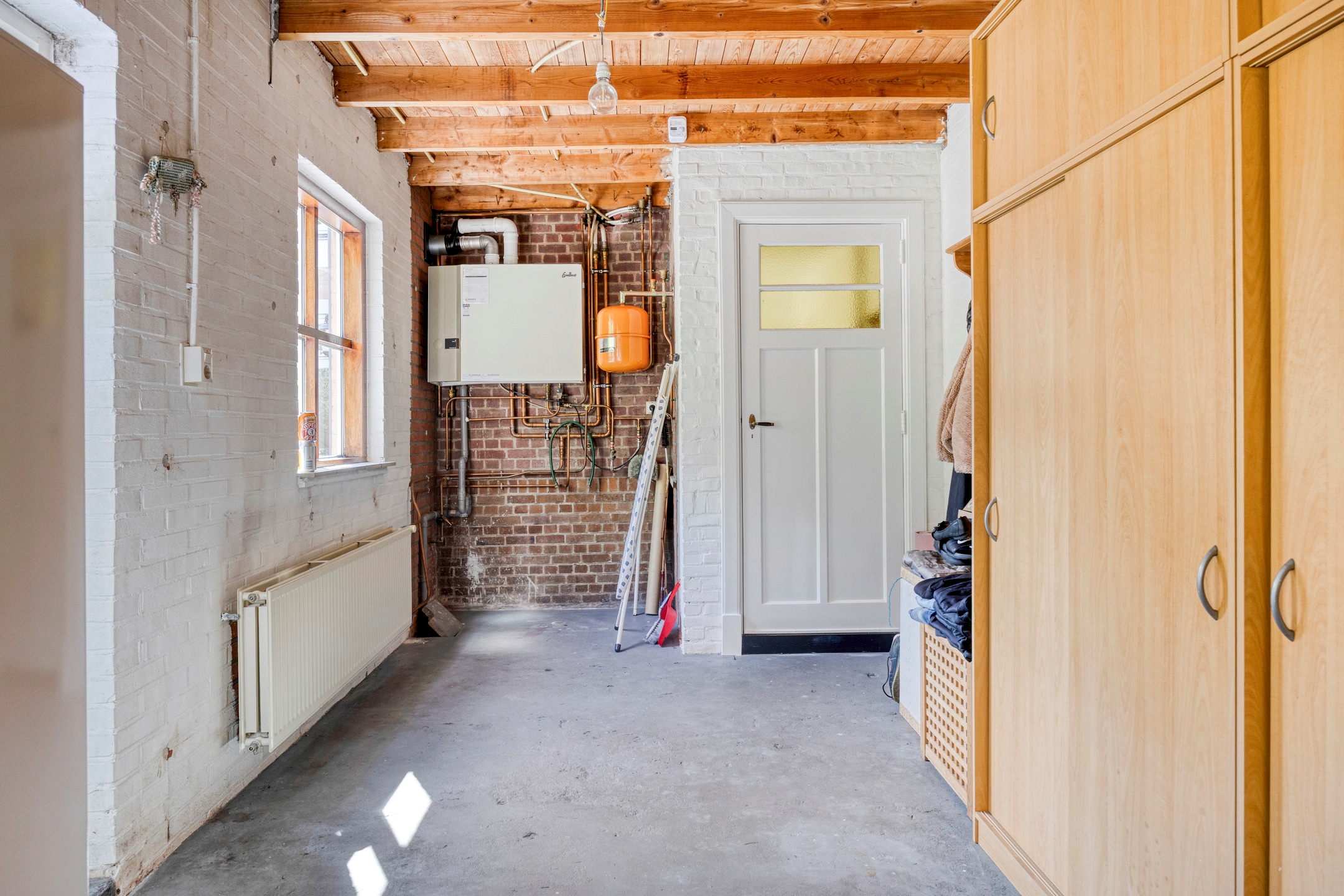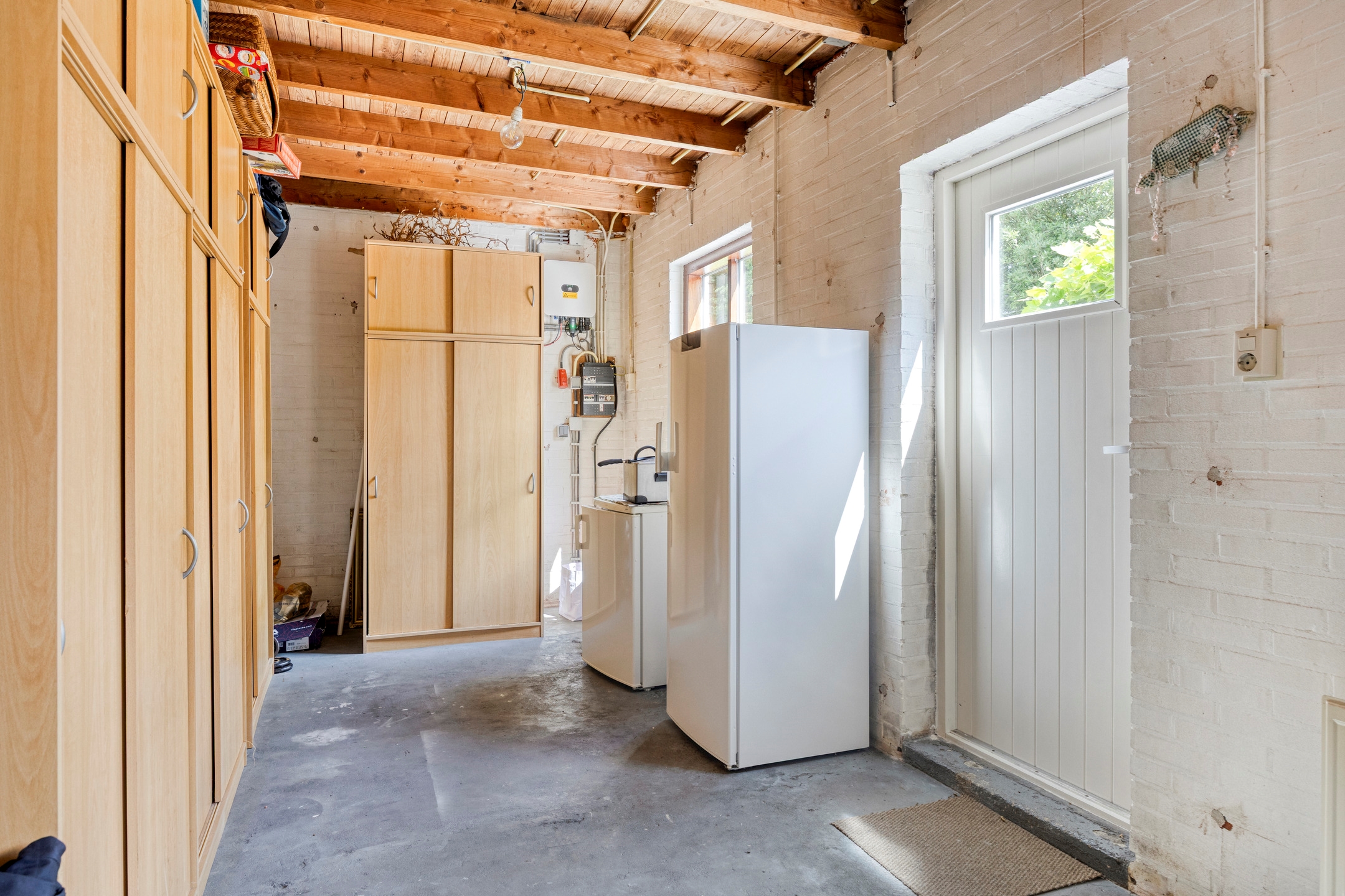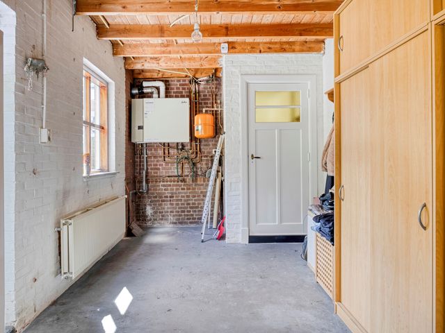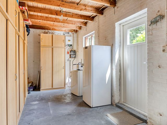 Via de keuken zijn de praktische kelder en de achter entree met een ingebouwde 2-deurs kast toegankelijk. De verrassende kelder met een klamp is geheel betegeld en heeft een vrijehoogte van ca. 1.35 m. Aansluitend komt u in de handige, L-vormige bijkeuken met een loopdeur naar de achtertuin, een pantry met een eiken aanrechtblad en een spoelbak. Verder treft u aan de was & drogeraansluiting. Middels een verbindingsdeur is de multifunctionele hobbyruimte met een loopdeur naar de achtertuin en de Nefit c.v.-combi-ketel te bereiken. Deze ruimte (vrije plafondhoogte ca. 2.55 m) is ook eenvoudig te verbouwen tot een slaapkamer met een semi-open badkamer of als een werkkamer, een hobbykamer etc.