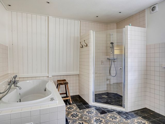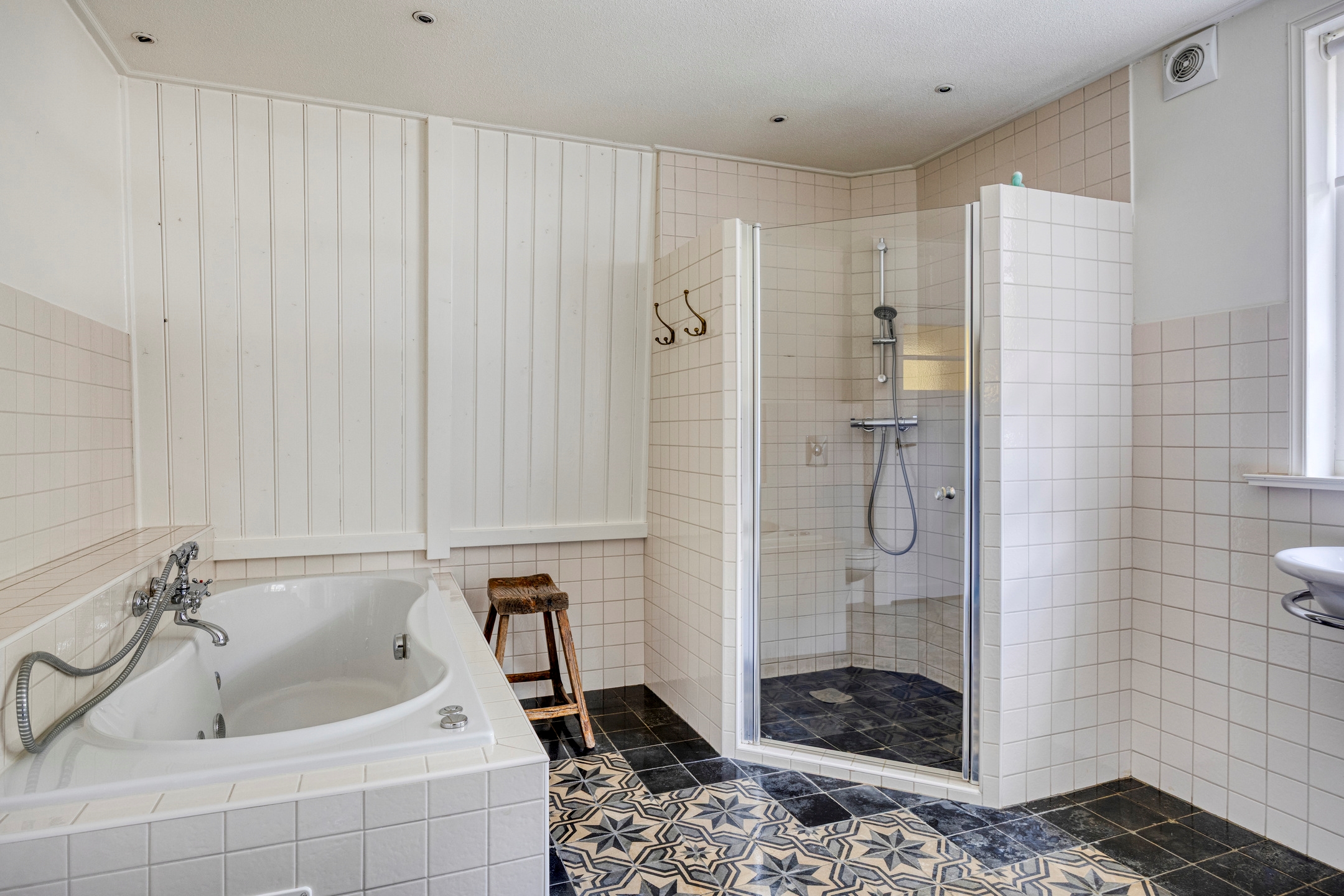 De badkamer met een achtergevelraam, heeft een schitterende /authentieke methafoor tegelvloer, inbouwspotjes, is o.a. voorzien van een dubbele wastafel, een whirlpoolbad, een inloopdouche met gehard glas & een thermostaat kraan en een vrijhangend toilet.