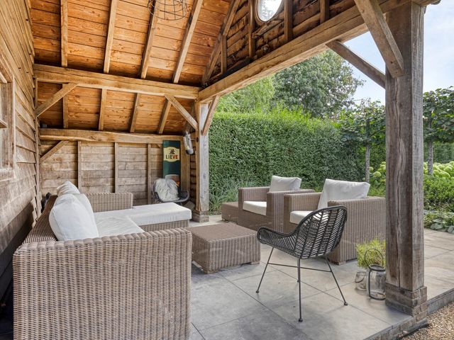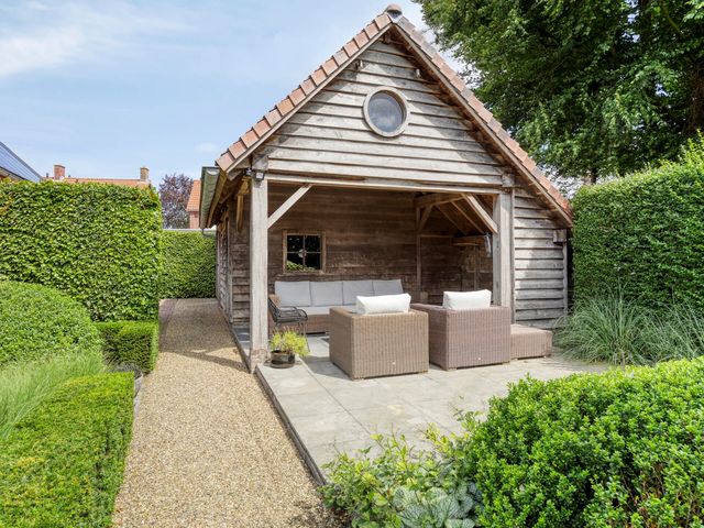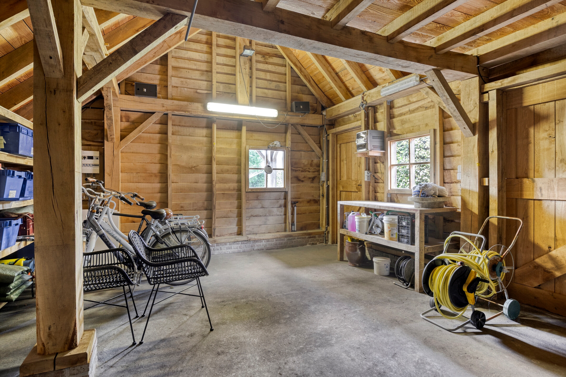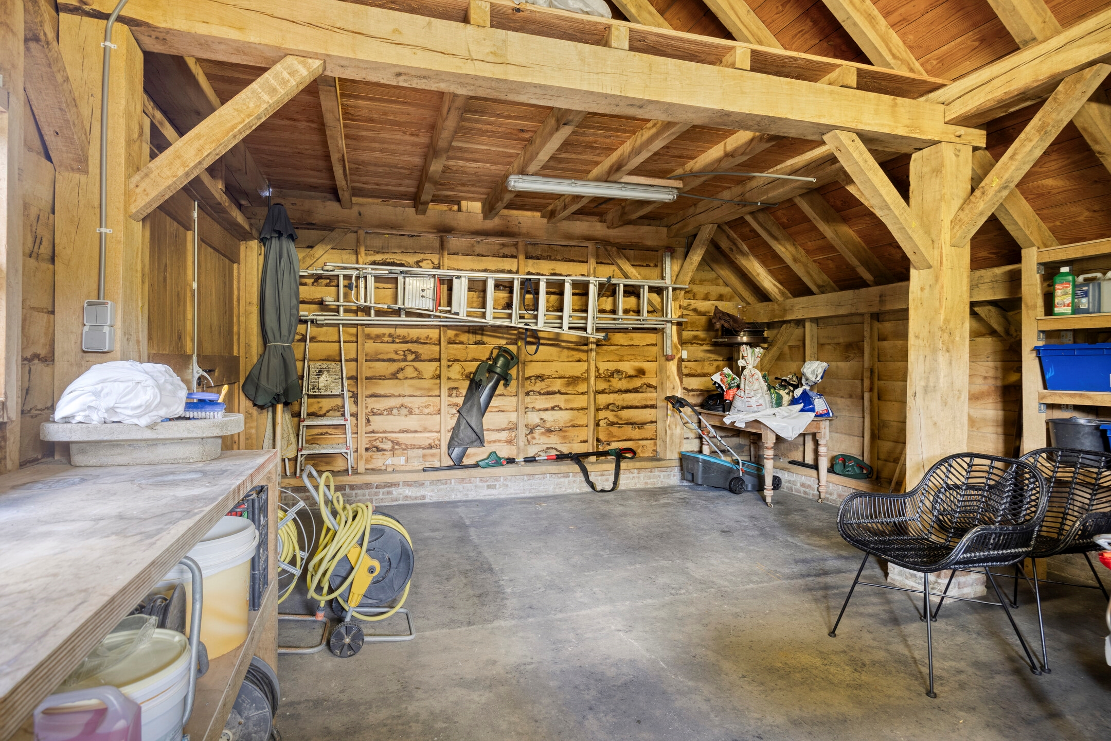 Achter in de tuin staat een schitterend, multifunctioneel, gepotdekselde vrijstaande garage annex hobbyruimte, ca. 5.00x6.11 m, met een nokhoogte van ca. 4.36 m, een entresol en elektra. De vloer is van beton. Aangebouwd treft u de stoere tuinkamer, ca. 2.83x5.07 m aan, met een nokhoogte van ca. 4.35 m, een fraaie hardstenen terras en een aangrenzend parkeerterreintje. Dit parkeerterreintje is afsluitbaar middels een smeedijzeren poort.