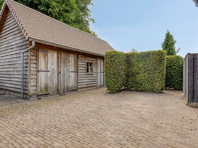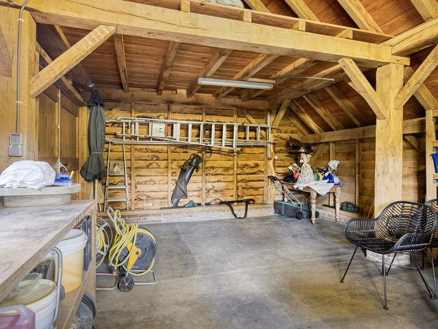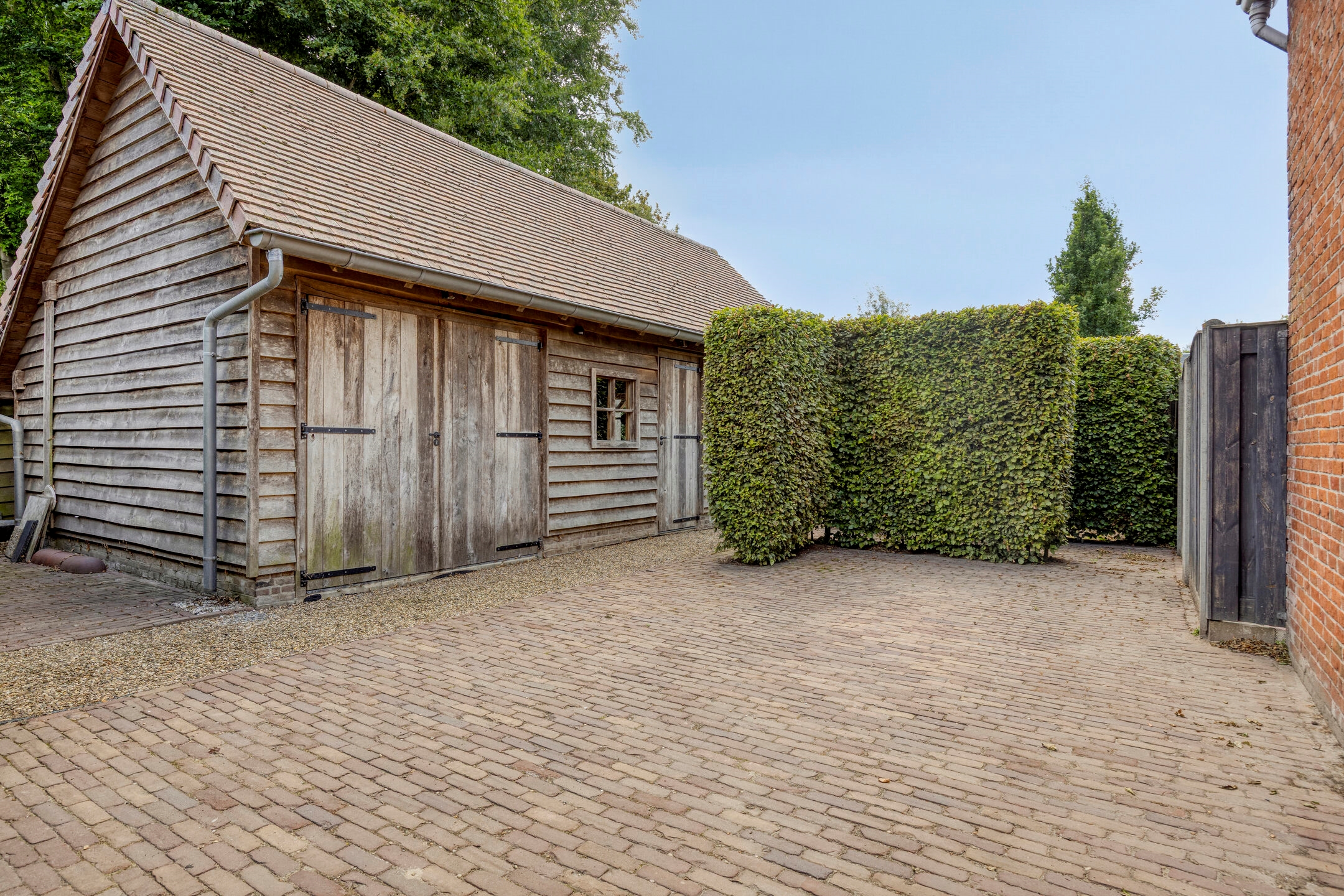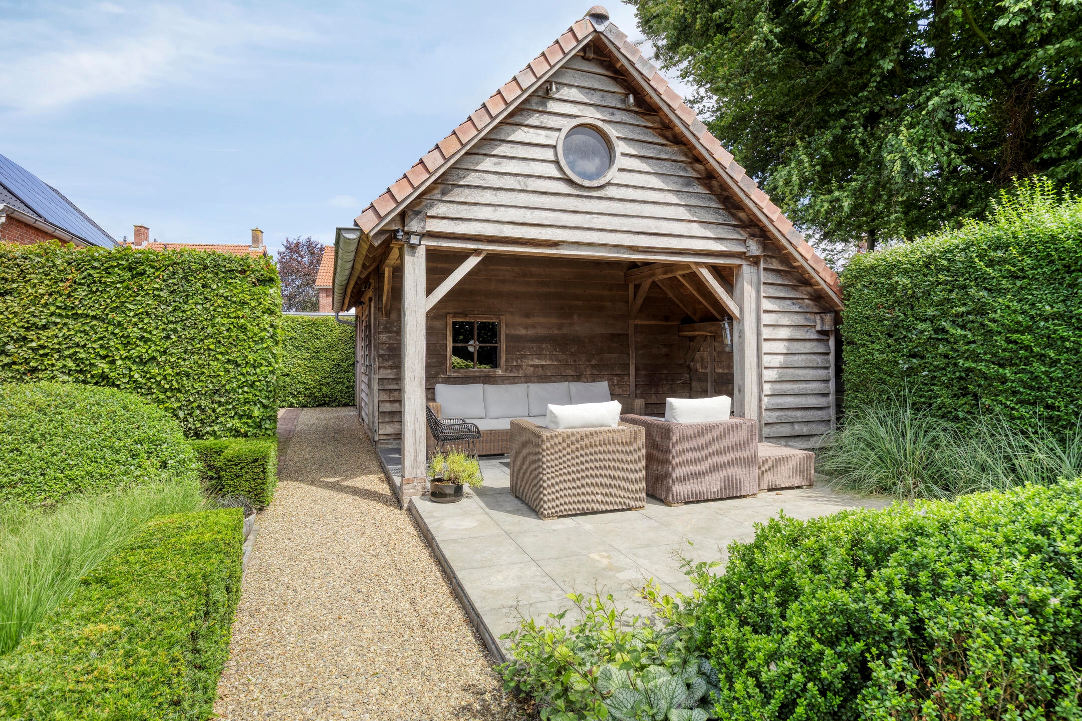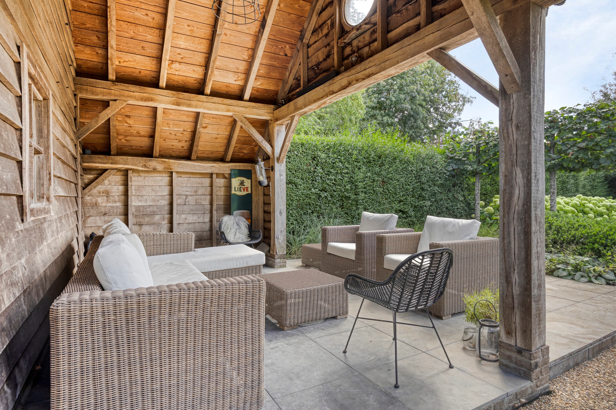 Achter in de tuin staat een schitterend, multifunctioneel, gepotdekselde vrijstaande garage annex hobbyruimte, ca. 5.00x6.11 m, met een nokhoogte van ca. 4.36 m, een entresol en elektra. De vloer is van beton. Aangebouwd treft u de stoere tuinkamer, ca. 2.83x5.07 m aan, met een nokhoogte van ca. 4.35 m, een fraaie hardstenen terras en een aangrenzend parkeerterreintje. Dit parkeerterreintje is afsluitbaar middels een smeedijzeren poort.