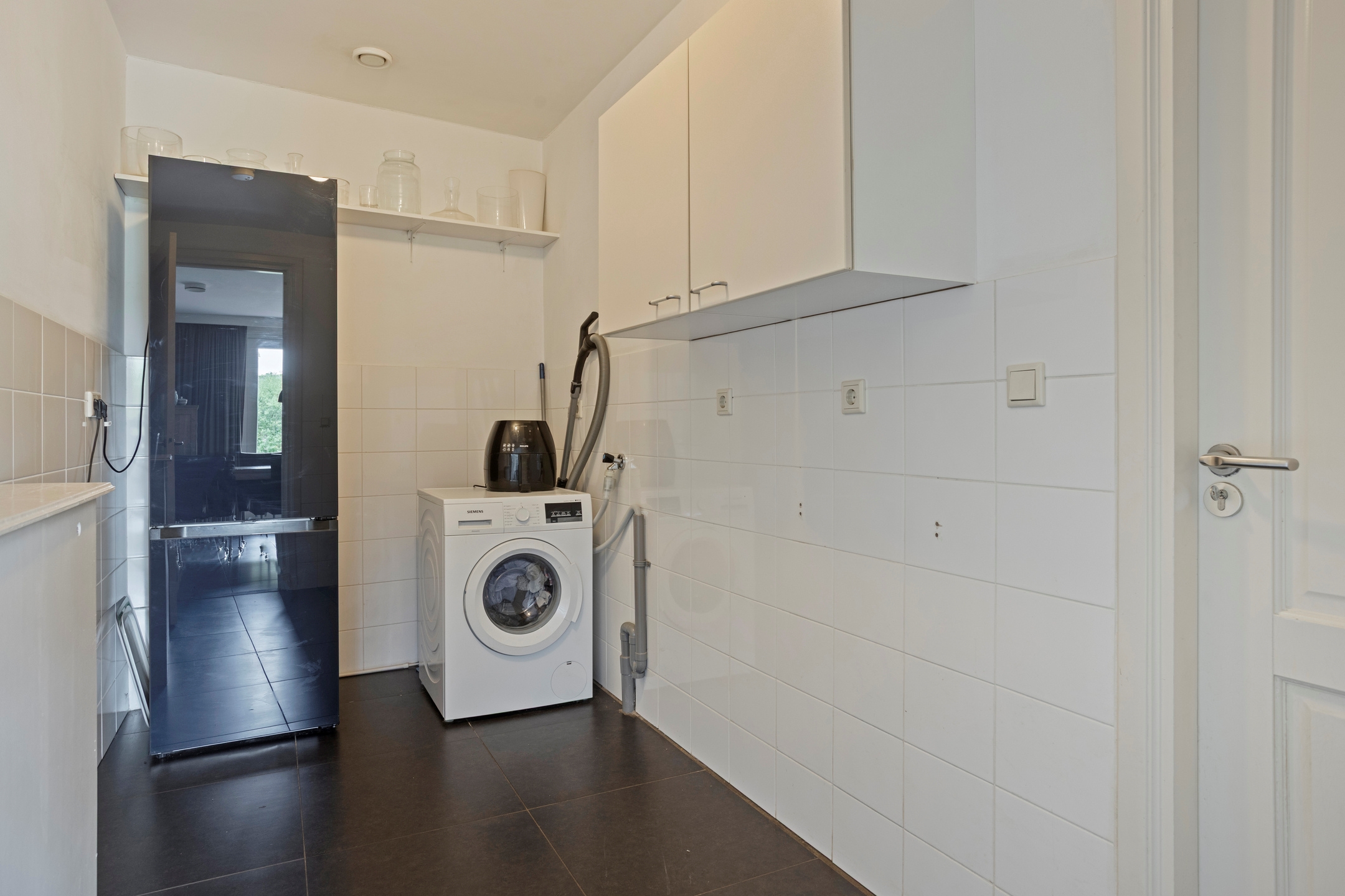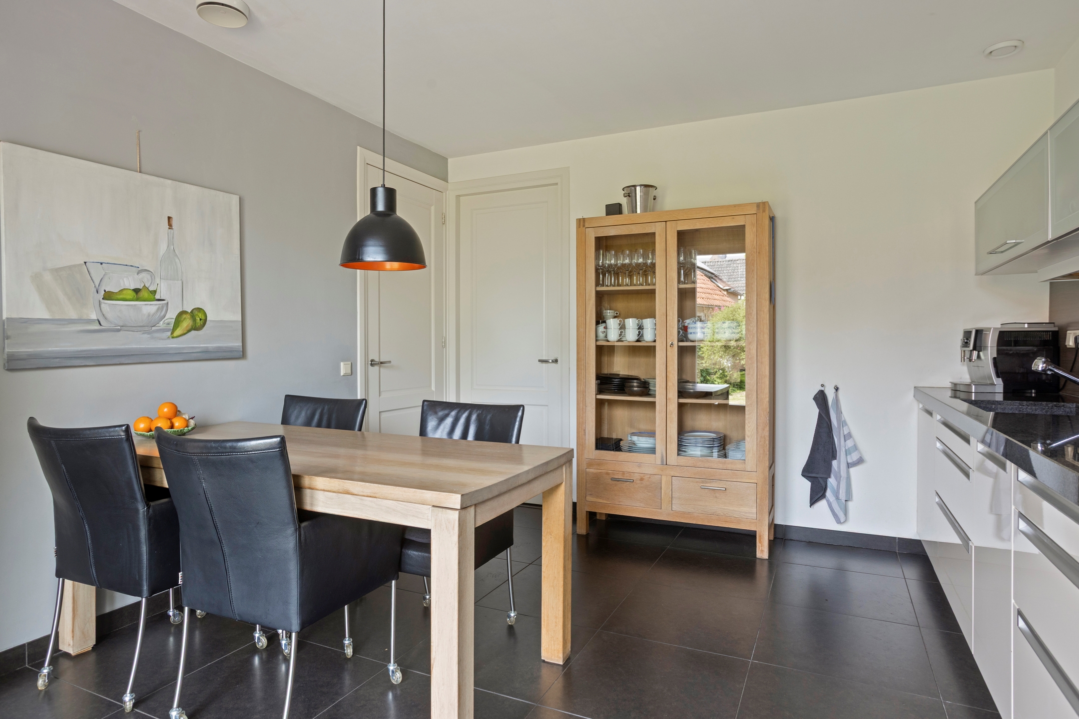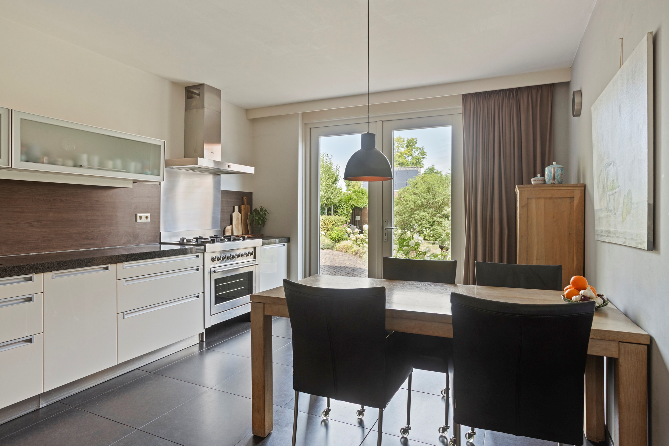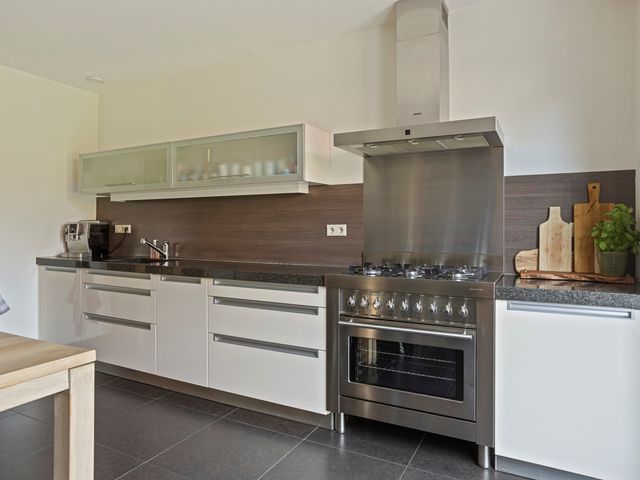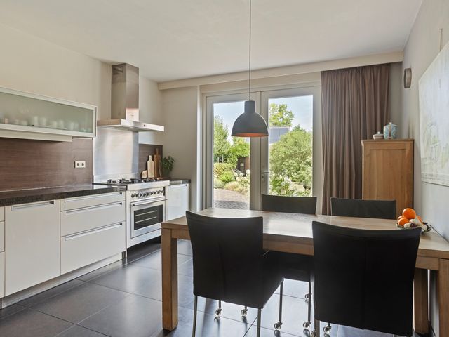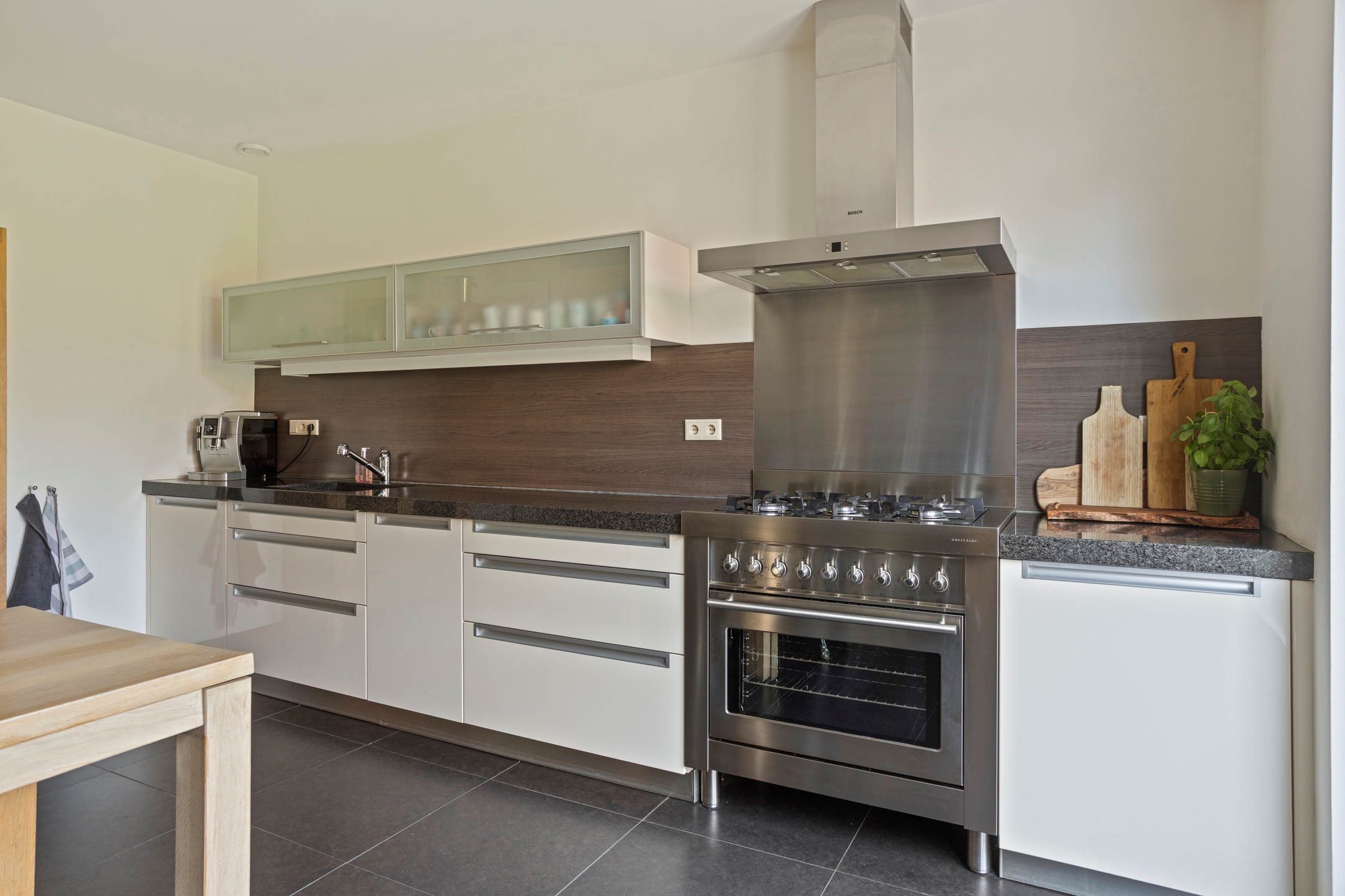 Deze toffe leefkeuken heeft o.a. openslaande tuindeuren naar de tuin en een verbindingsdeur naar de praktische bijkeuken. De nette inbouwkeuken heeft een duurzaam granieten aanrechtblad, is uitgerust met o.a. een rvs design afzuigkap, een stoer rvs kookfornuis (Solitaire) met 5 gaspitten, 1 wokbrander & een brede oven. Verder treft u aan een koelkast, een diepvriezer en een vaatwasmachine.