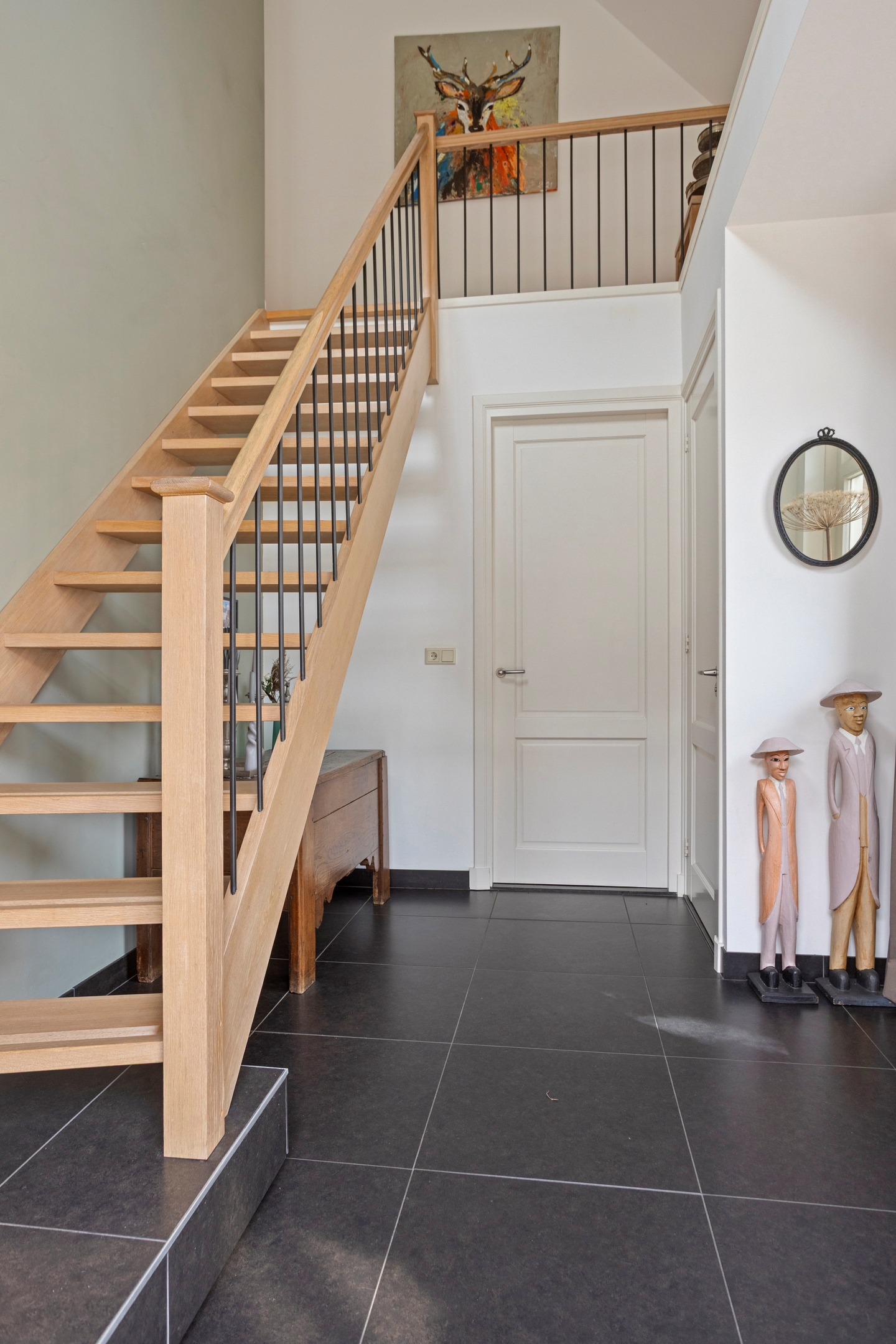 Door de goed geplaatste raampartijen komt er veel natuurlijk daglicht binnen. Dit geldt overigens voor de gehele woning. De betonvloer is overwegend afgewerkt met een moderne plavuizenvloer, met uitzondering van de living, want daar ligt een robuuste, massieve eikenhoutendelen vloer, de wanden als mede de plafonds zijn fijn gestuct. De binnendeuren zijn paneeldeuren.