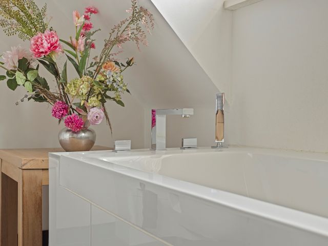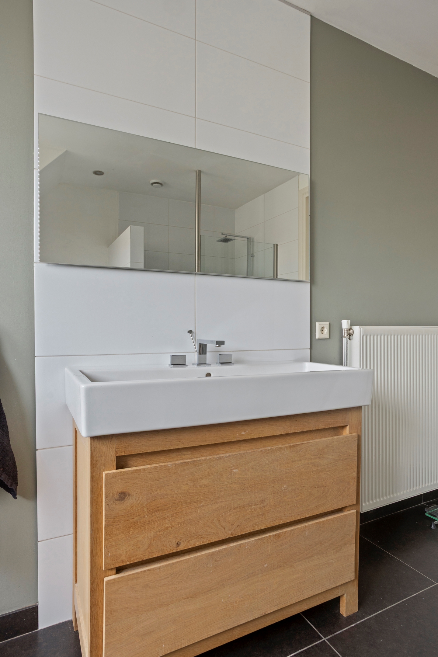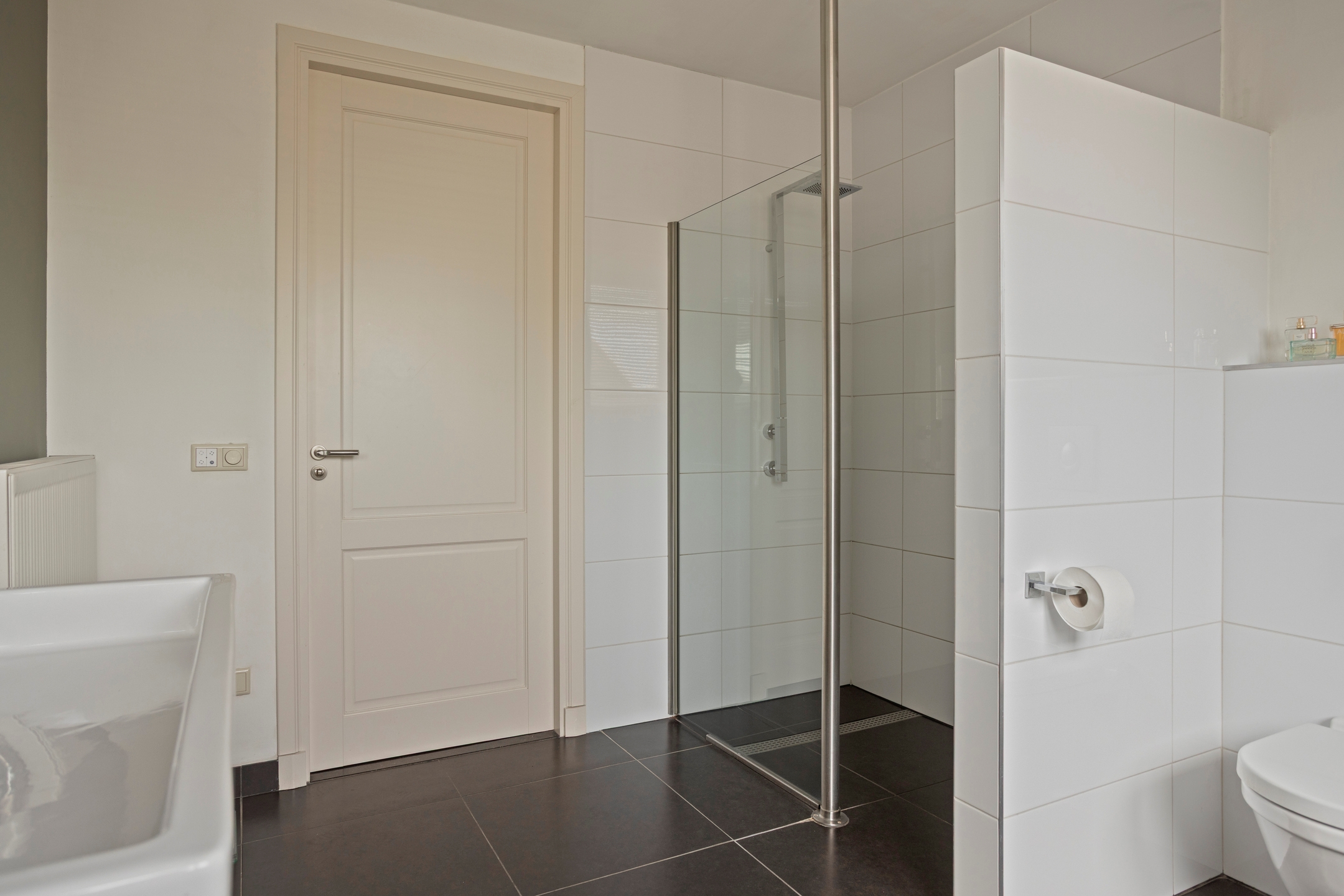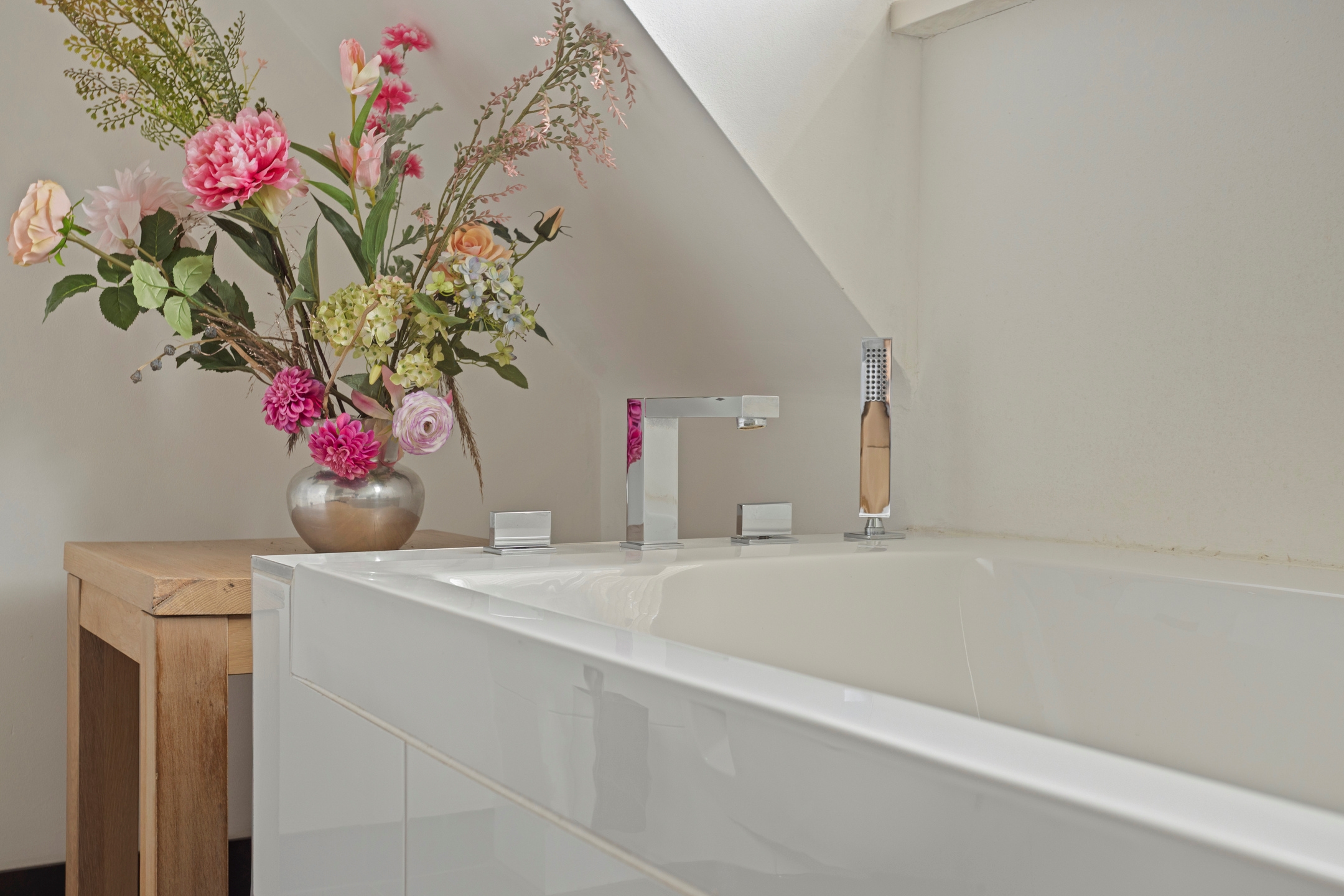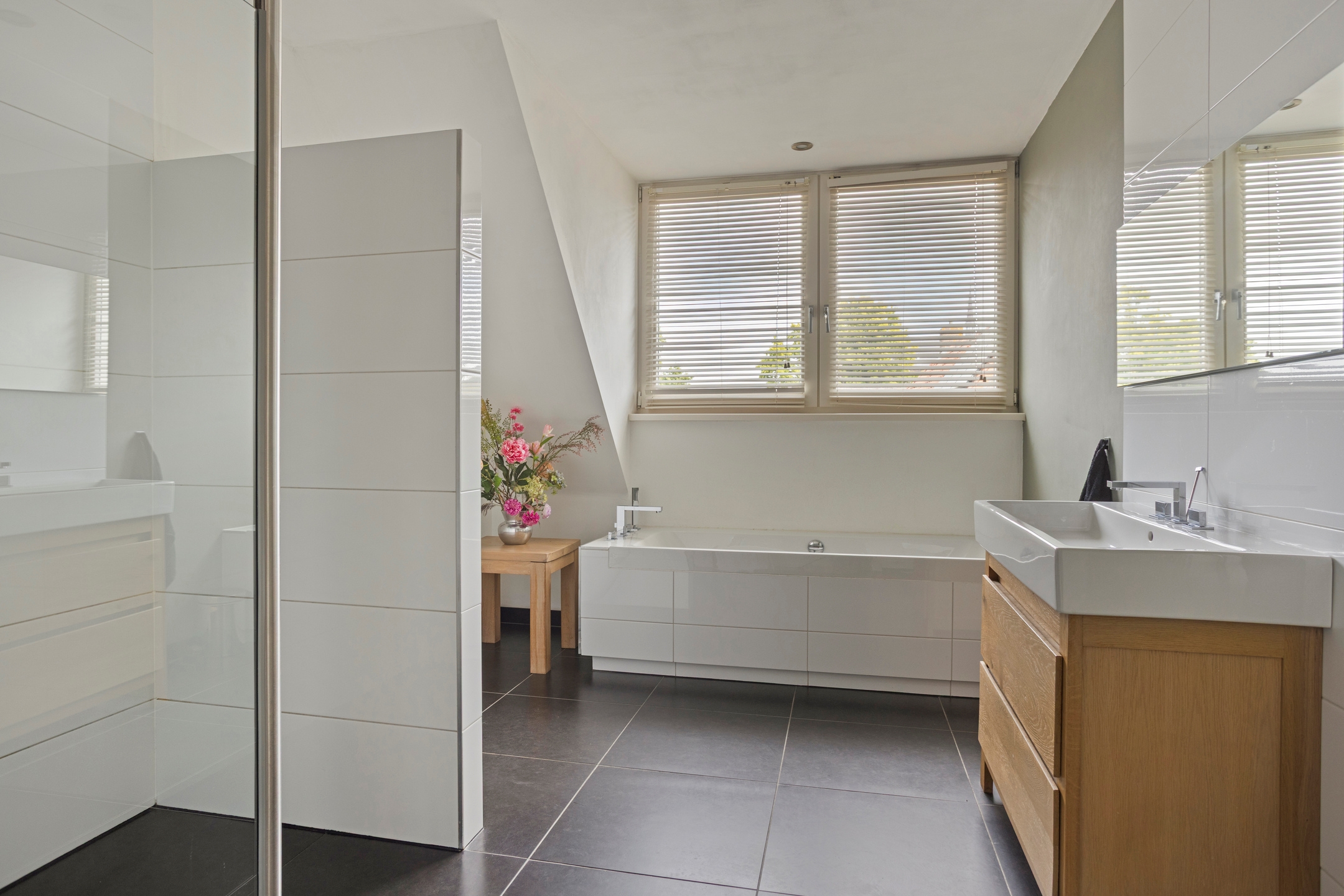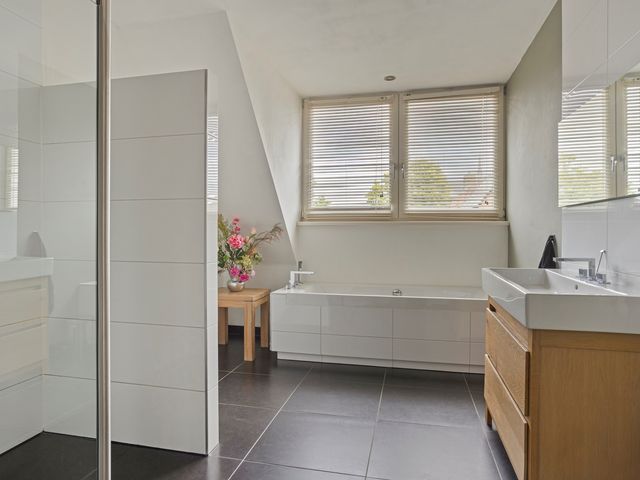 De verrassend ruime badkamer, ca, 2.88x3.87 m, heeft een forse dakkapel, is o.a. voorzien van een wastafelmeubel, een duo-ligbad, een handige inloopdouche en een vrijhangend toilet