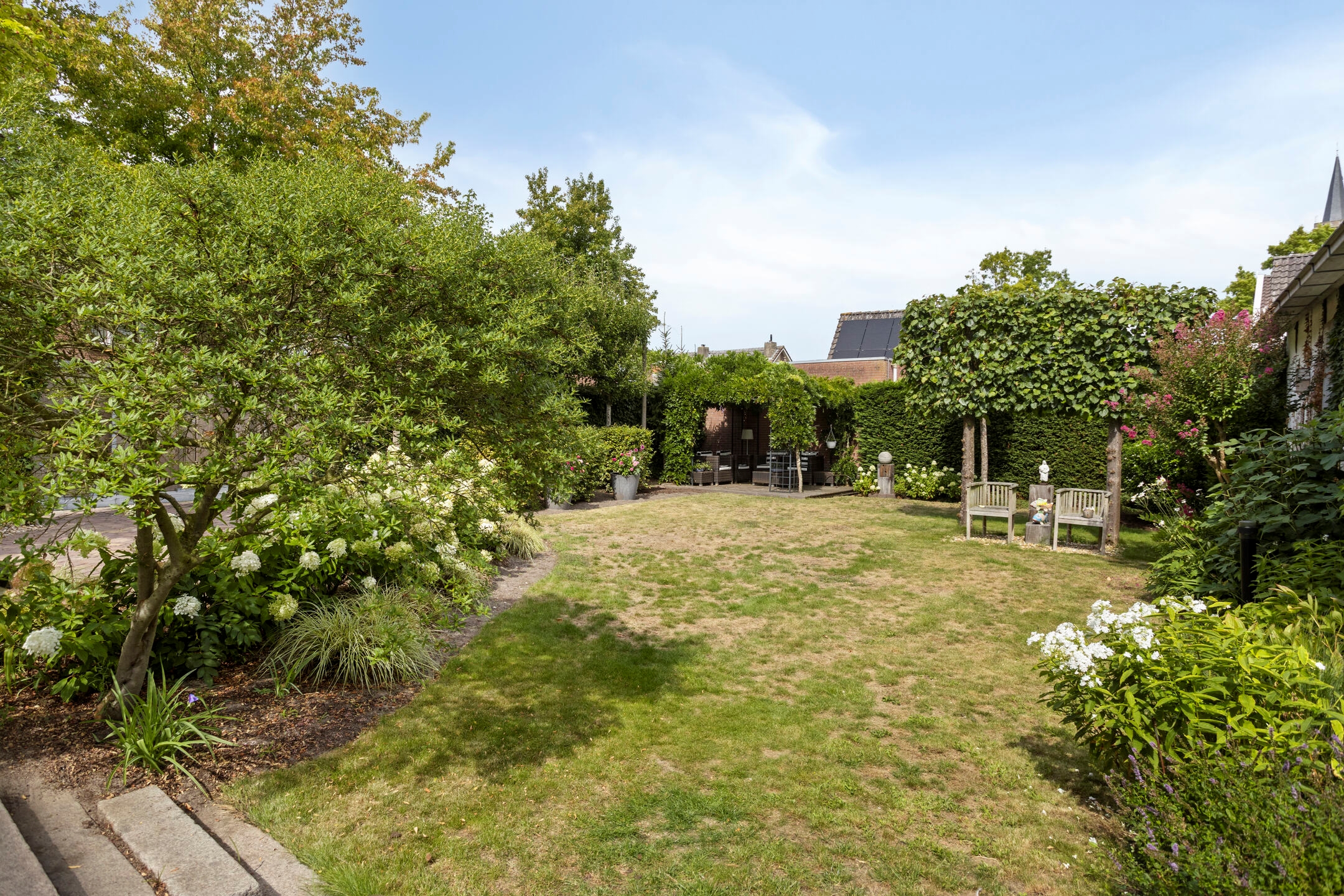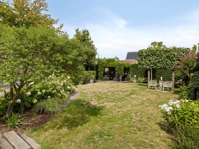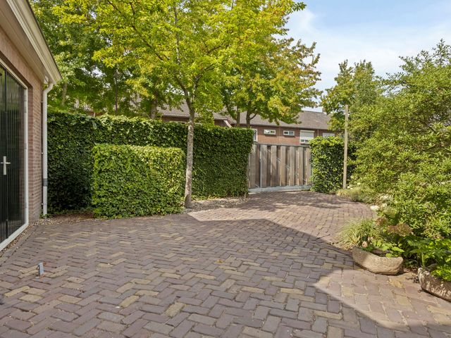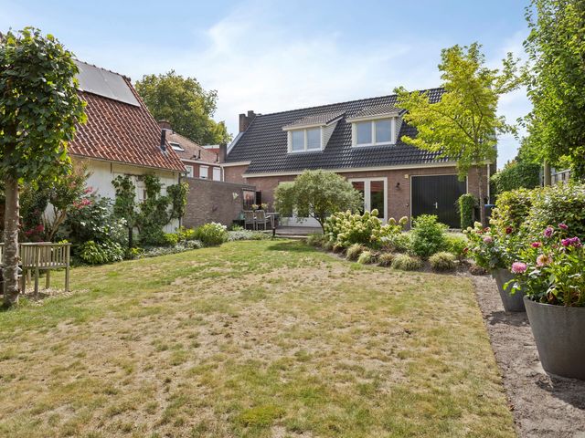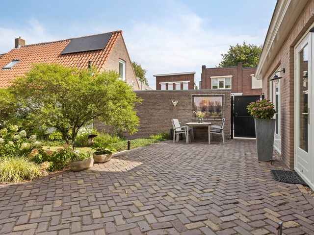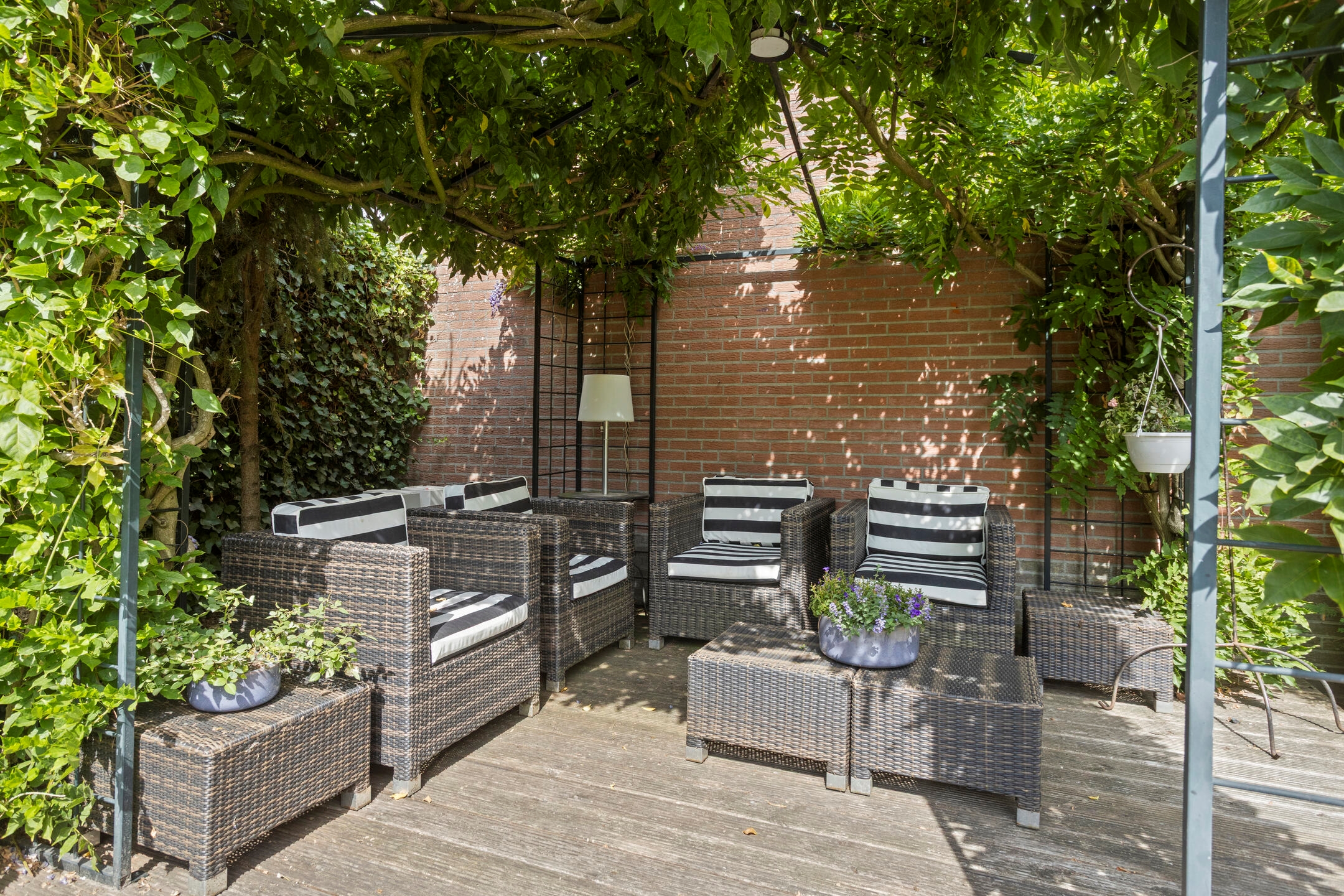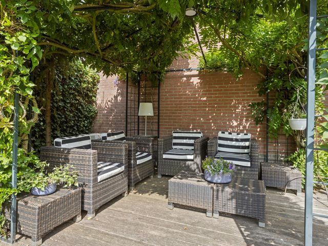Deze stadswoning heeft een royale, fraai aangelegde zijtuin met diverse tuinkamers, is werkelijk een plaatje. De tuin, ca. 19 m diep, is o.a. voorzien van klinkerbestrating/gazon en diverse vaste planten die ieder jaargetijde kleur geven aan de tuin. Het aangrenzende zonneterras, ca. 4.05x8.65 m, ligt aan de zijgevel en kijkt vrij uit op o.a. de Kerk.