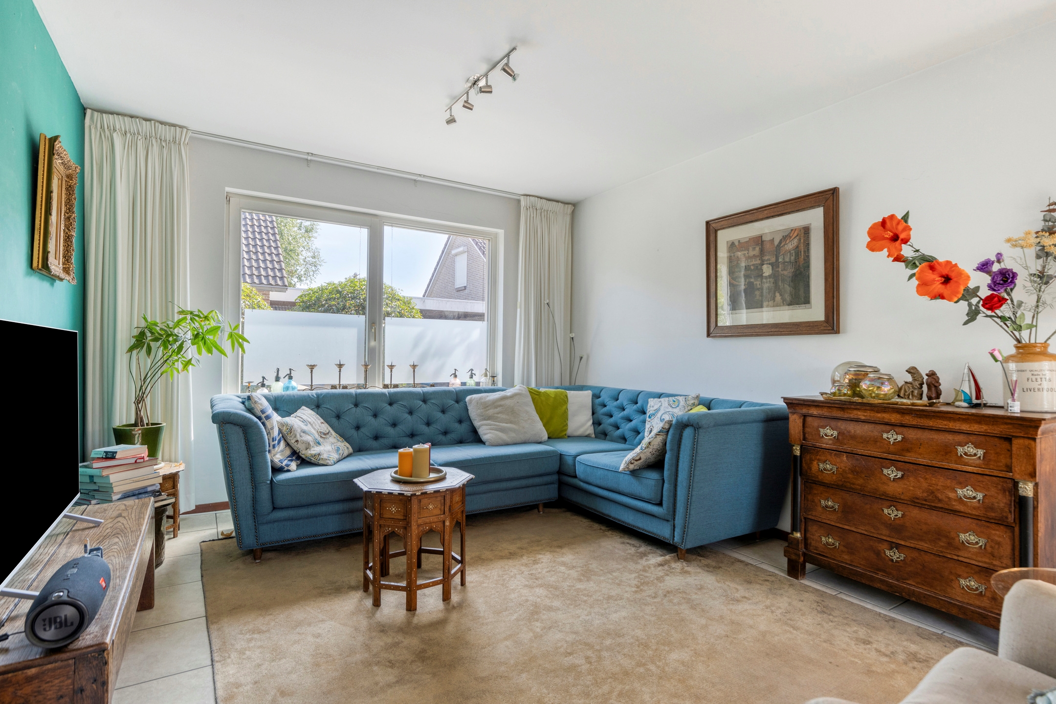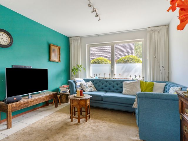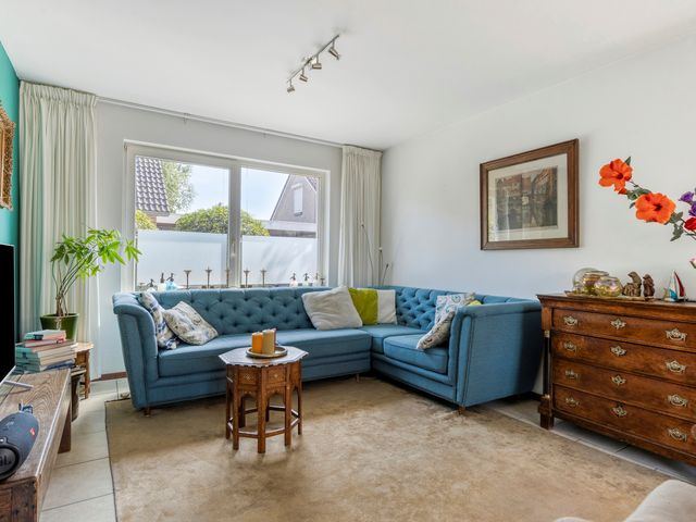 De lichte en ruime woonkamer heeft meerdere raampartijen en een schuifpui die toegang biedt tot de privacy biedende achtertuin. De woonkamer is afgewerkt met een tegelvloer welke doorloopt in de keuken, de wanden en het plafond zijn voorzien van stucwerk.