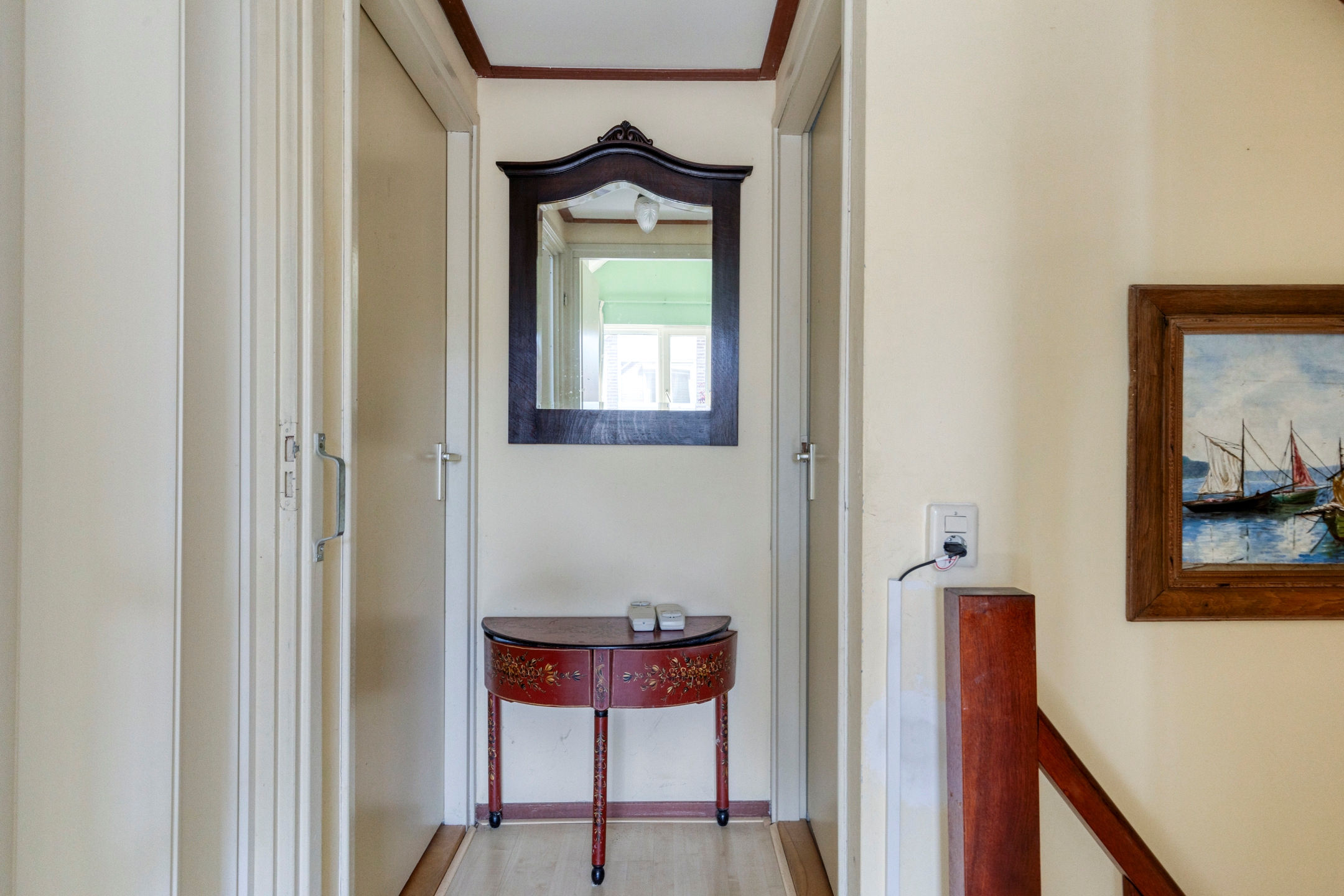 De hardhouten trap in de ontvangsthal komt uit op de overloop van de 1ste verdieping met 3 slaapkamers en de badkamer.