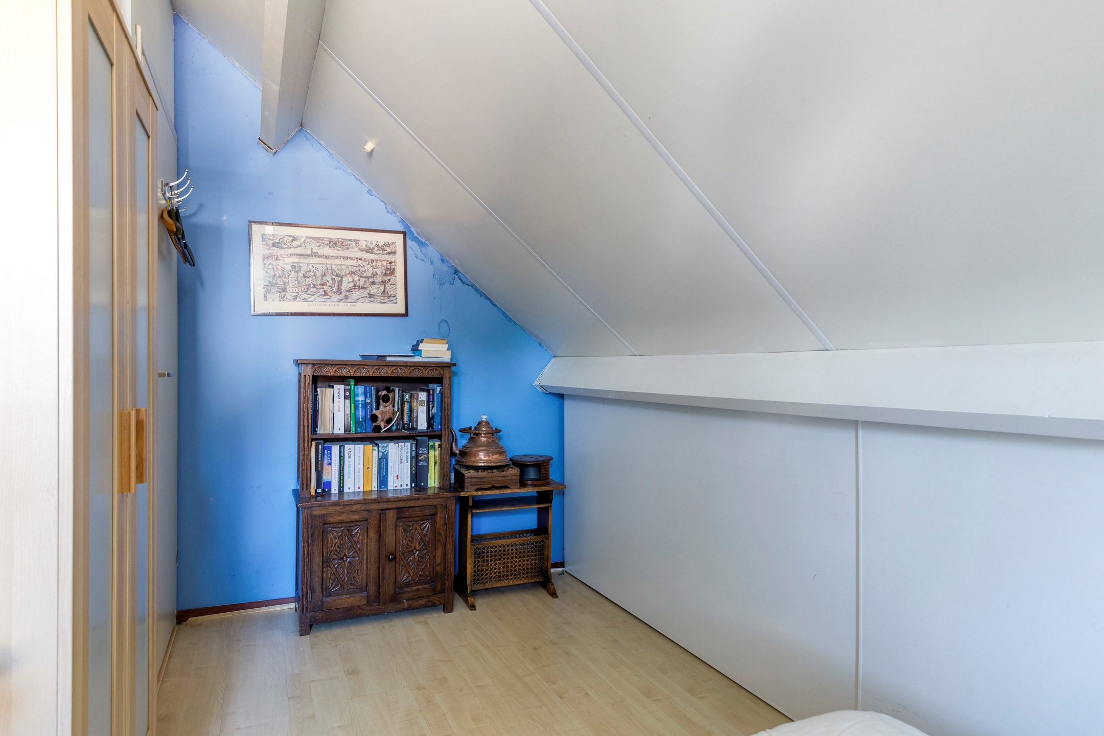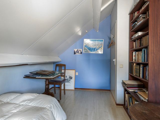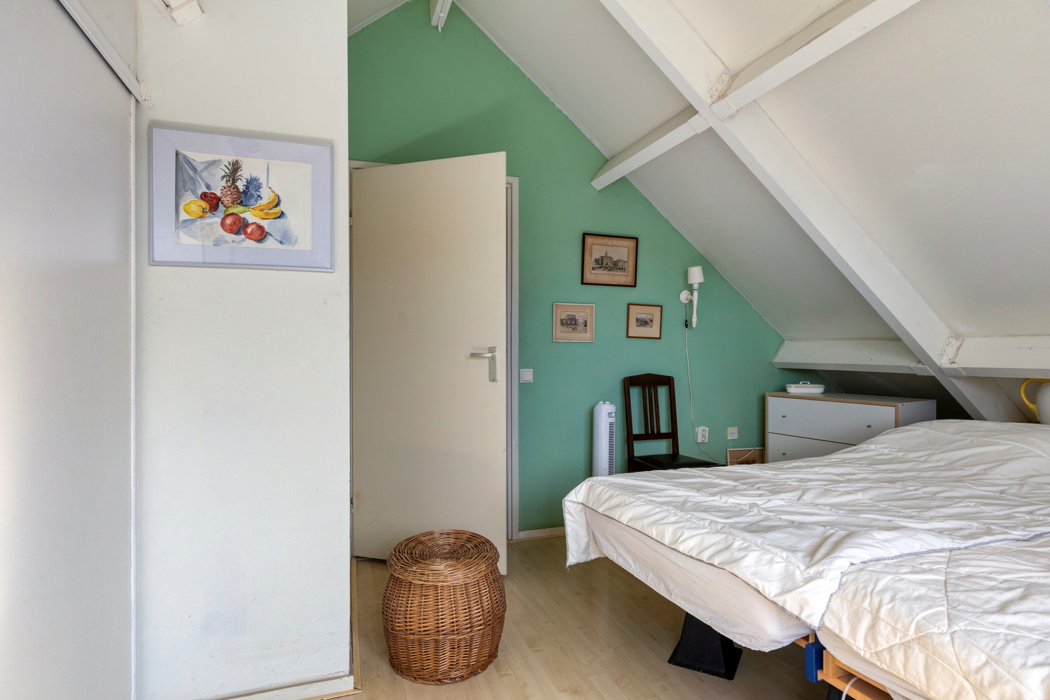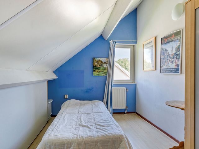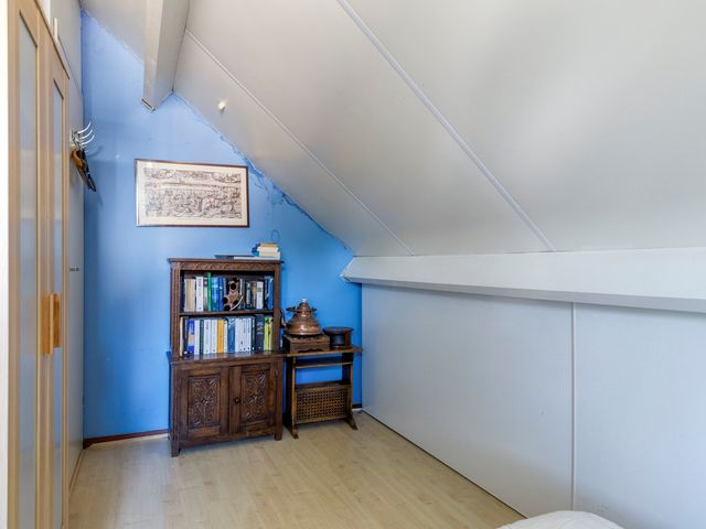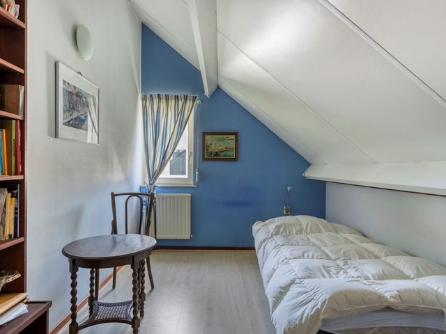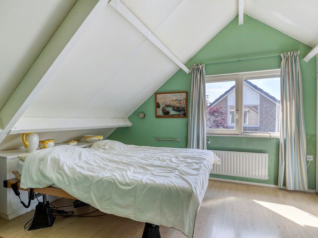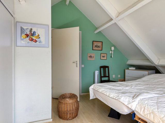 De slaapkamers bieden extra bergruimte onder de schuine kap, zijn afgewerkt met laminaatvloeren en genieten van een mooie lichtinval dankzij de ramen.