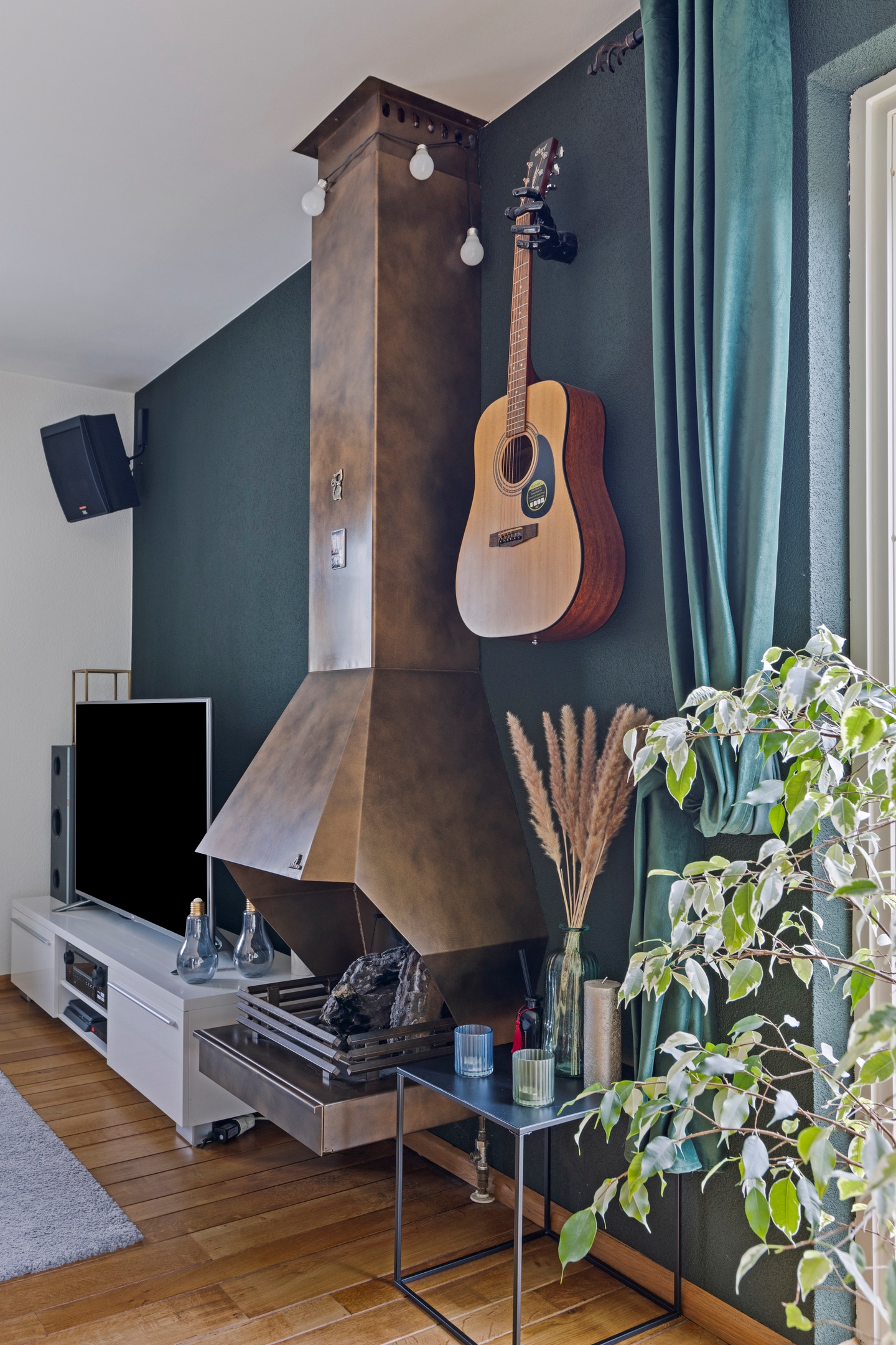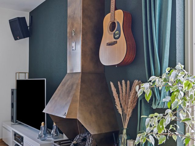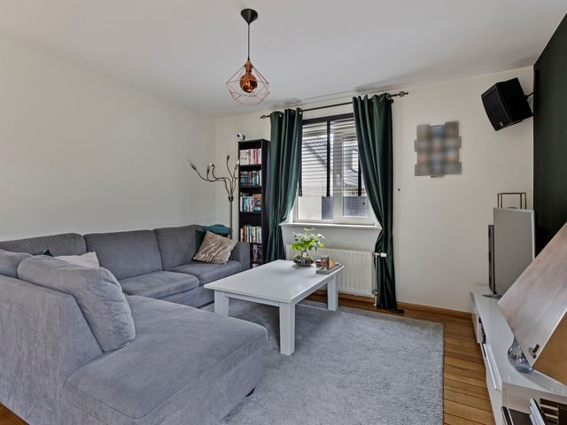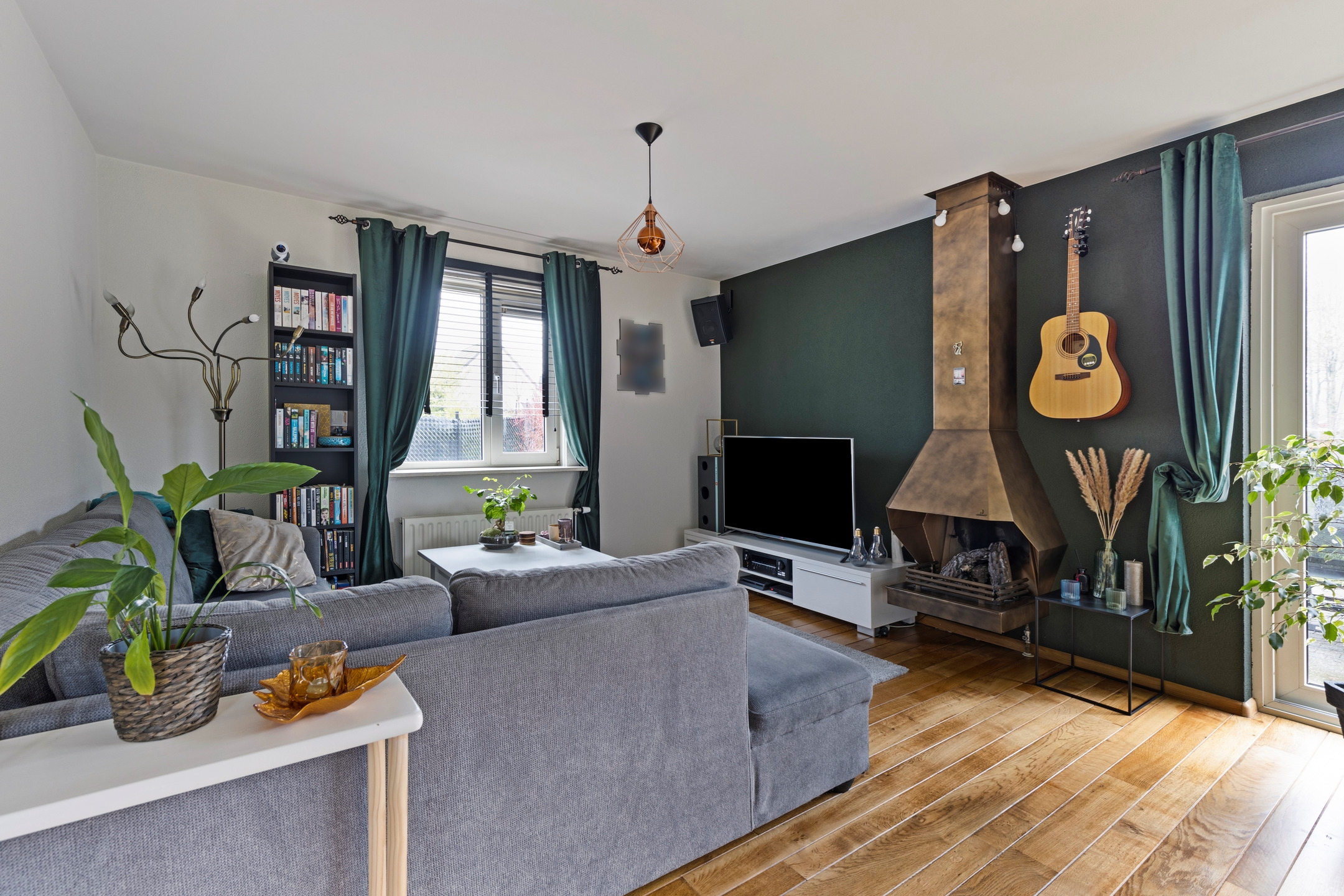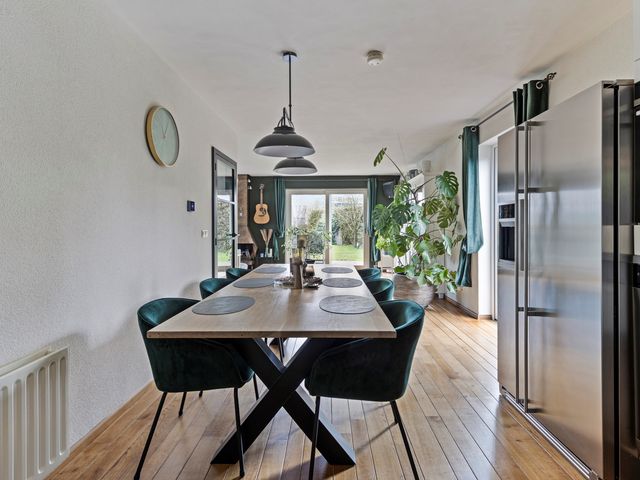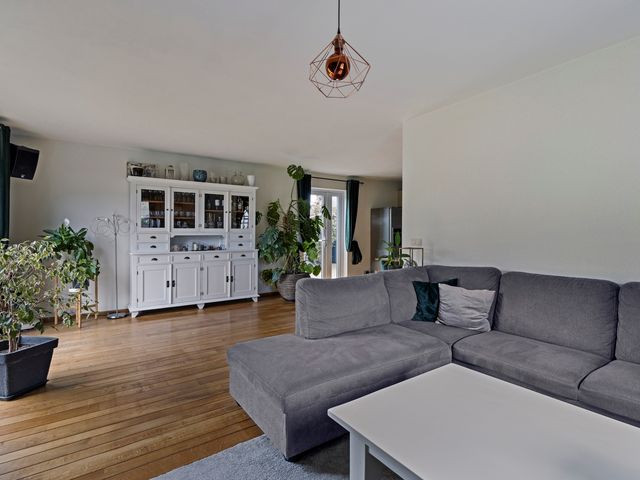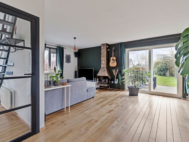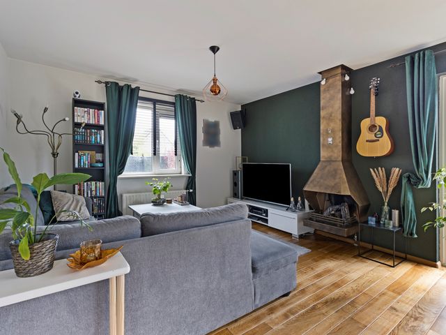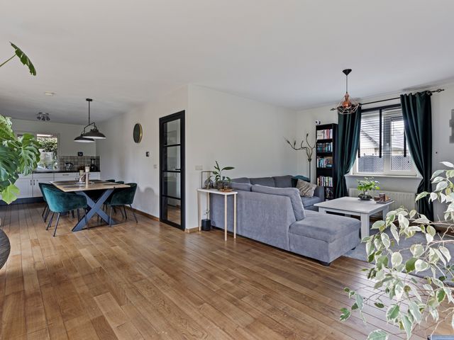 Vanuit de hal stapt u binnen in de sfeervolle L-vormige woonkamer. Deze lichte leefruimte, met meerdere raampartijen, is voorzien van een prachtige houten vloer en een gezellige gashaard die zorgt voor een warme en uitnodigende ambiance. De strak gestucte wanden en het plafond geven de kamer een moderne en verzorgde uitstraling.