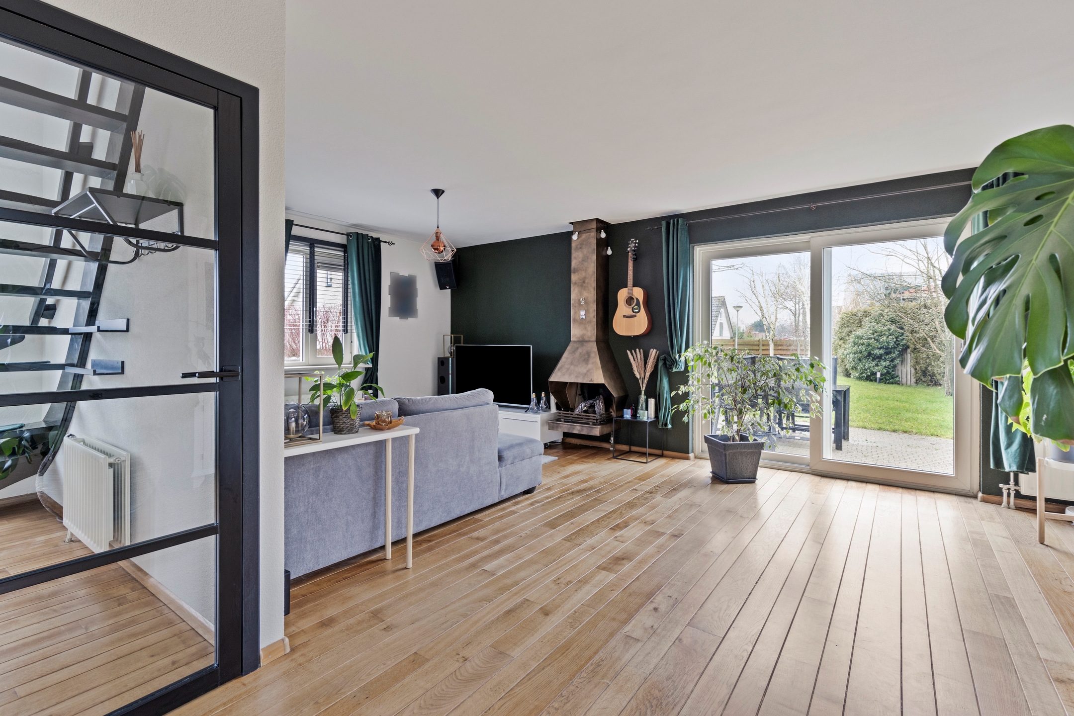 - Royale woonkamer met meerdere raampartijen en loopdeur naar de tuin
