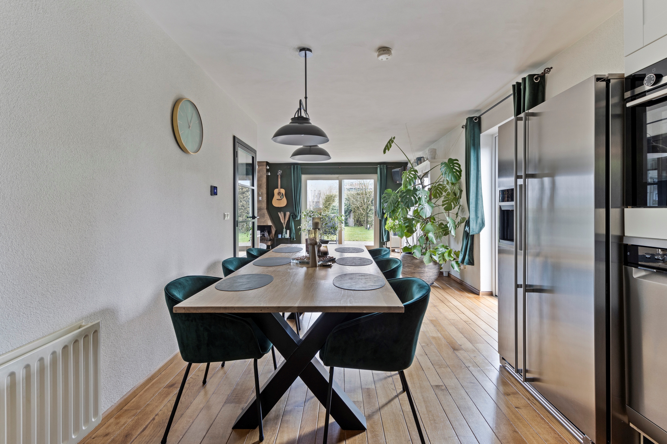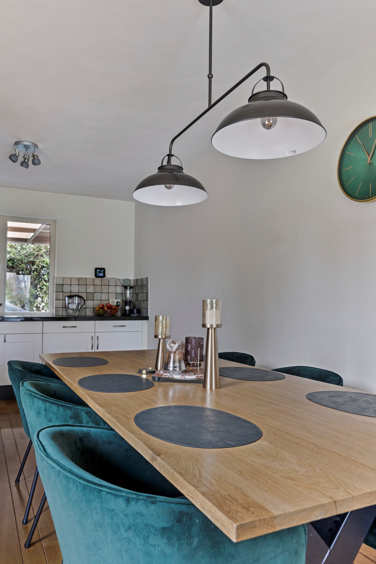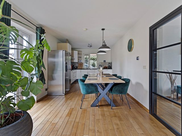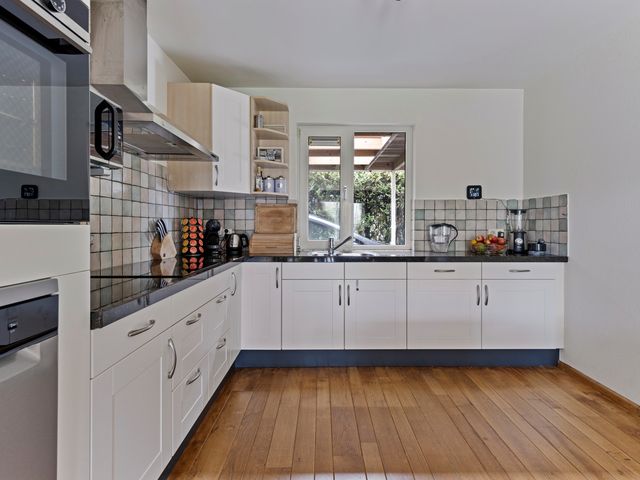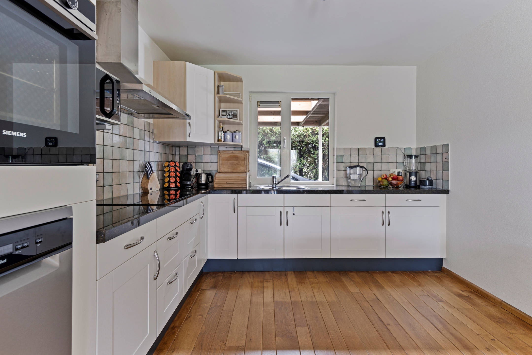 De open keuken bevindt zich aan de achterzijde van de woning en biedt via een loopdeur directe toegang tot de achtertuin. Deze ruimte is ideaal voor een gezellige eethoek met prachtig uitzicht op de tuin. De keuken beschikt over diverse boven- en onderkasten, lades en moderne inbouwapparatuur, waaronder een oven, vaatwasser, inductiekookplaat, RVS afzuigkap en een RVS spoelbak.