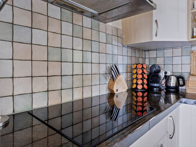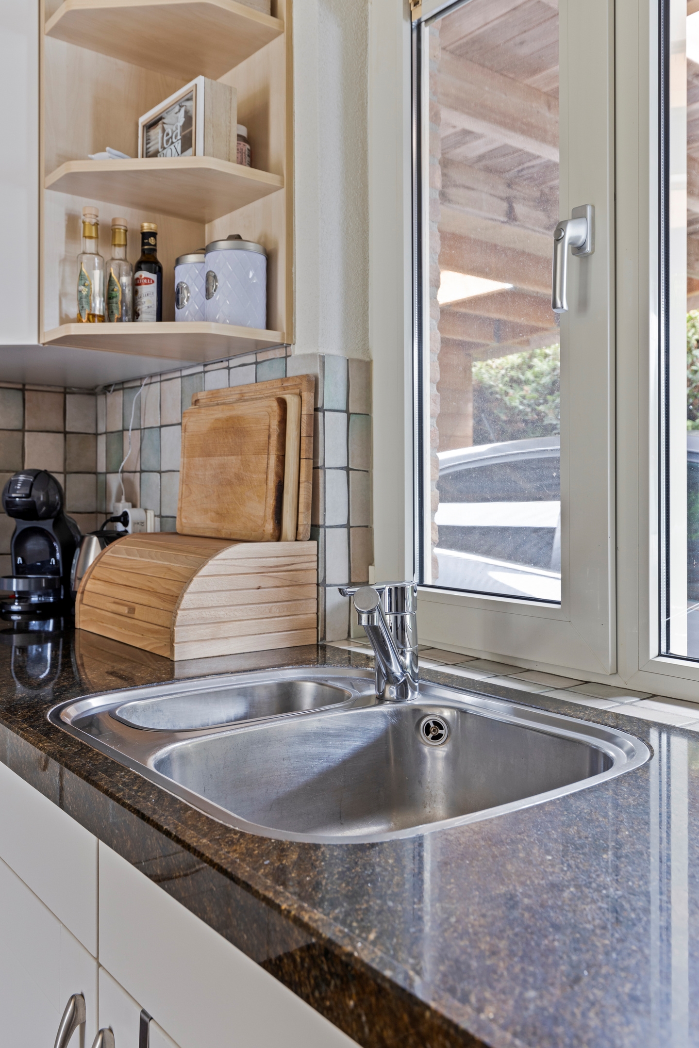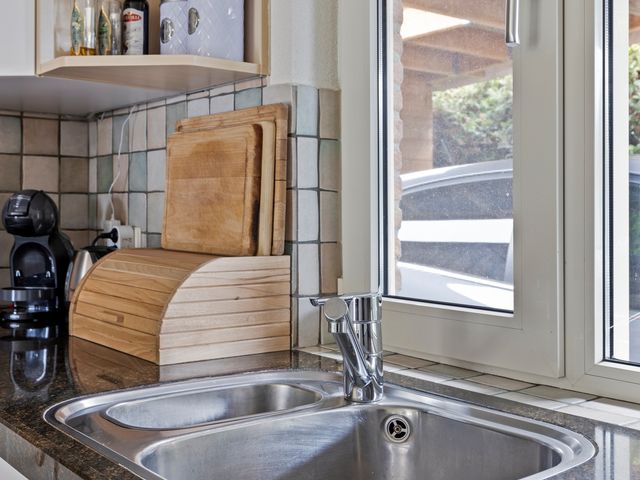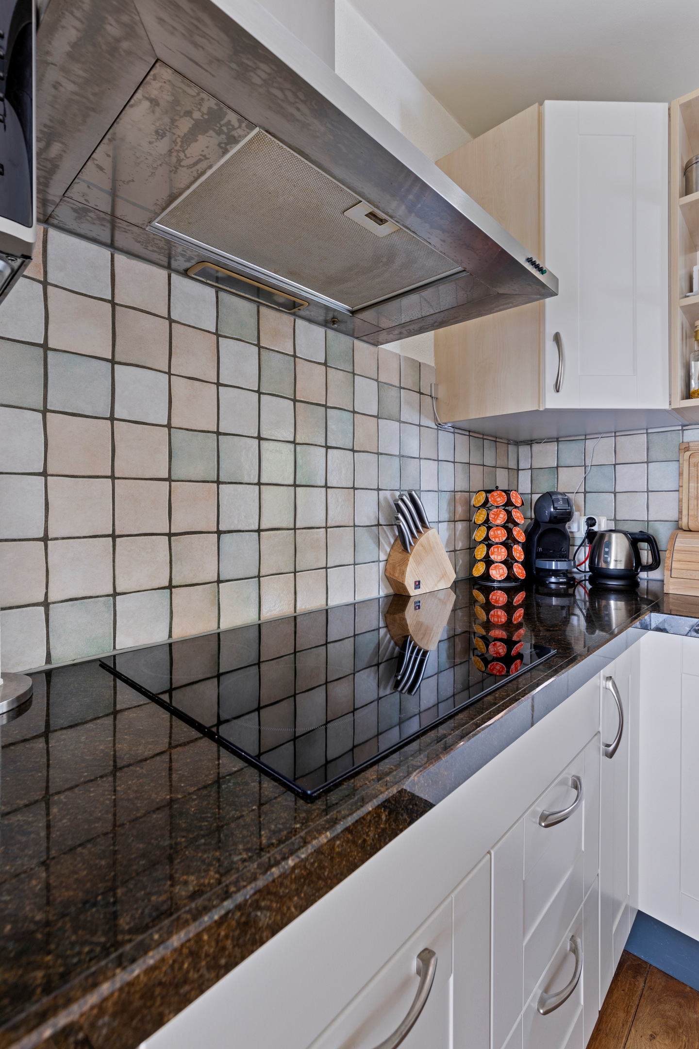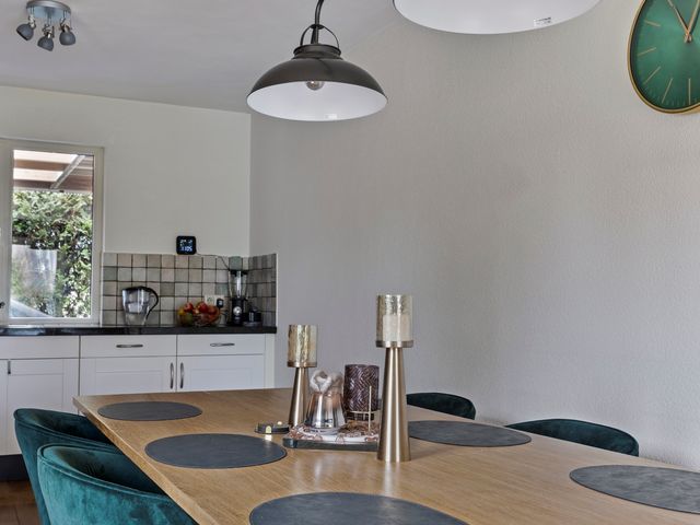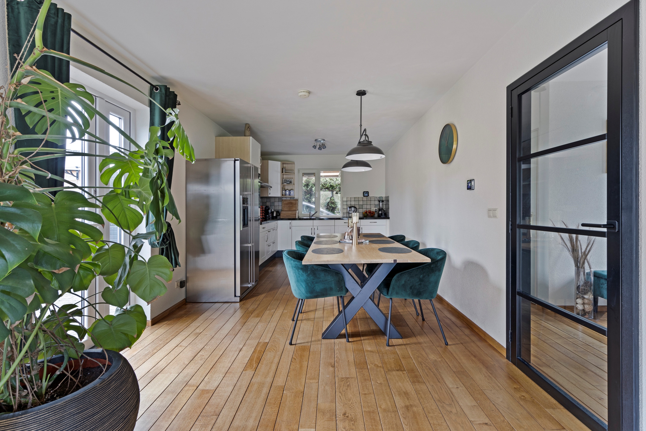 De open keuken bevindt zich aan de achterzijde van de woning en biedt via een loopdeur directe toegang tot de achtertuin. Deze ruimte is ideaal voor een gezellige eethoek met prachtig uitzicht op de tuin. De keuken beschikt over diverse boven- en onderkasten, lades en moderne inbouwapparatuur, waaronder een oven, vaatwasser, inductiekookplaat, RVS afzuigkap en een RVS spoelbak.
