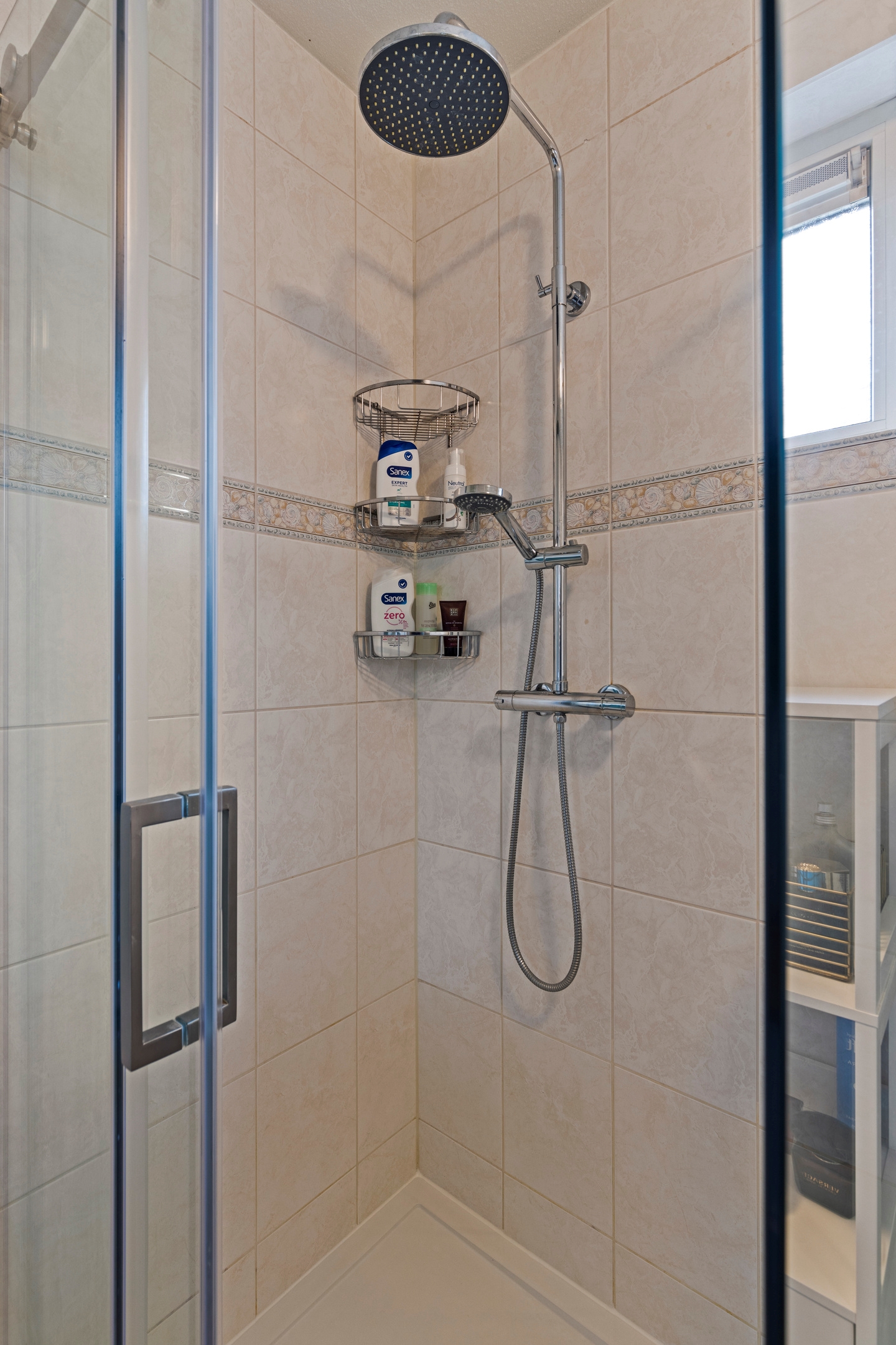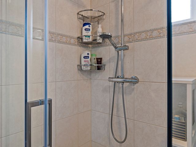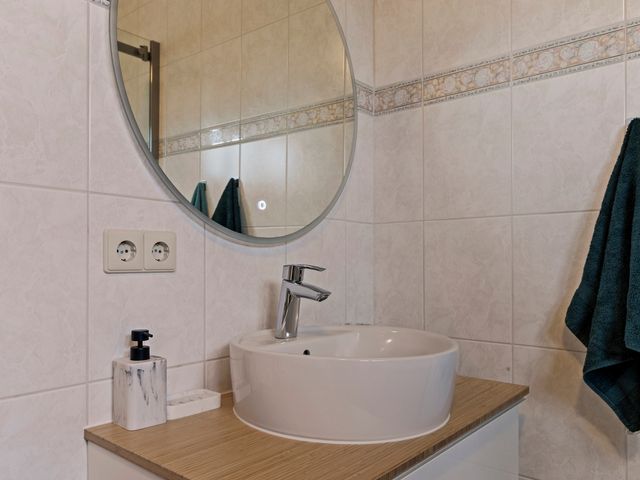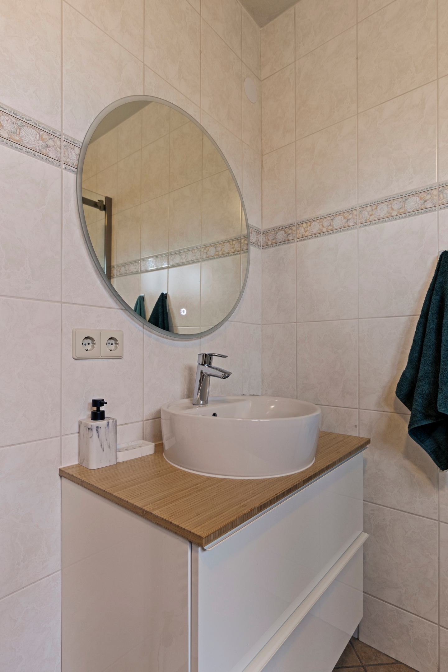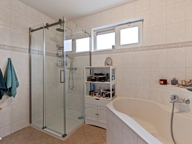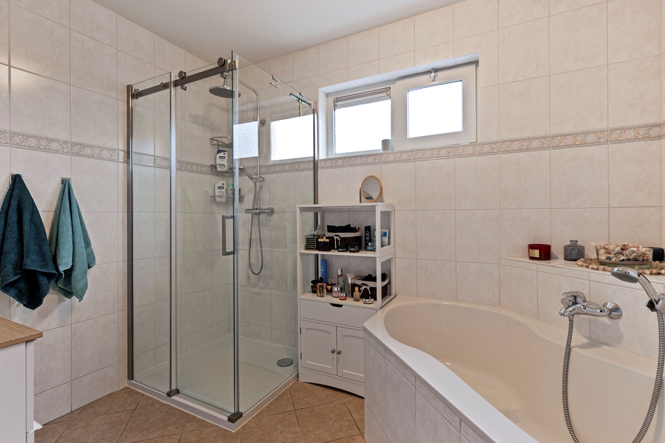 De badkamer is compleet ingericht met douchecabine, ligbad en een wastafel op een stijlvol badkamermeubel. De ruimte is geheel betegeld en voorzien van een raampartij die niet alleen zorgt voor veel daglicht, maar ook voor natuurlijke ventilatie.