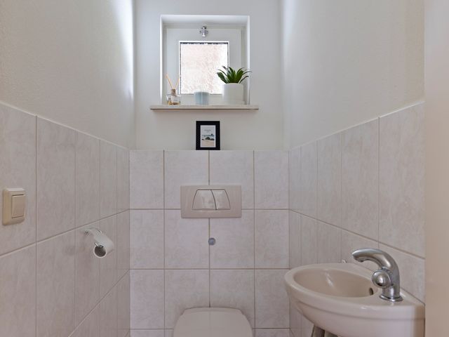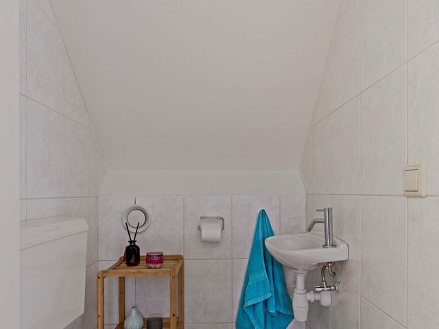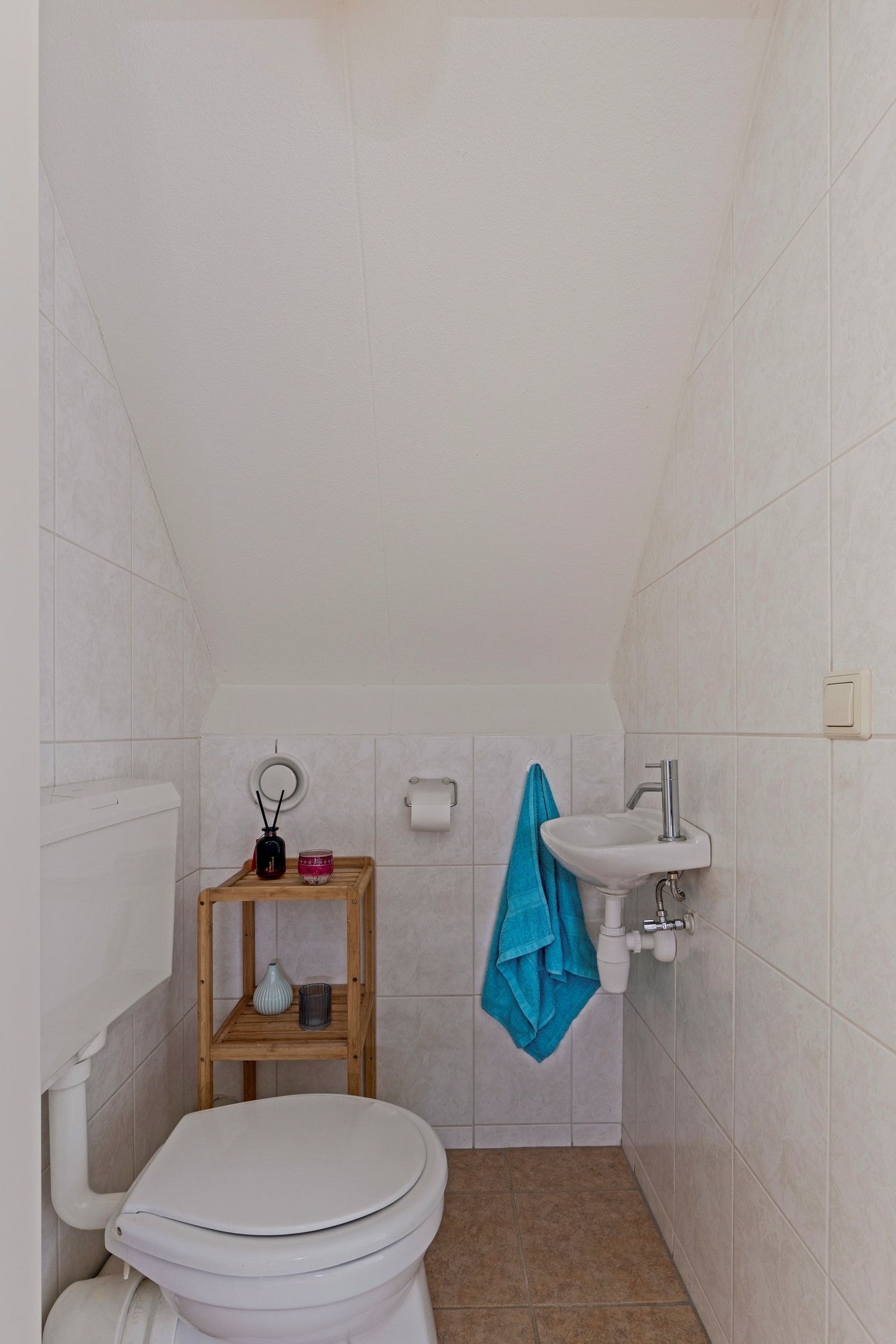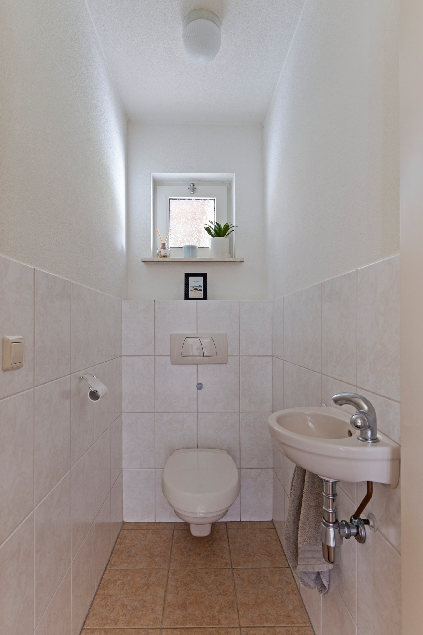 De toiletruimte is voorzien van een wandcloset en een fontein. De ruimte is deels betegeld en deels gestuct.