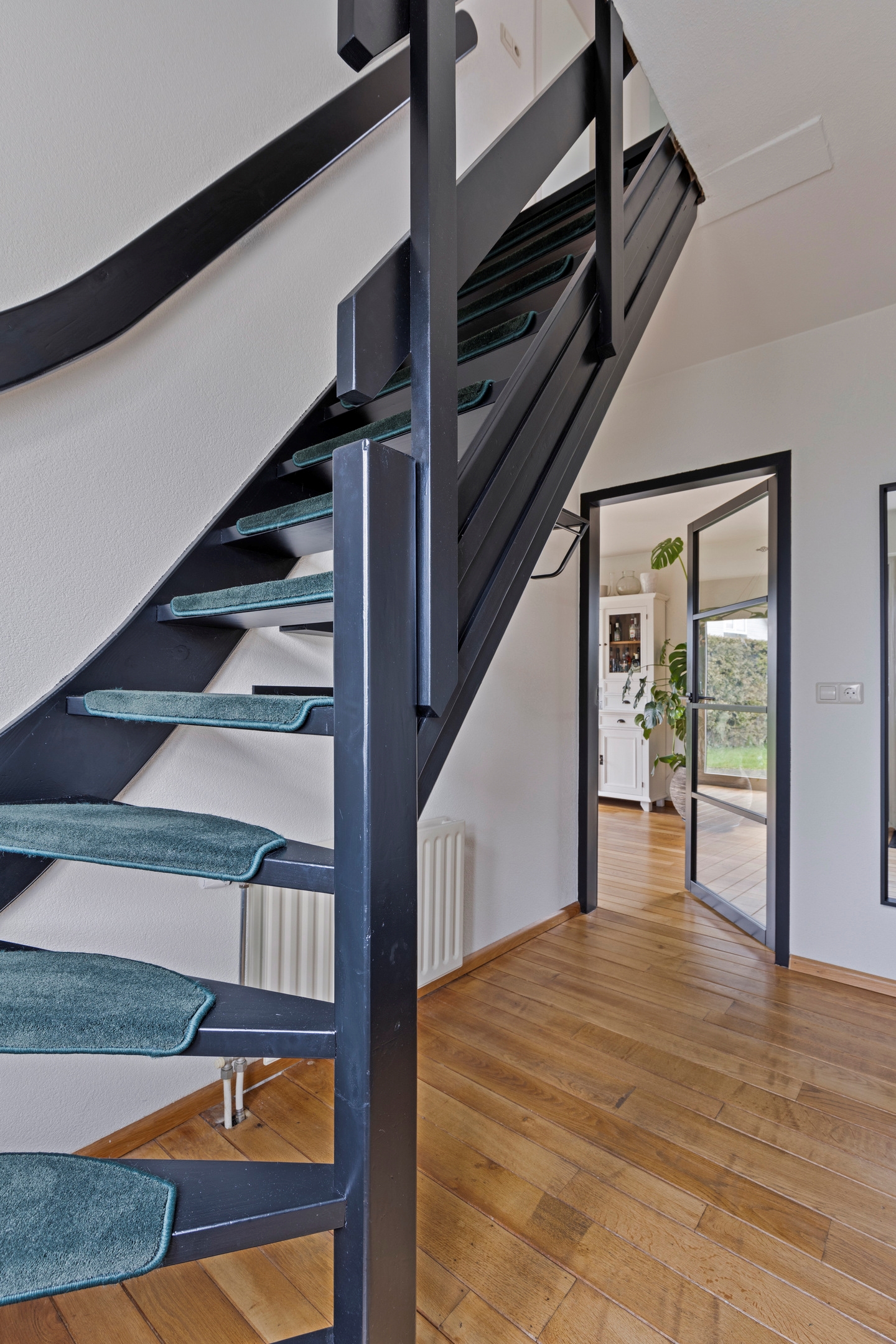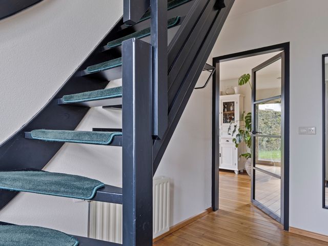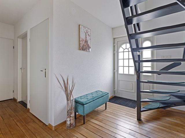 De ruime ontvangsthal biedt toegang tot de sfeervolle woonkamer, de praktische berging, de ruime badkamer, het separate toilet en de trap naar de bovenverdieping.