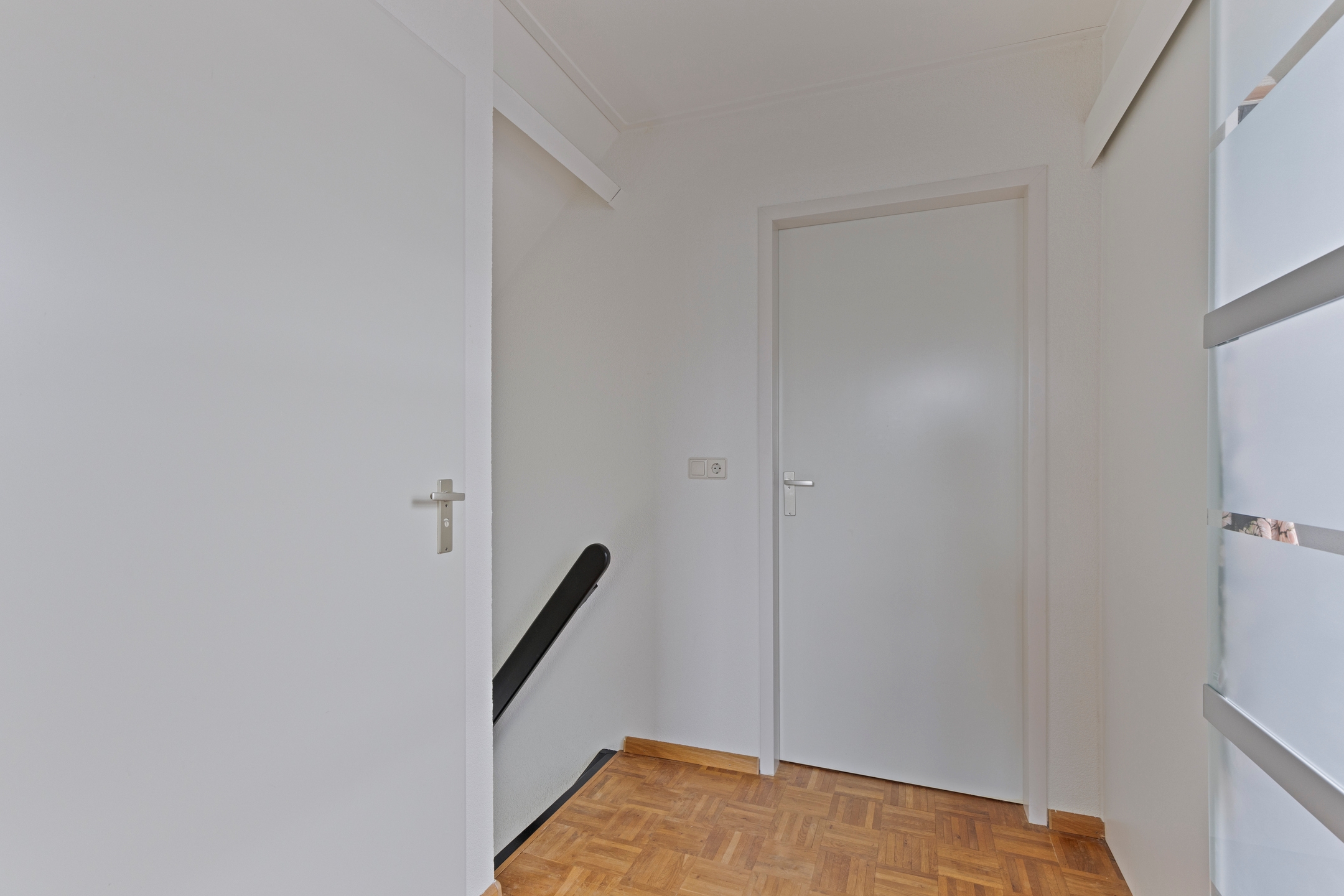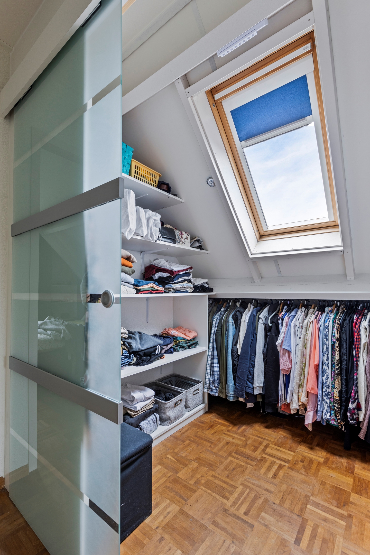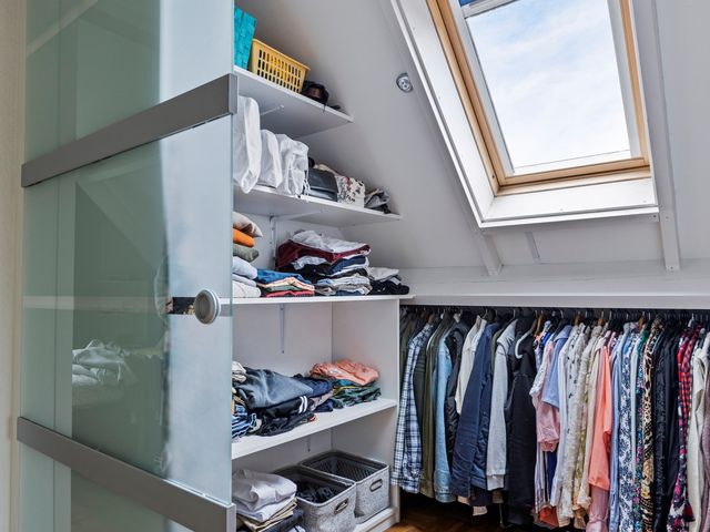 Op de eerste verdieping bevindt zich tevens een praktische en goed ingerichte walk-in-closet. Deze ruimte is voorzien van een schuifdeur en een dakraam, waardoor er volop natuurlijke lichtinval is. De kast biedt royale opbergmogelijkheden met zowel hang- als leggedeeltes, ideaal voor het overzichtelijk opbergen van kleding en accessoires. Een stijlvolle en functionele toevoeging aan de woning!