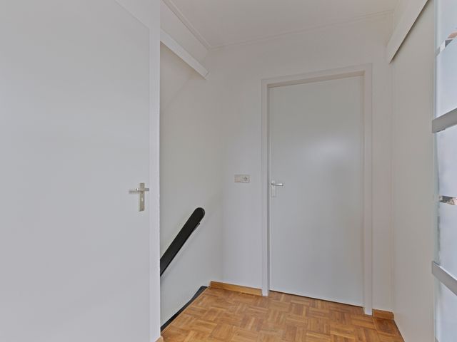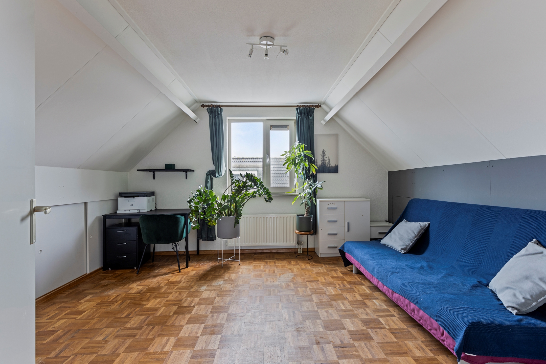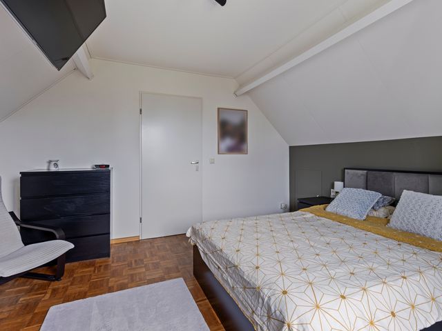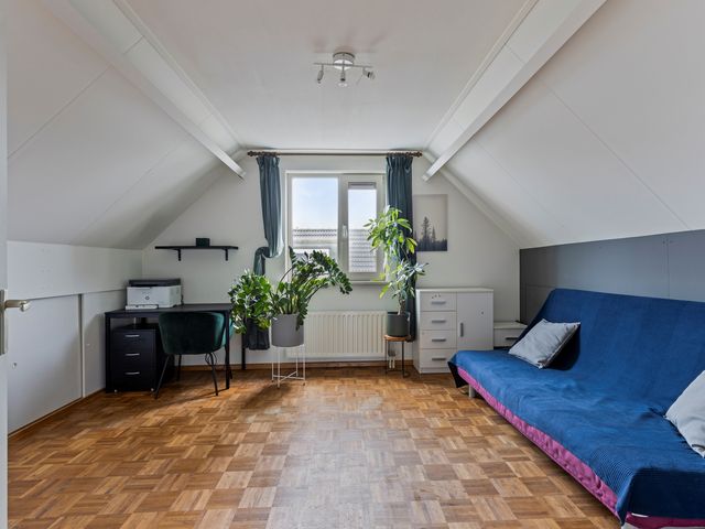 De tweede slaapkamer is eveneens ruim en voorzien van dezelfde prachtige houten vloer. Ook in deze kamer is er geen gebrek aan opbergruimte dankzij de praktische bergruimte achter de schuine dakschotten. Hierdoor blijft de kamer overzichtelijk en optimaal in te richten naar eigen wens. Perfect als tweede slaapkamer, logeerkamer of werkruimte!