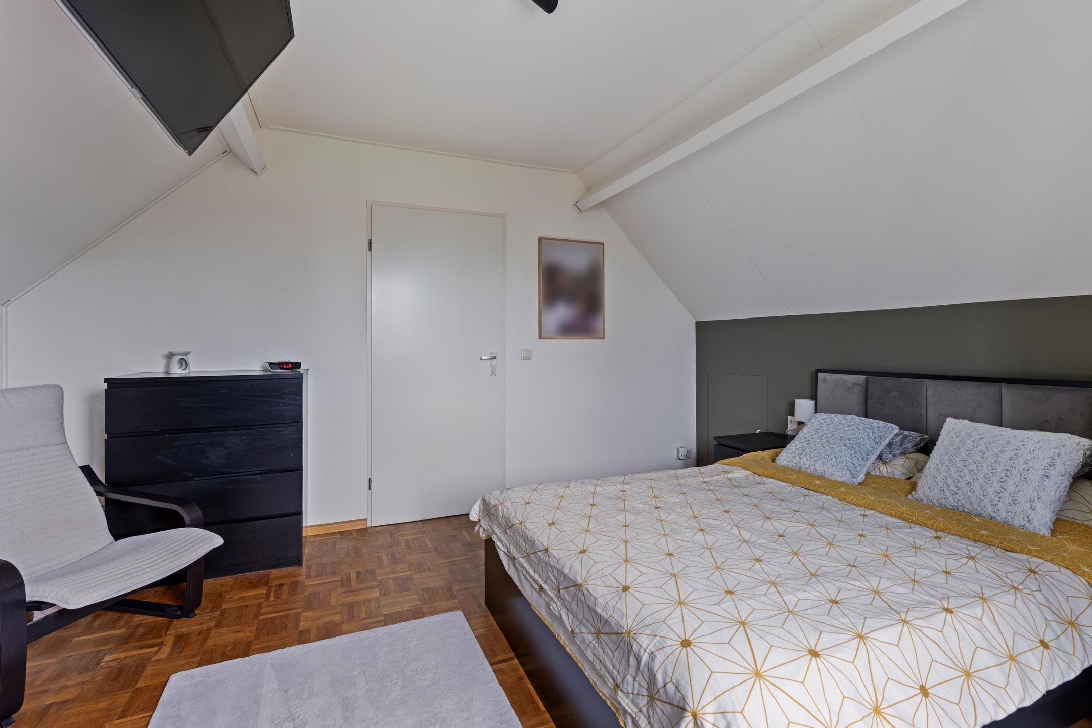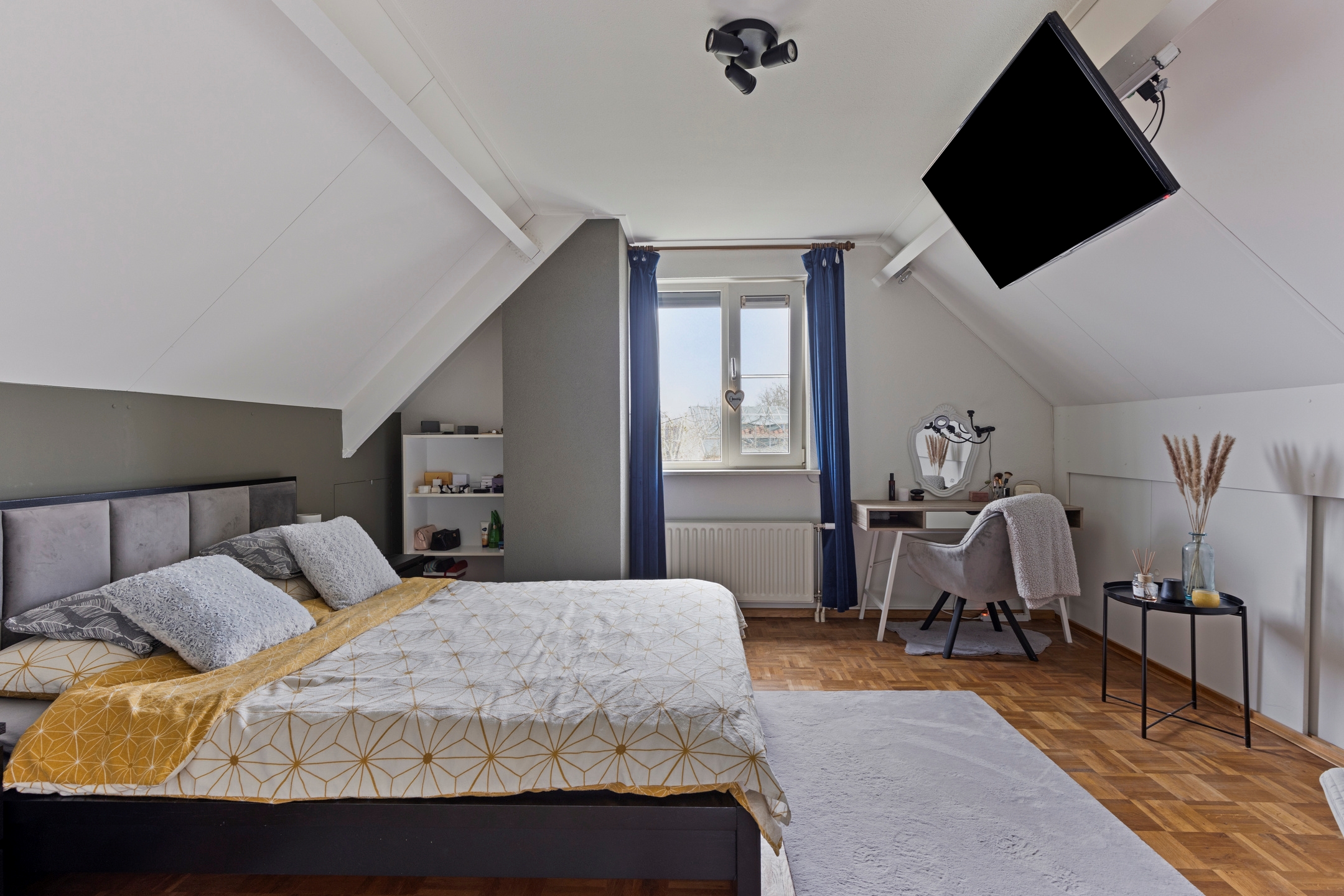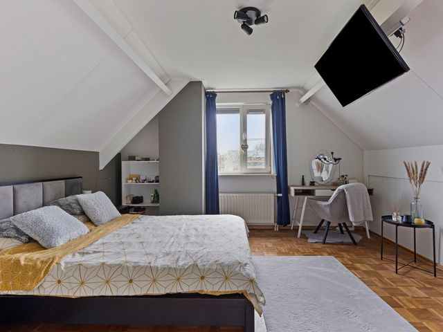 De eerste slaapkamer is ruim van afmeting en straalt comfort uit. Dankzij de schuine plafonds en de zichtbare balken ontstaat er een sfeervol en karakteristiek geheel. Het grote raam laat volop natuurlijk licht binnen. De houten vloer voegt een warme, natuurlijke uitstraling toe aan de ruimte.