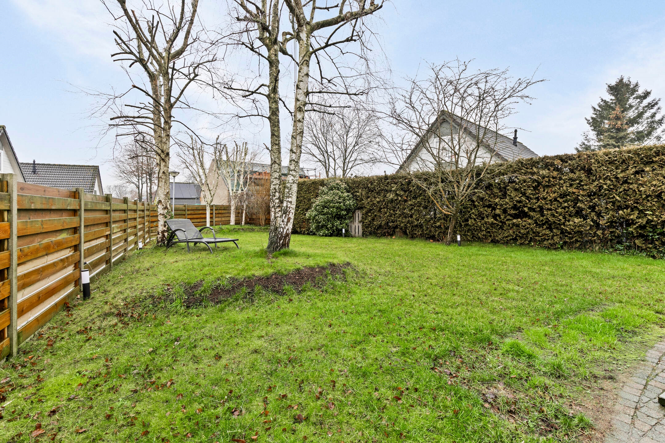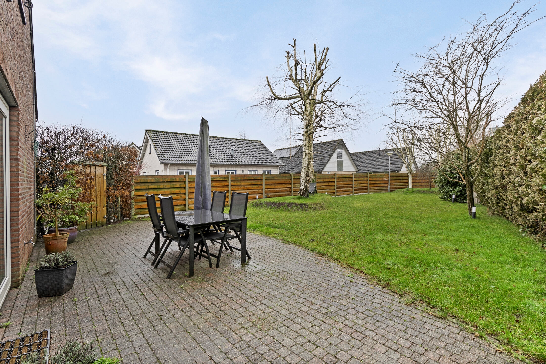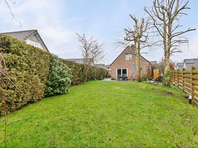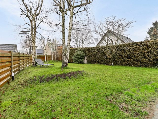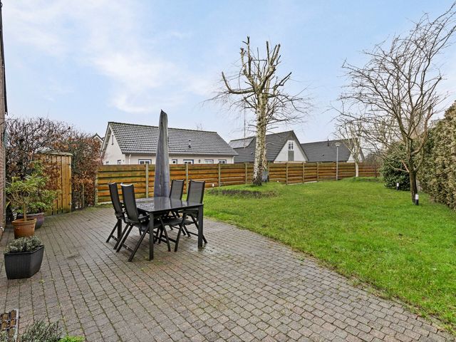 De woning beschikt over een ruime, goed onderhouden tuin met een groot betegeld terras direct achter de woning. Het gazon, omgeven door groene hagen en bomen, biedt veel privacy en ruimte.
