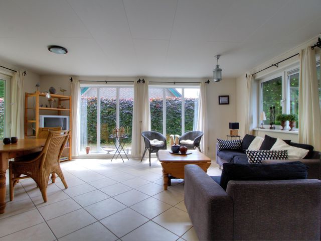 De woonkamer is een lichte ruimte met uitzicht op de tuin en rondom meerdere raampartijen. We schreven het al eerder, de ligging op het perceel en de groene haag rondom maakt het dat je hier veel privacy geniet!