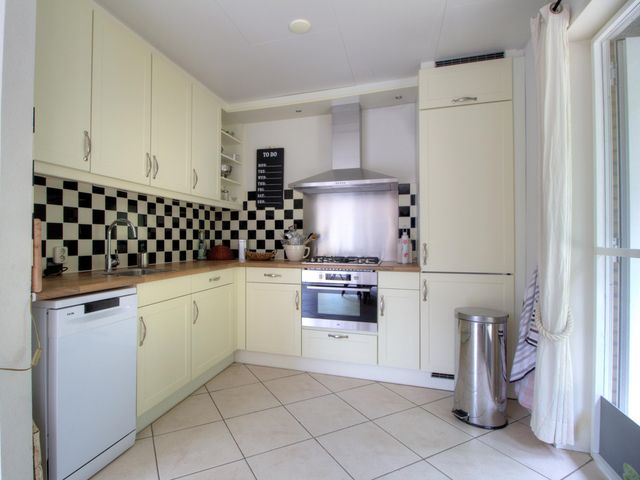 De lichte L-vormige open keuken heeft diverse boven- en onderkasten en is voorzien van een 4-pitskookplaat, roestvrij stalen afzuigkap, combi-oven, koelkast en vaatwasser.
