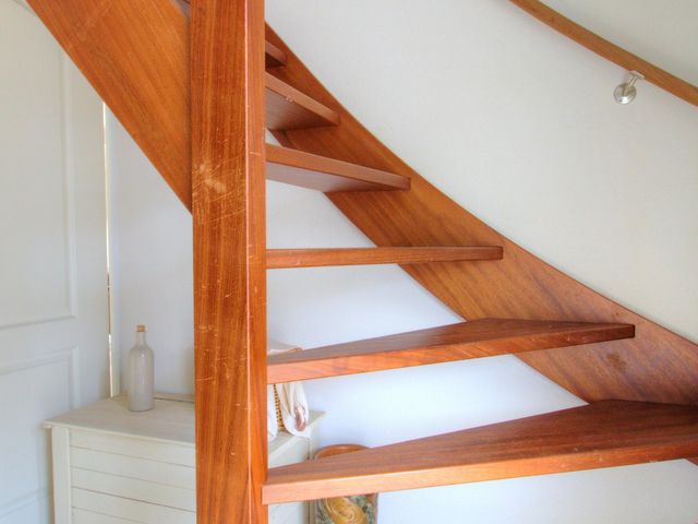 De ontvangsthal, met een robuuste houten trap naar de bovenverdieping , geeft toegang tot de woonkamer, 1e slaapkamer, badkamer en separate toiletruimte. De gehele benedenverdieping is voorzien van een tegelvloer.
