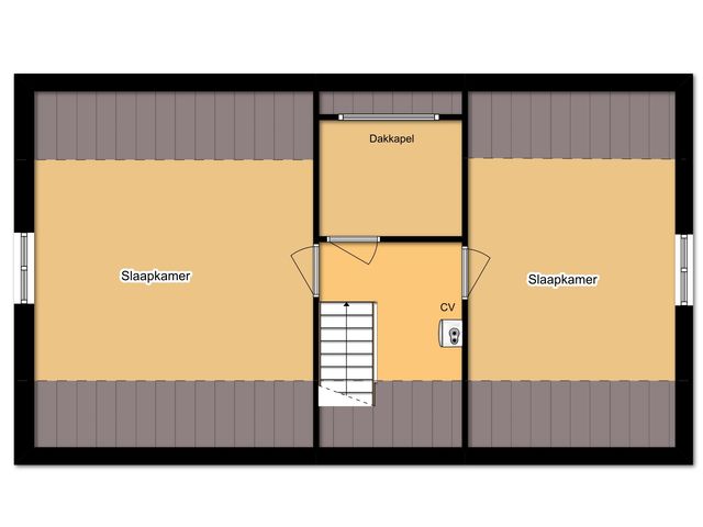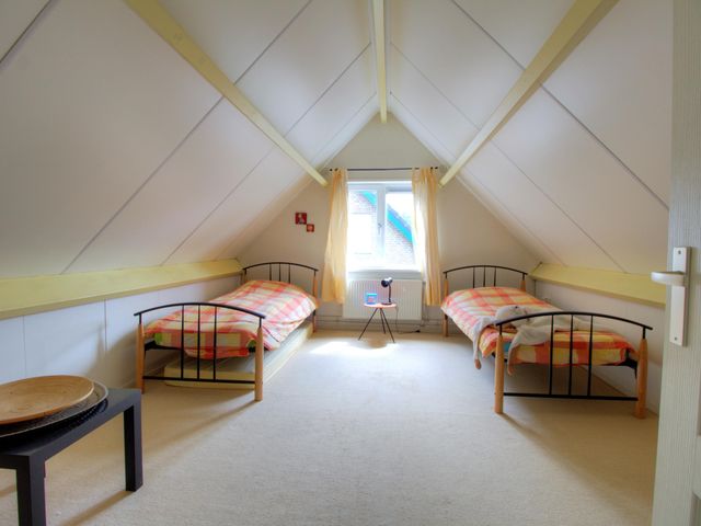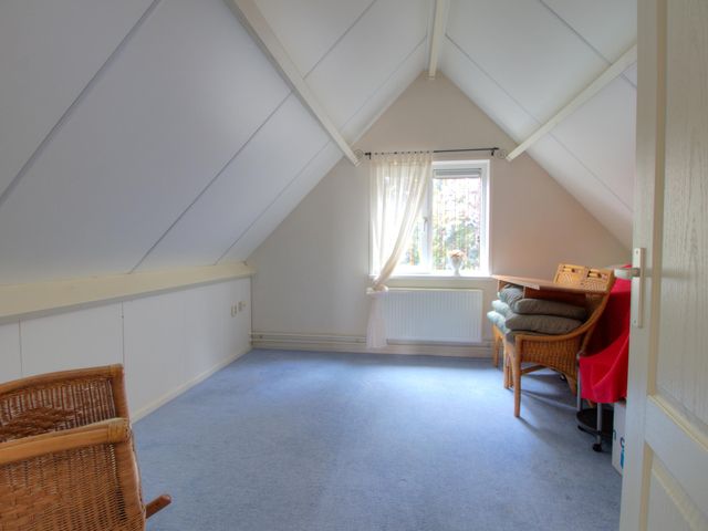 De houten trap in de ontvangsthal geeft toegang tot de 1e verdieping met overloop en 2e en 3e slaapkamer. Beide slaapkamers zijn nagenoeg gelijkwaardige aan elkaar en hebben vloerbedekking, een schuine wandafwerking en een raampartij. Twee fijne kamers, ideaal als slaapkamer maar bijvoorbeeld ook in te richten als hobby- of werkruimte. Tevens is op deze verdieping nog een kleinere kamer.