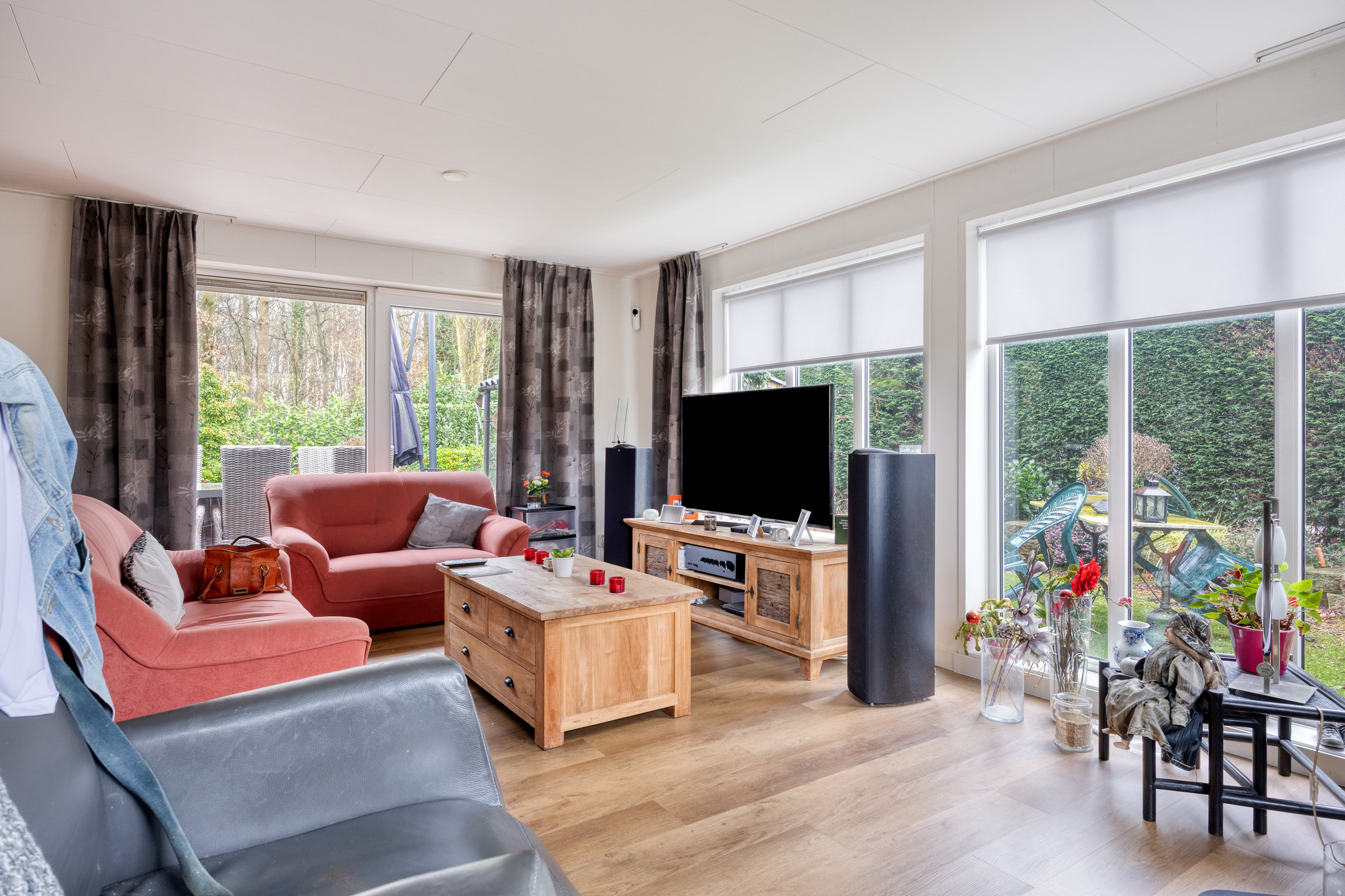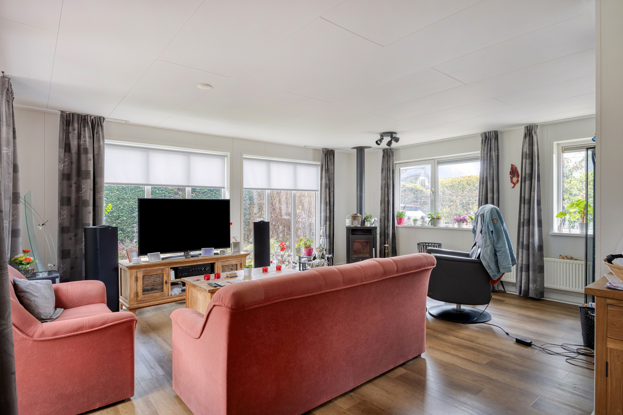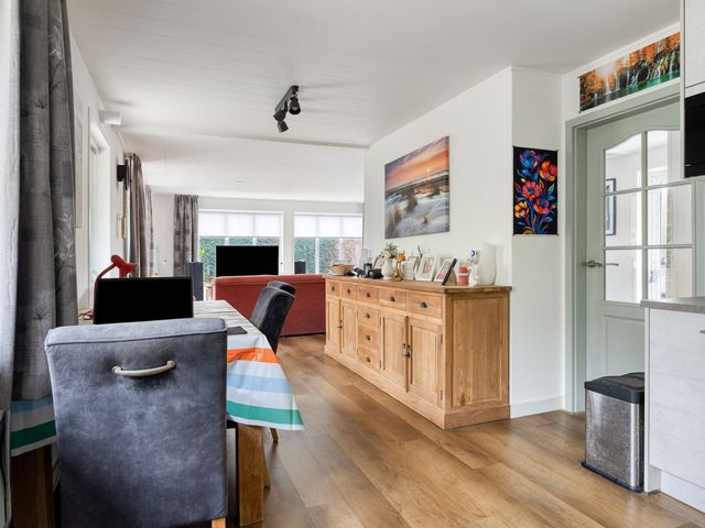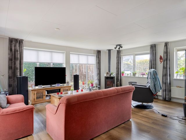 De sfeervolle, ruime L-vormige woonkamer heeft fraaie, goed geplaatste raampartijen, een schuifpui en een aansluitpunt t.b.v. bijv. een houtkachel. Door de forse raampartijen komt er veel natuurlijk daglicht binnen, dit geldt overigens voor de gehele woning en is er prettig tuincontact!