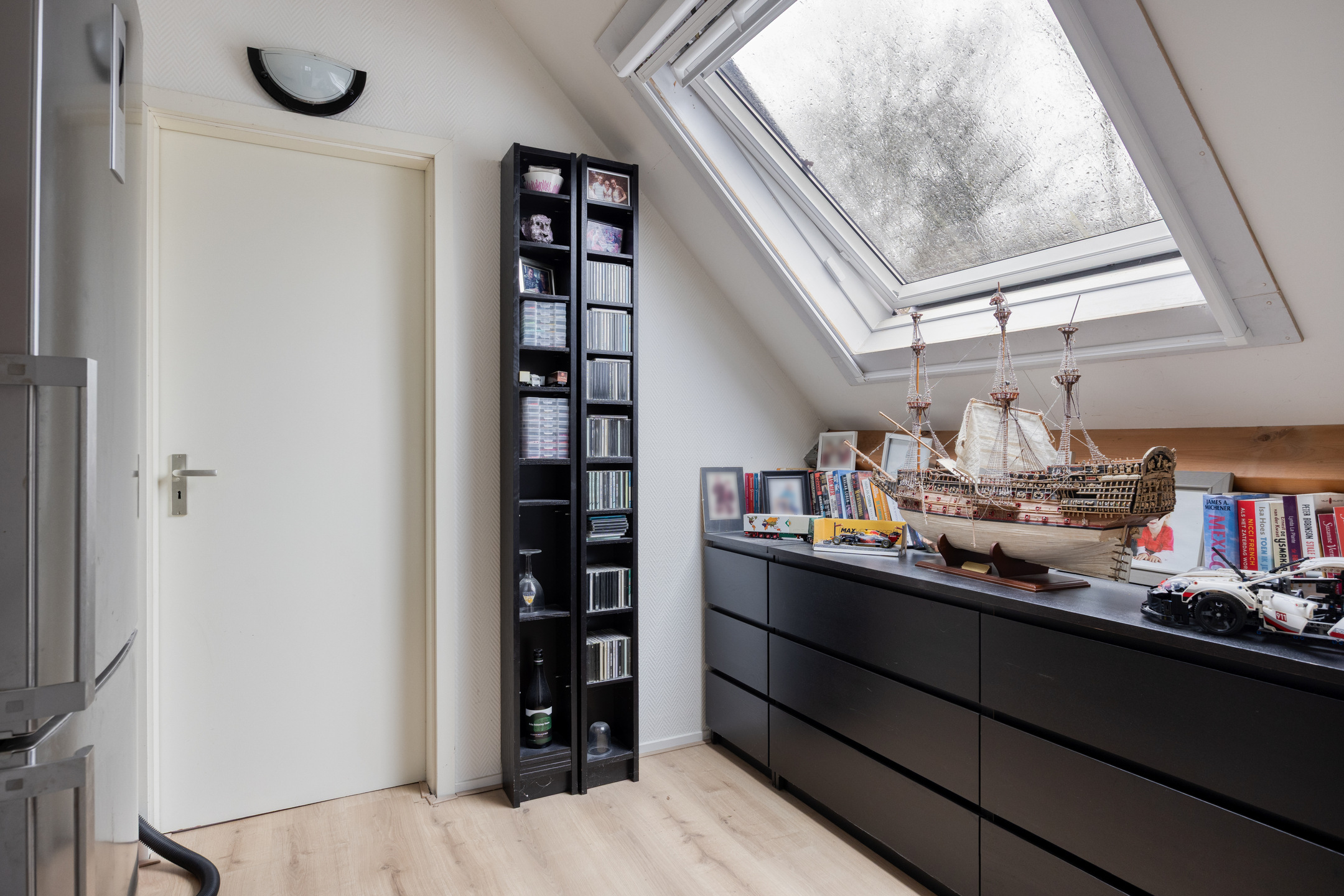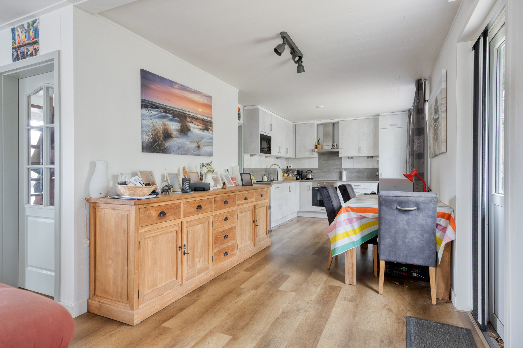 Op deze woonlaag ligt een lichte laminaatvloer en de wanden zijn fijn behangen.