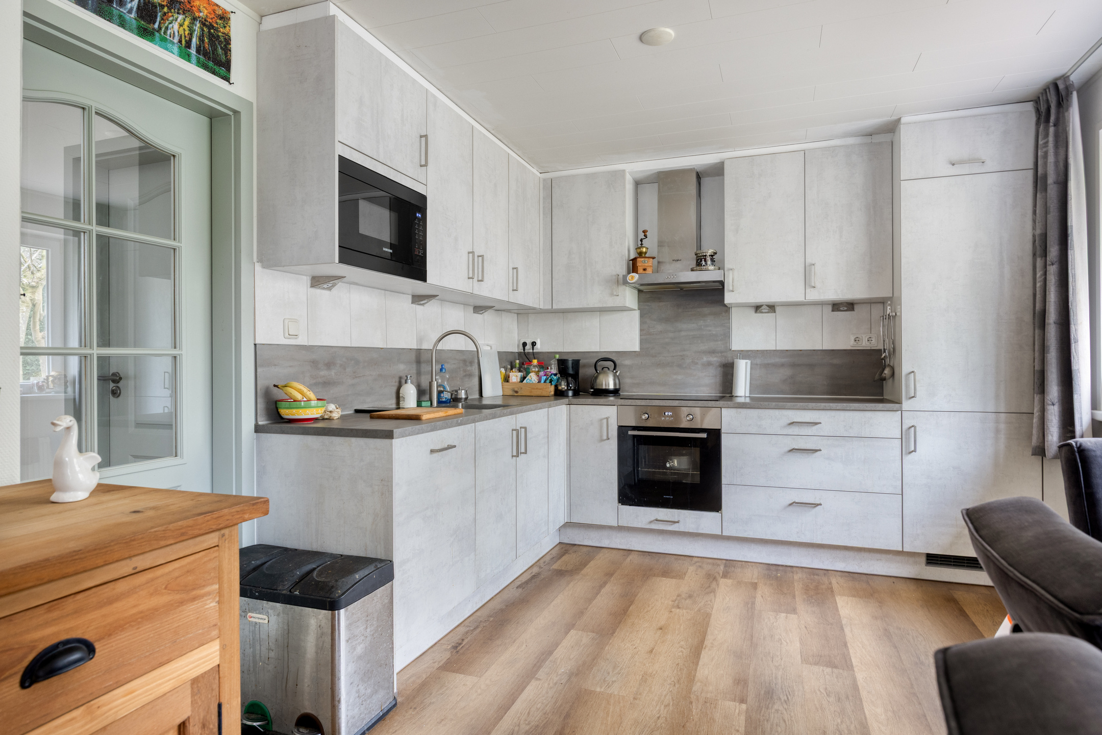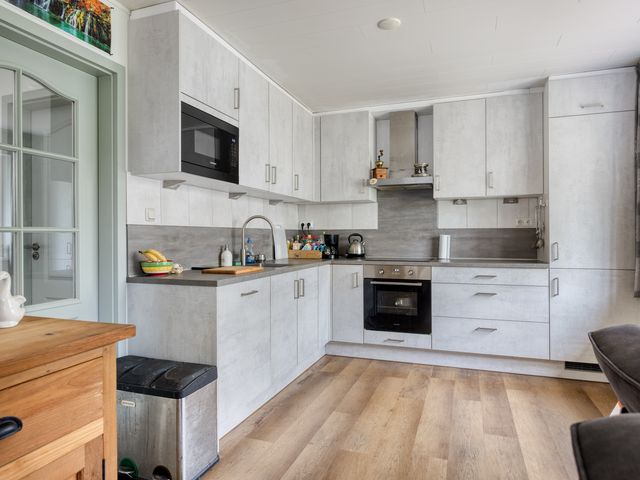 De stoere/lichte L-vormige, halfopen, complete inbouwkeuken heeft een mooi achtergevelraam, diverse boven-/onderkasten, is voorzien van een Rvs afzuigkap, een inductiekookplaat, een combi-oven, een magnetron, een koelkast, een diepvriezer en een vaatwasser.