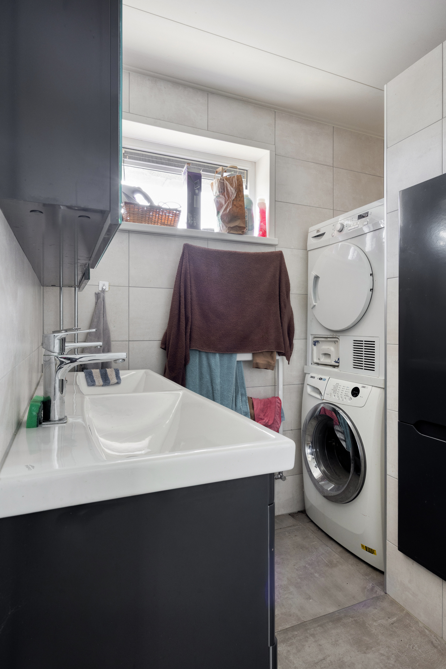 De moderne/lichte badkamer met een liggend/hoog geplaatst raam, heeft een designradiator en een inbouwkast. Deze badkamer is uitgerust met een wastafelmeubel, een fraaie inloopdouche met een thermostaatkraan en een regendouche. Verder treft u de mechanische ventilatie en de wasmachine-/drogeraansluiting aan.