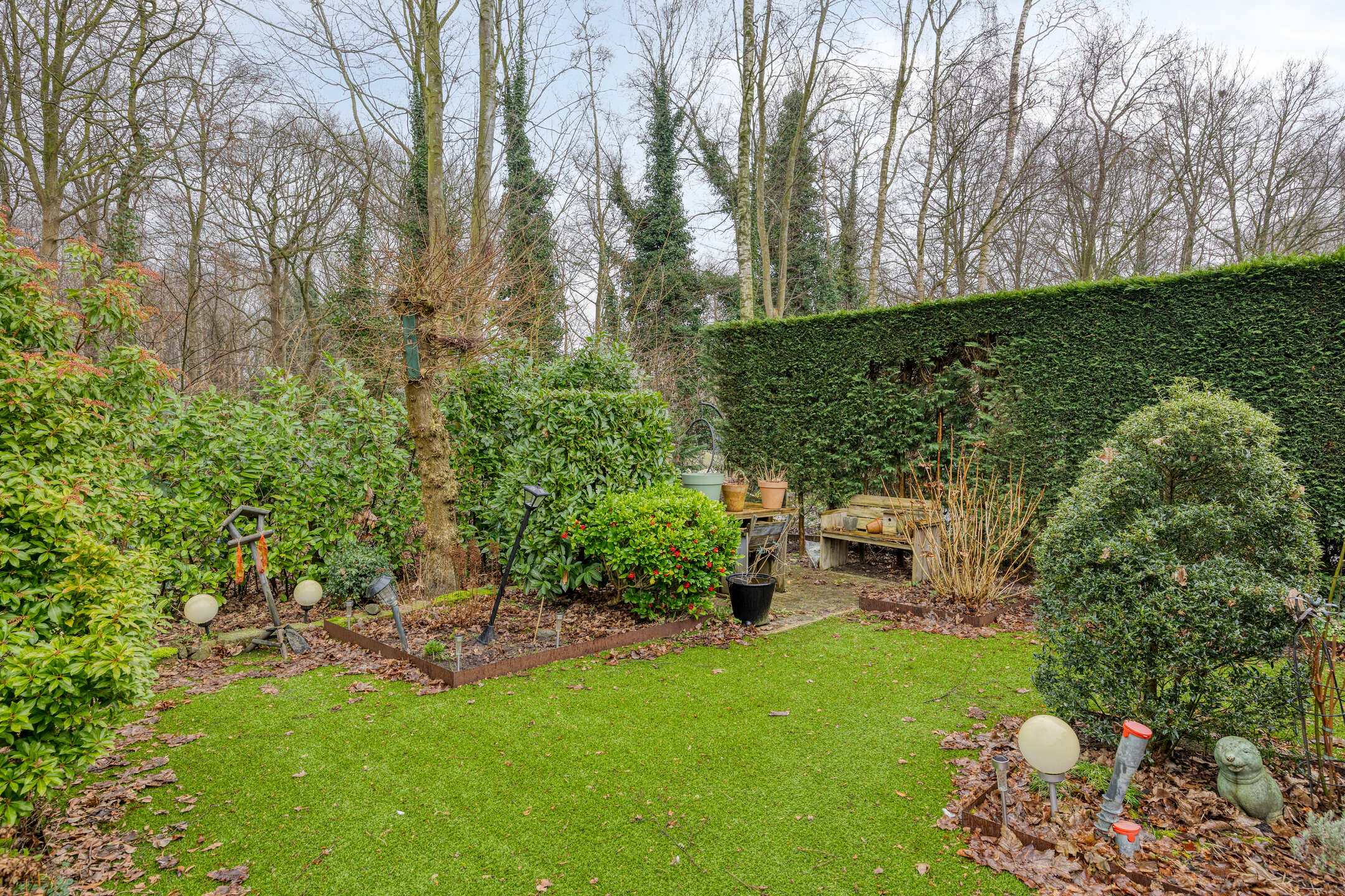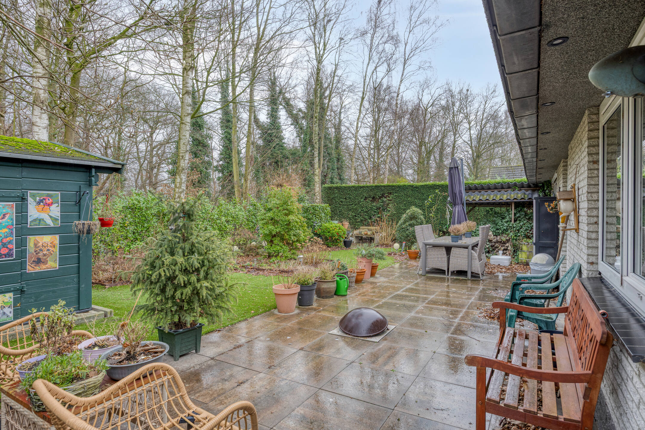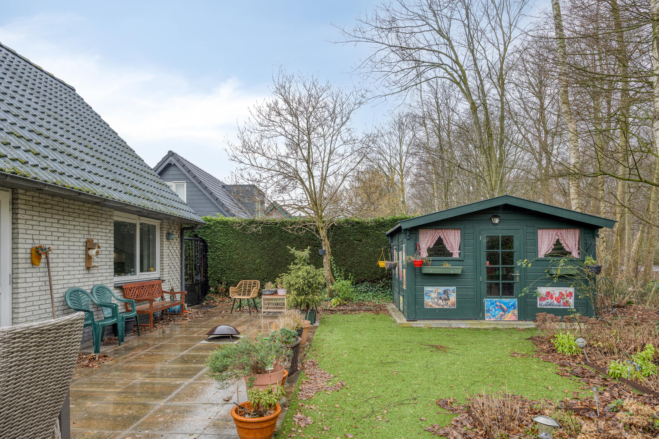 De aantrekkelijke achtertuin heeft een riant zonneterras aan de achtergevel, een sierstalen zijpoort, een houthok en en chalet annex hobbyruimte met elektra.