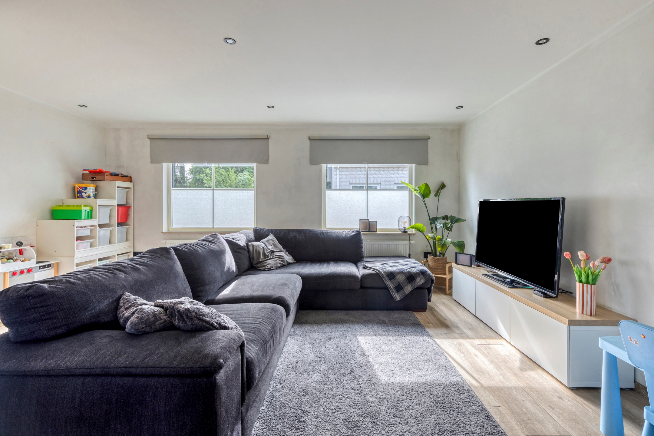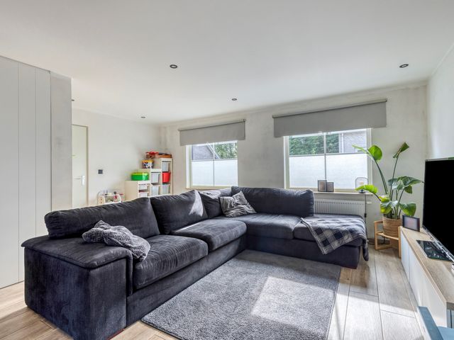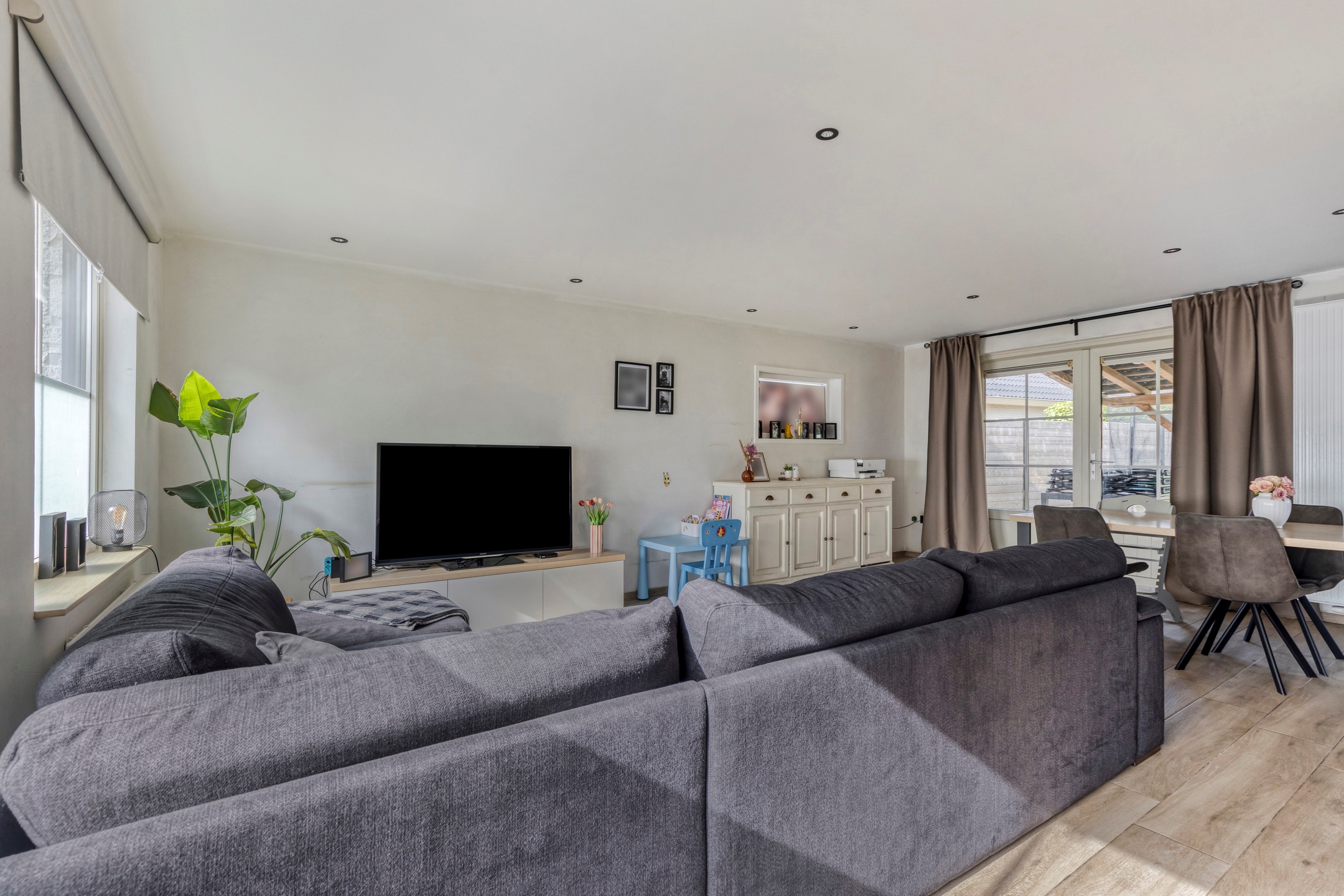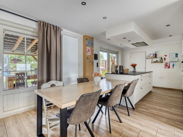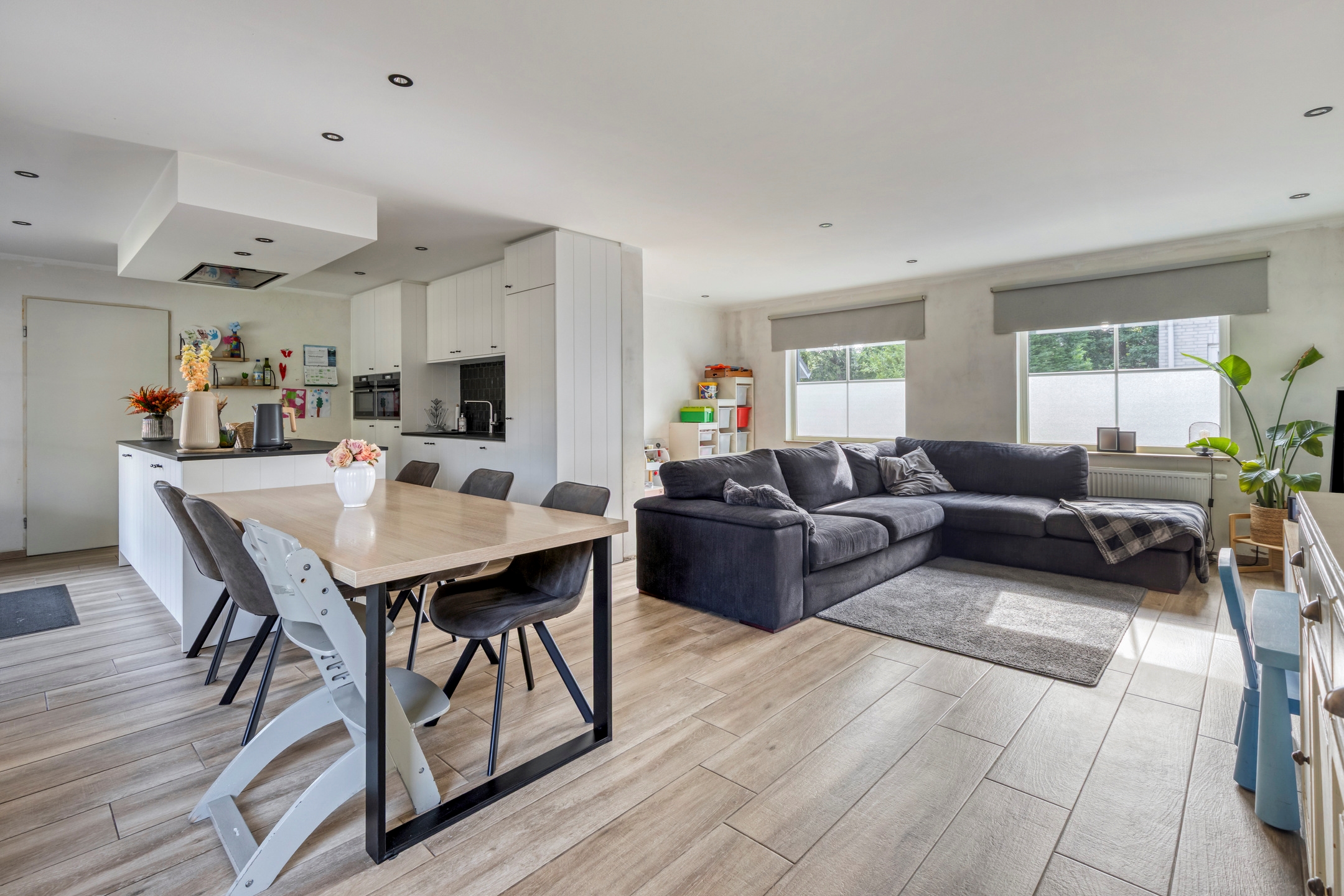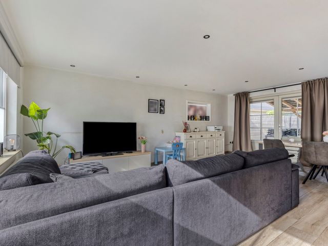 De royale woonkamer biedt volop licht dankzij de openslaande tuindeuren naar de tuin. De keramische tegelvloer in houtlook, gestucte wanden en stijlvolle inbouwspots in het plafond geven de ruimte een moderne en sfeervolle uitstraling.