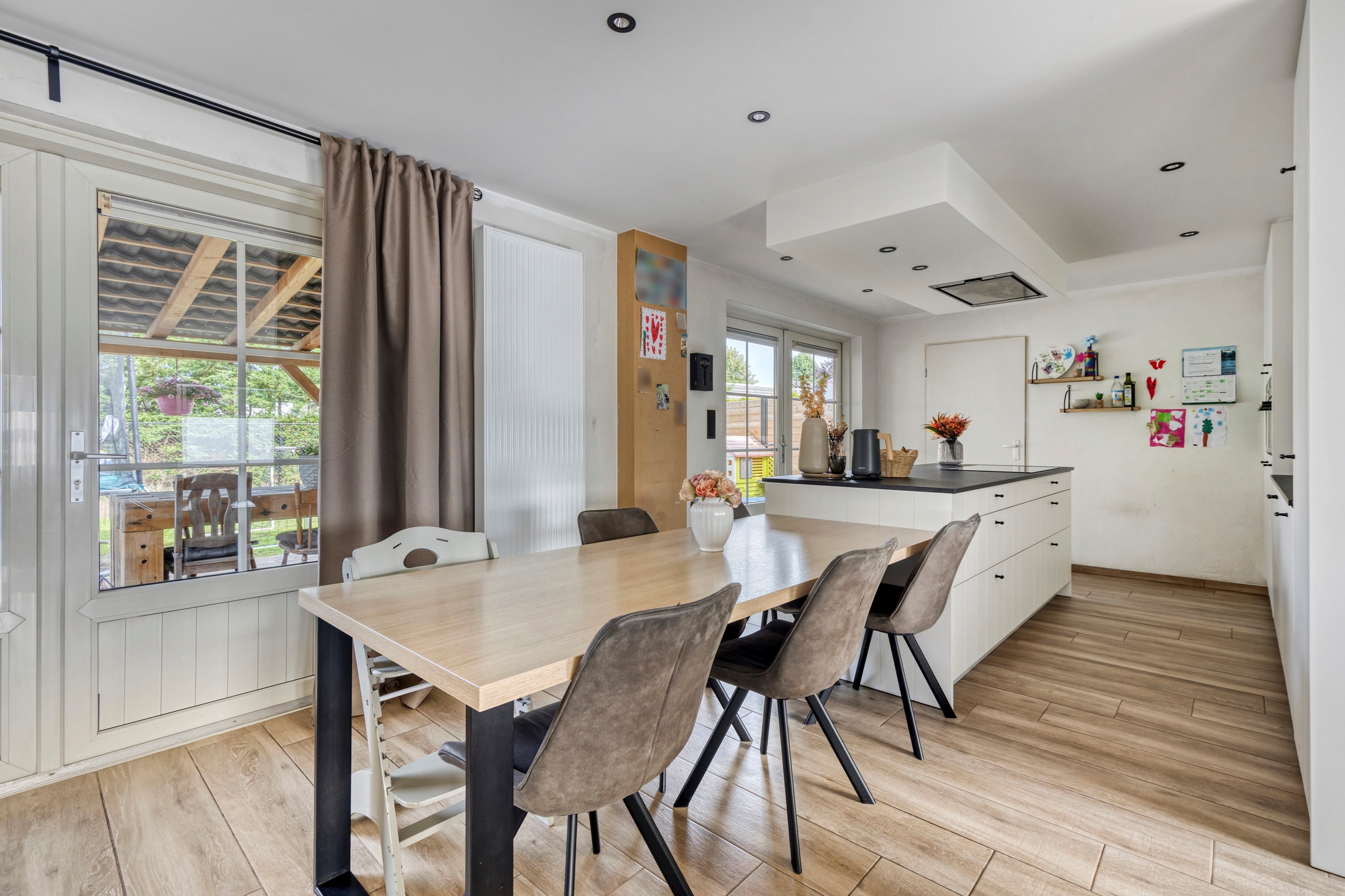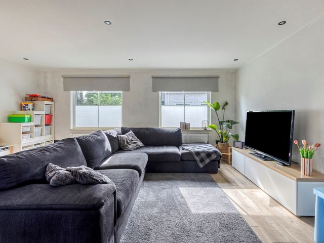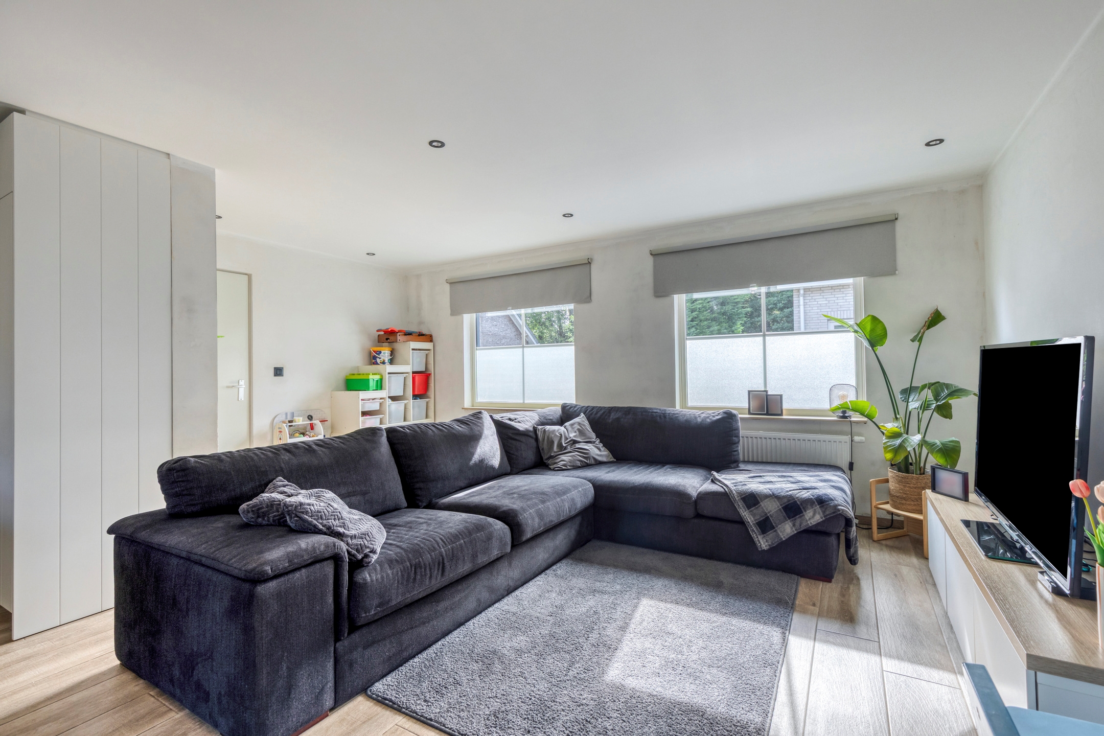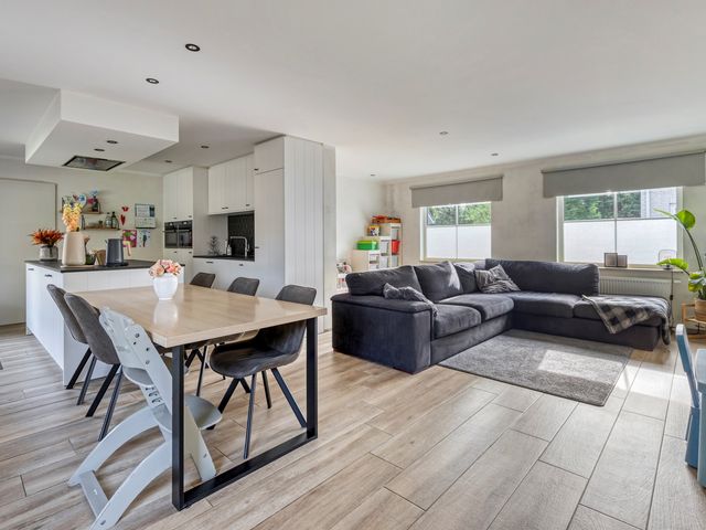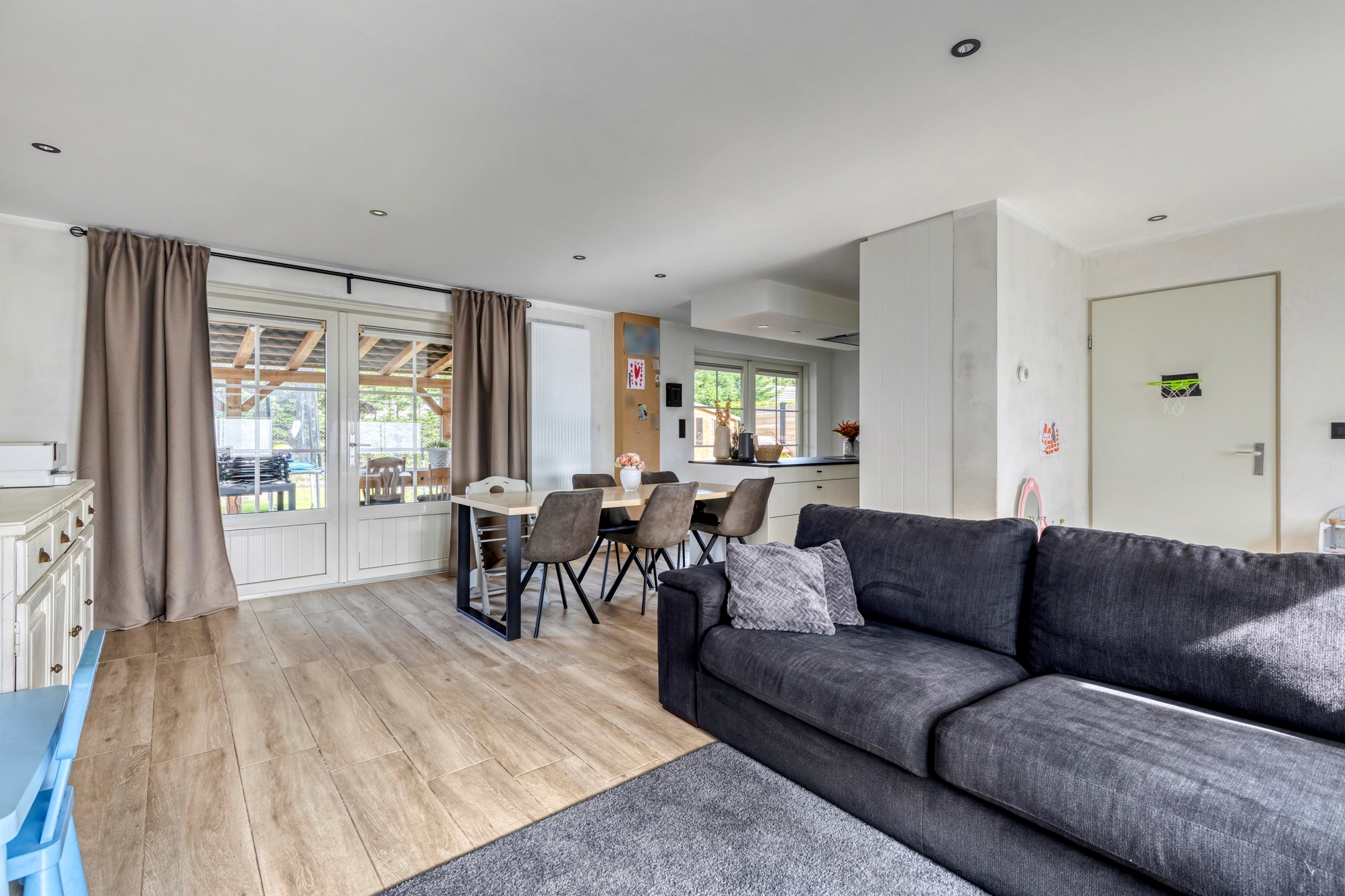 De royale woonkamer biedt volop licht dankzij de openslaande tuindeuren naar de tuin. De keramische tegelvloer in houtlook, gestucte wanden en stijlvolle inbouwspots in het plafond geven de ruimte een moderne en sfeervolle uitstraling.
