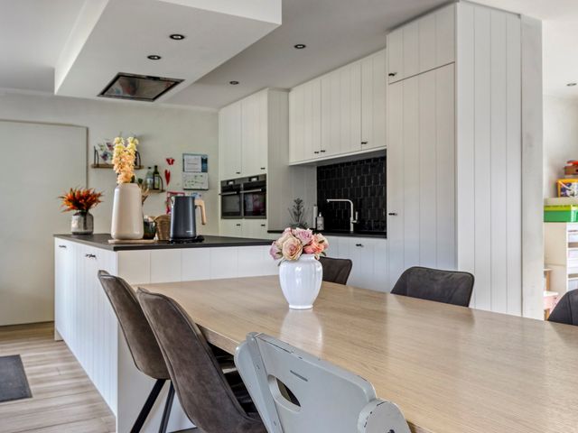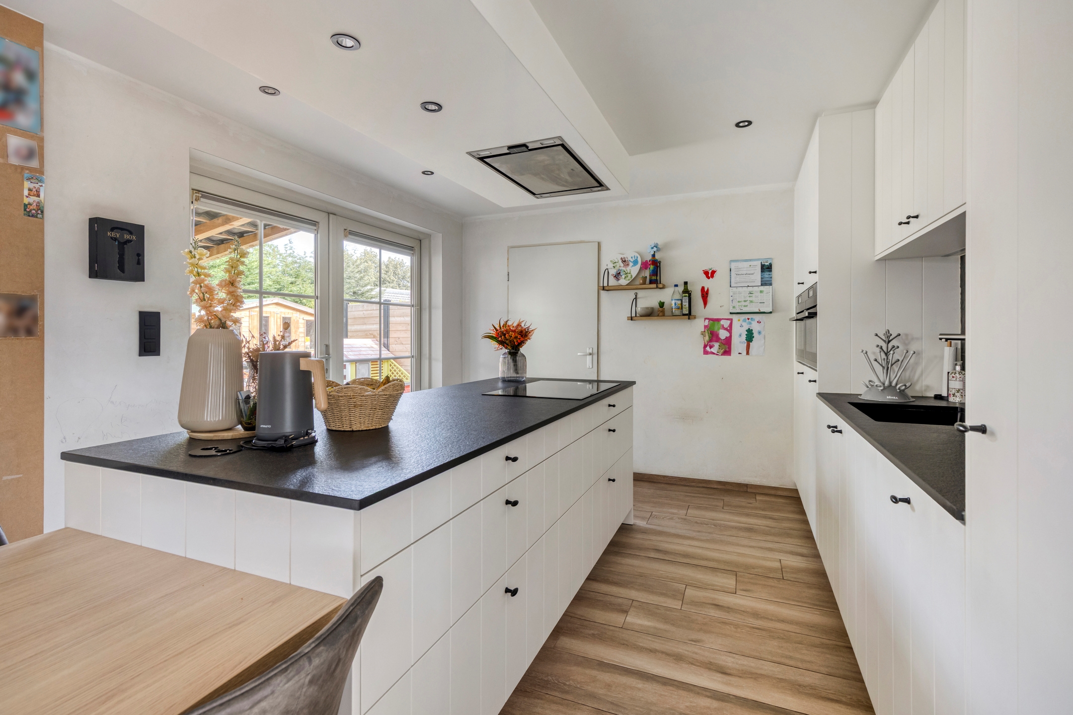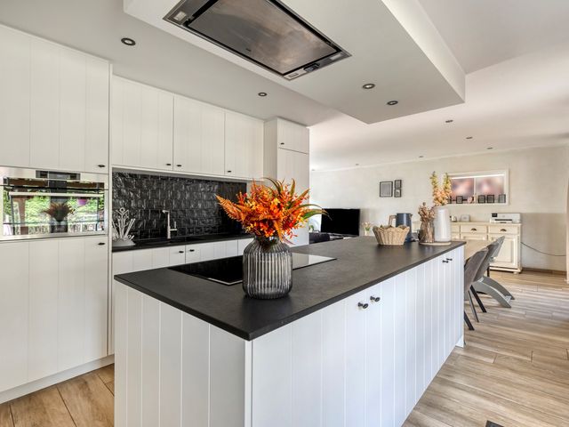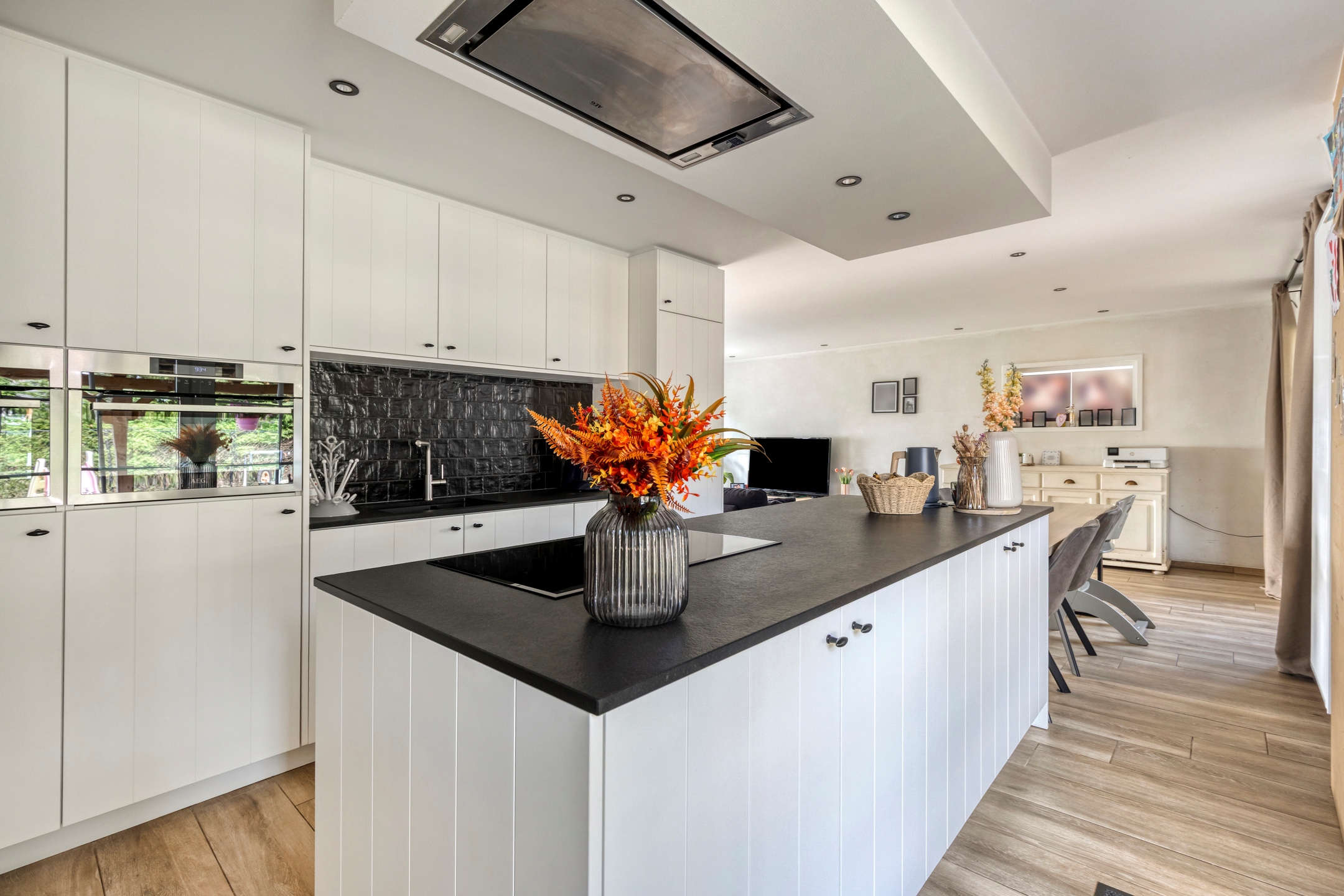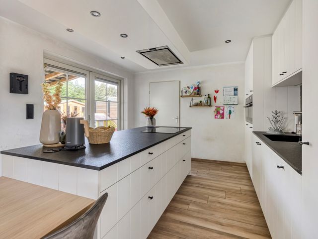 De ruime open keuken is voorzien van diverse boven- en onderkasten, lades en een modern kookeiland met inductiekookplaat en afzuigkap. In de keukenwand vind je een spoelbak, een inbouwkoelkast, een vriezer, een vaatwasmachine en twee ovens.