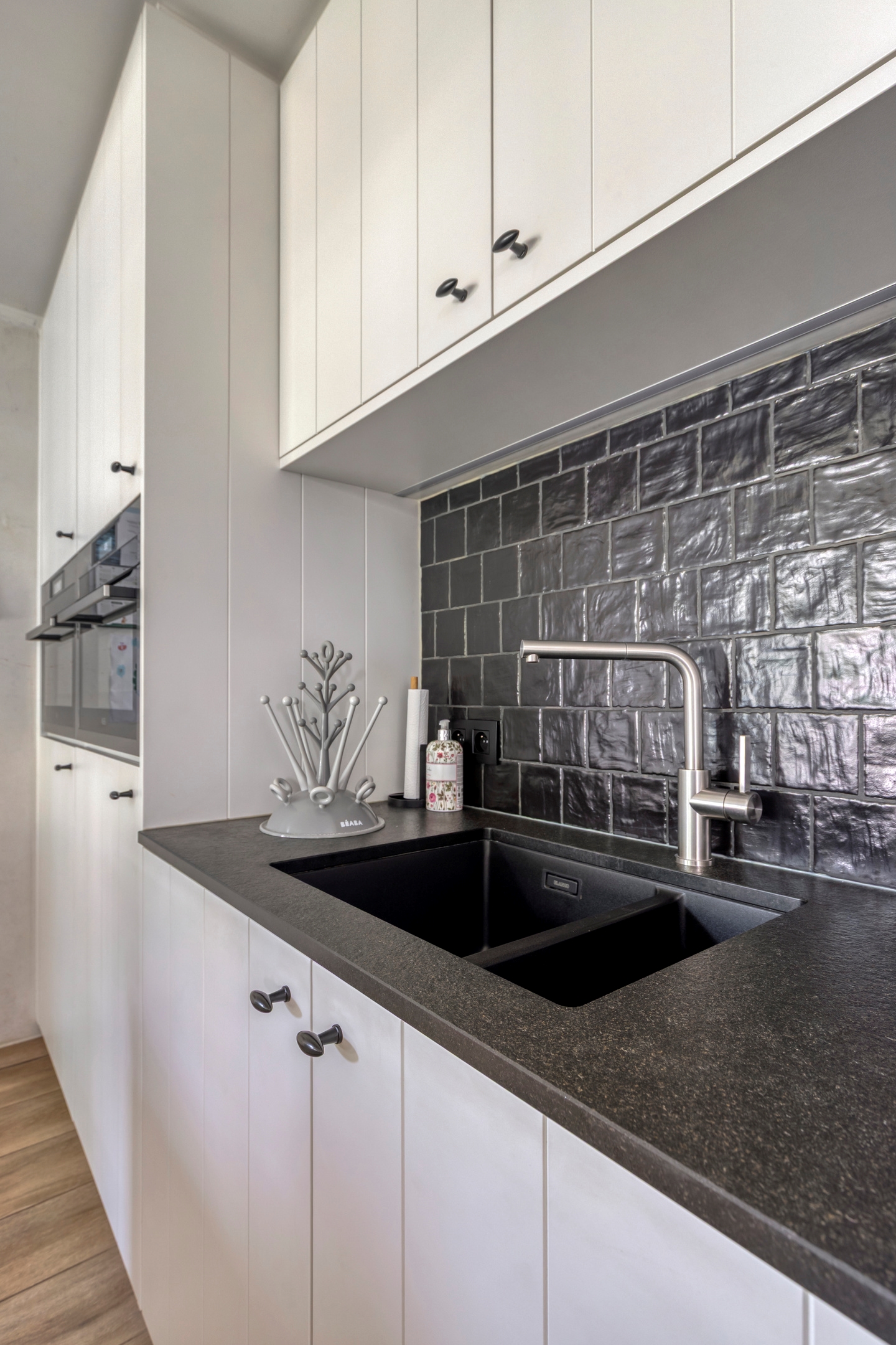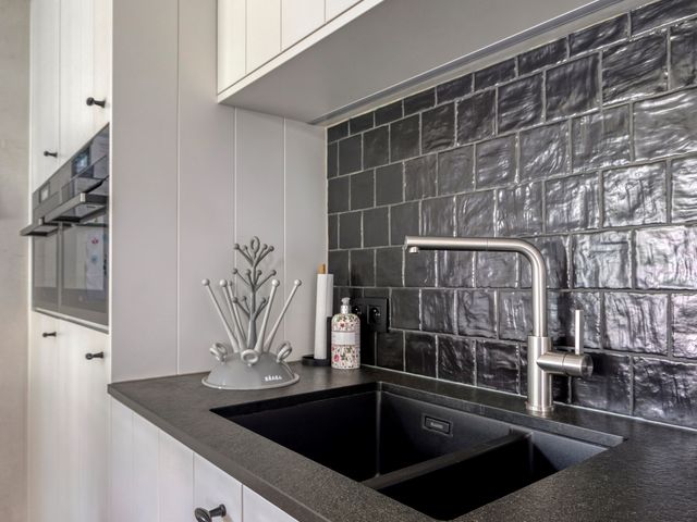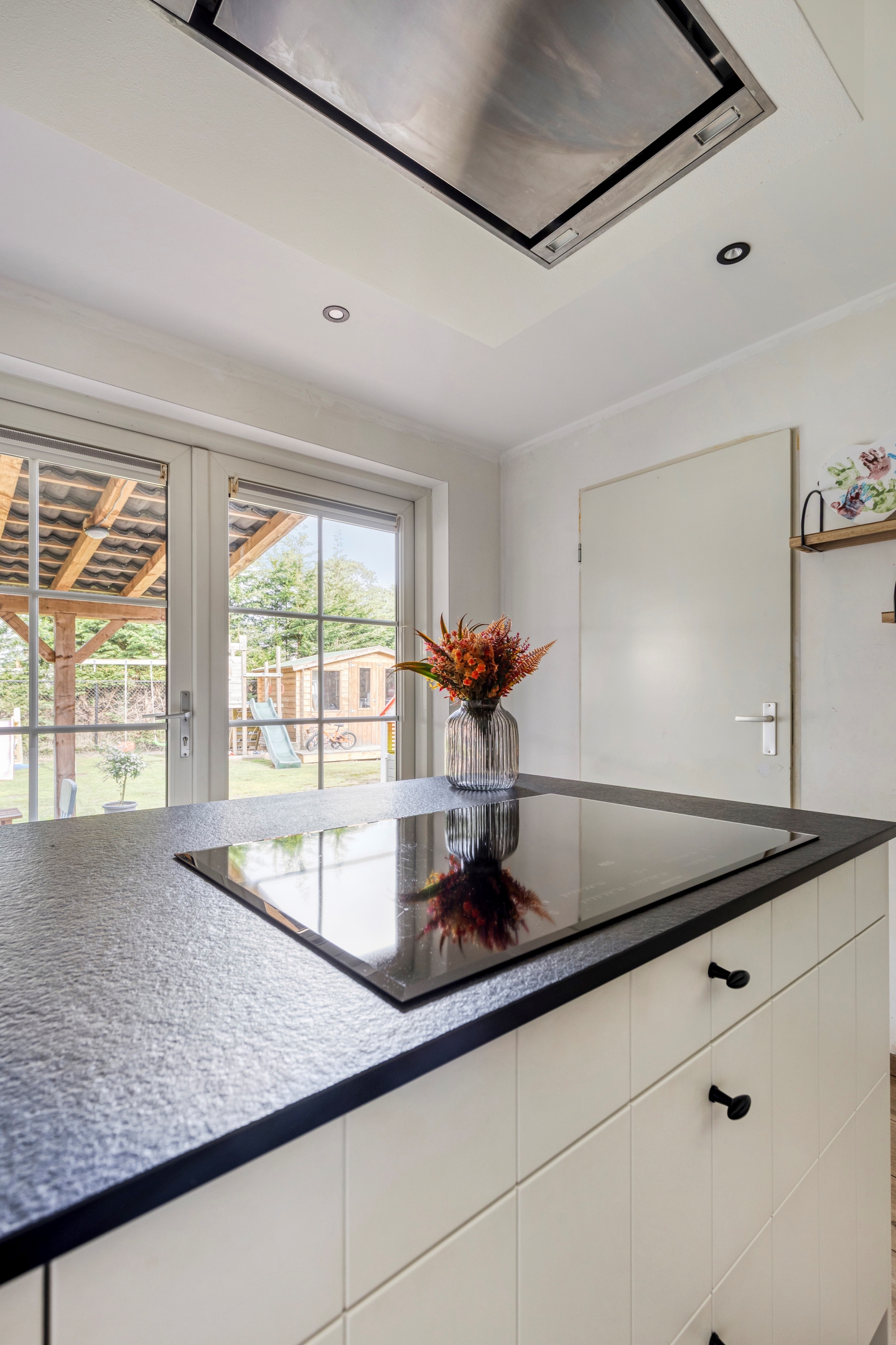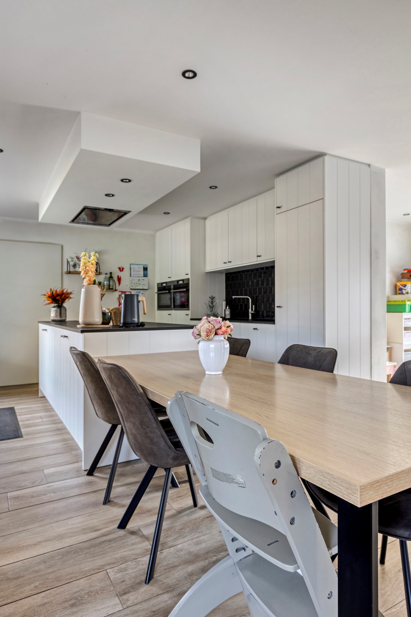 De ruime open keuken is voorzien van diverse boven- en onderkasten, lades en een modern kookeiland met inductiekookplaat en afzuigkap. In de keukenwand vind je een spoelbak, een inbouwkoelkast, een vriezer, een vaatwasmachine en twee ovens.