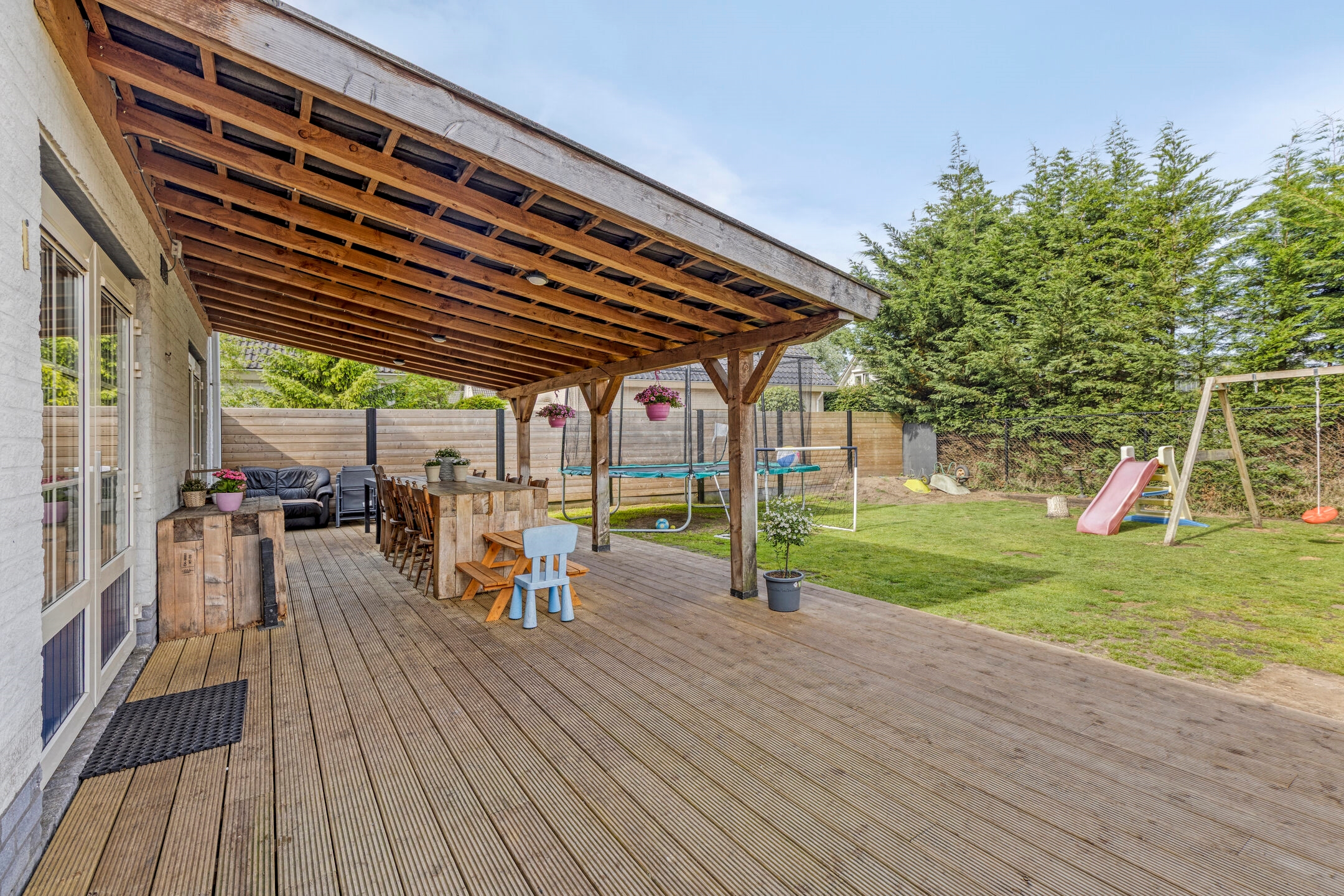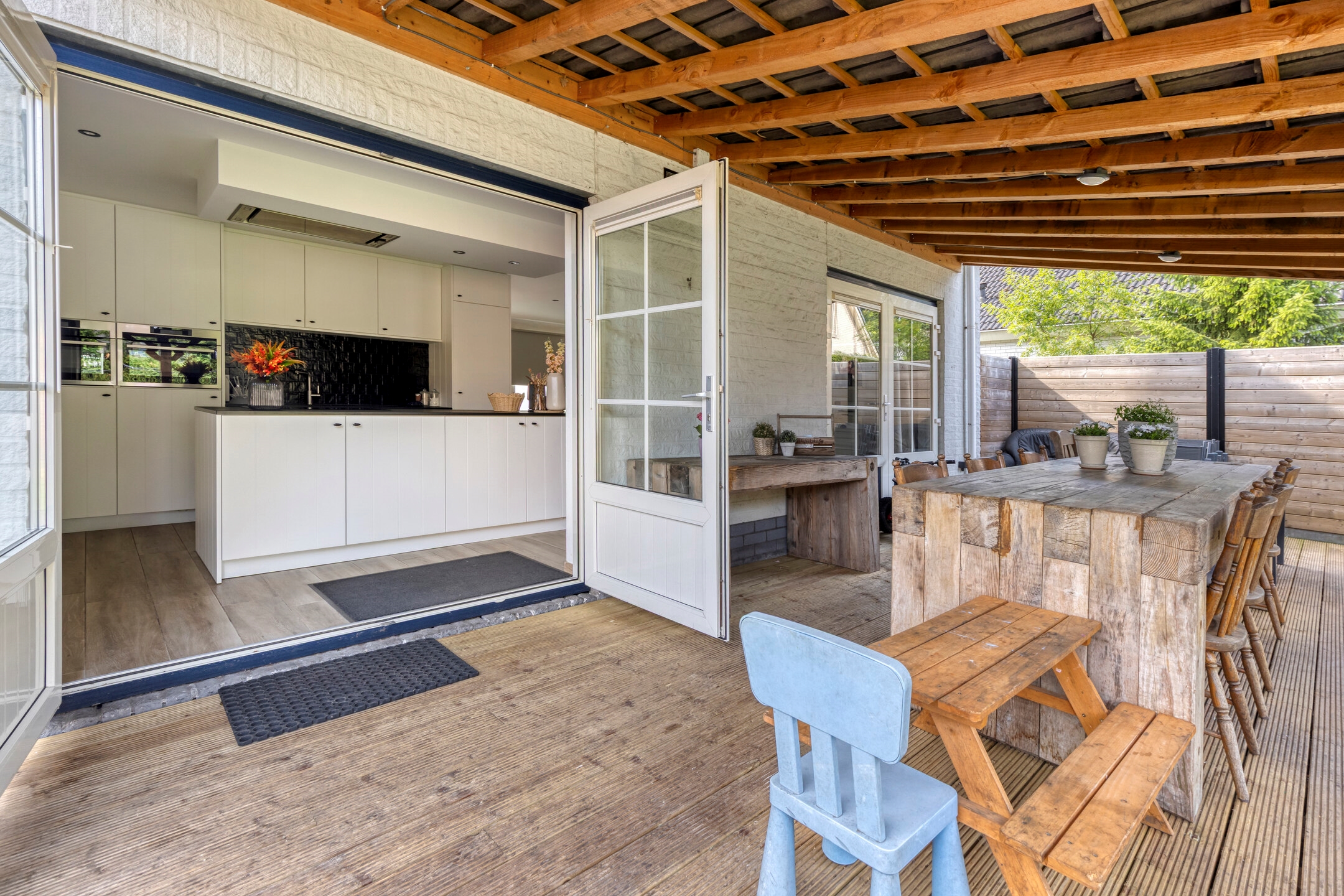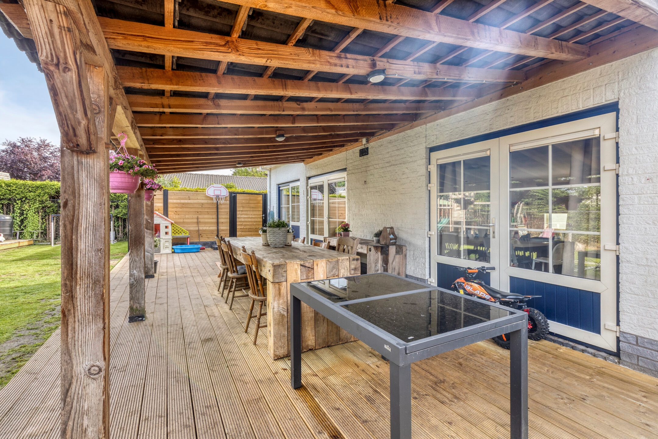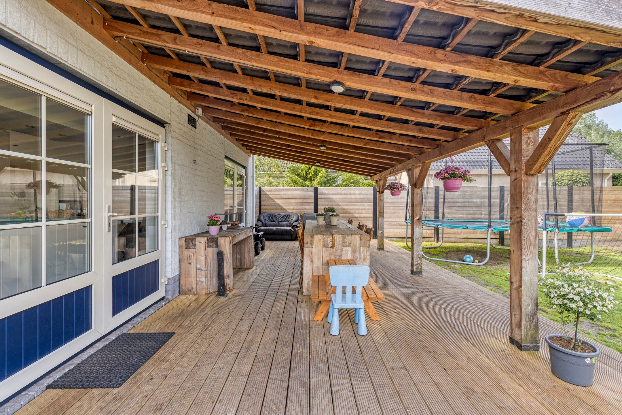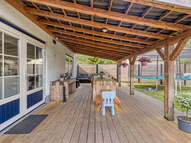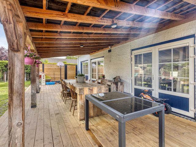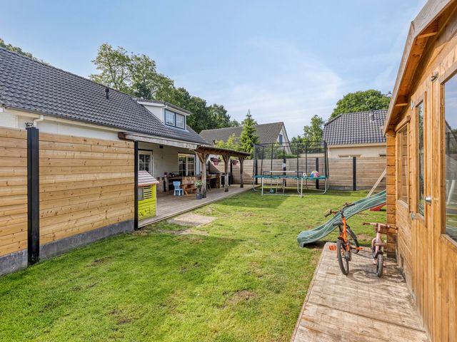 De keuring aangelegde tuin biedt volop privacy en is een heerlijke plek om te ontspannen, met een ruime sfeervolle overkapping, houten vlonders, een gazon, vaste beplanting en een ruim tuinhuis.
