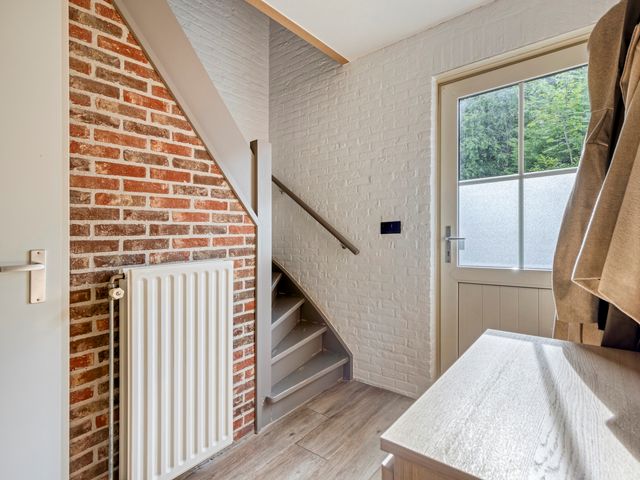 Een ruime ontvangsthal met houten trap naar de 1e verdieping. Vanuit de ontvangsthal is er toegang tot de L-vormige woonkamer en de trapkast. De ontvangsthal is voorzien van een keramische tegelvloer en de wanden zijn voorzien van schoonmetselwerk.