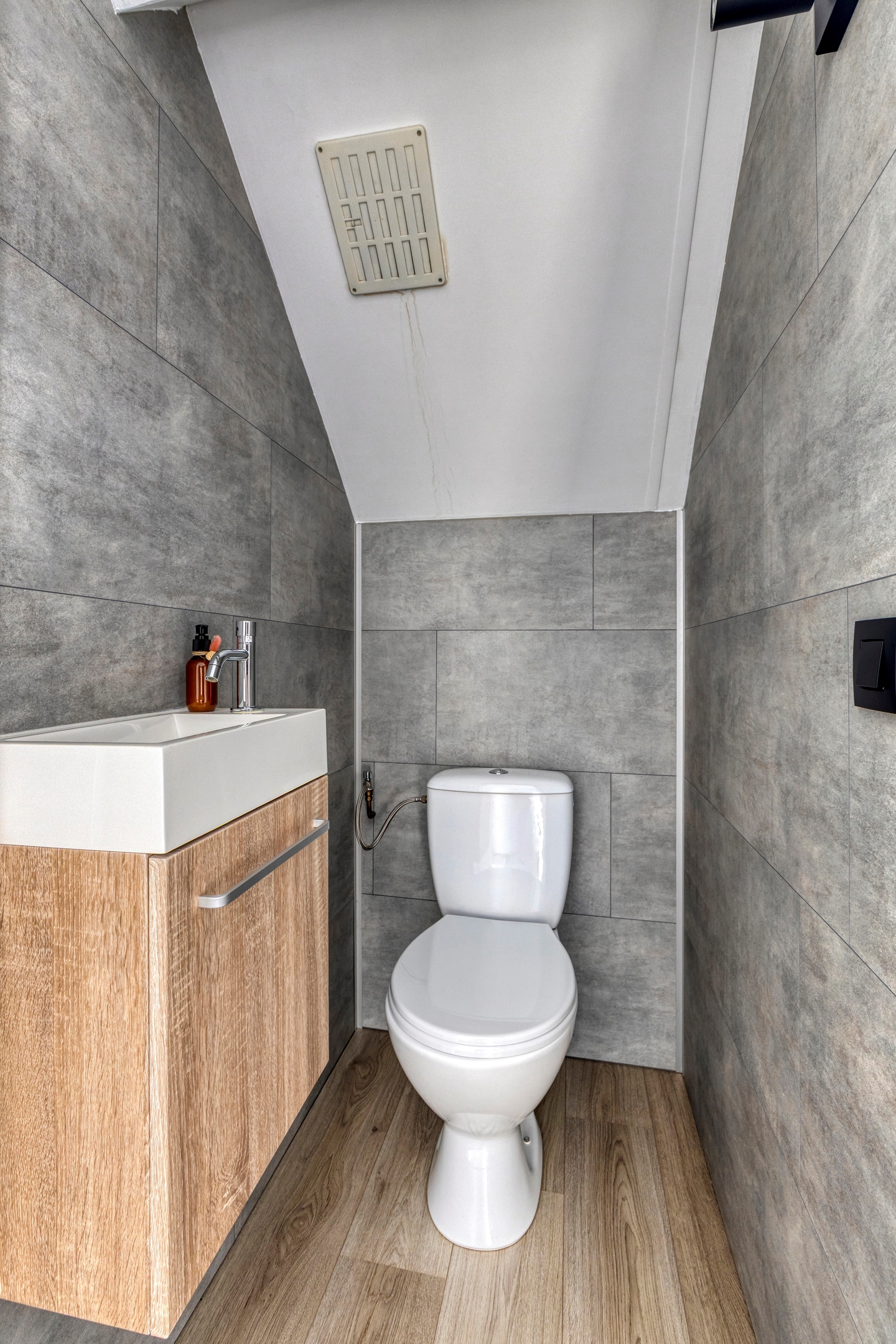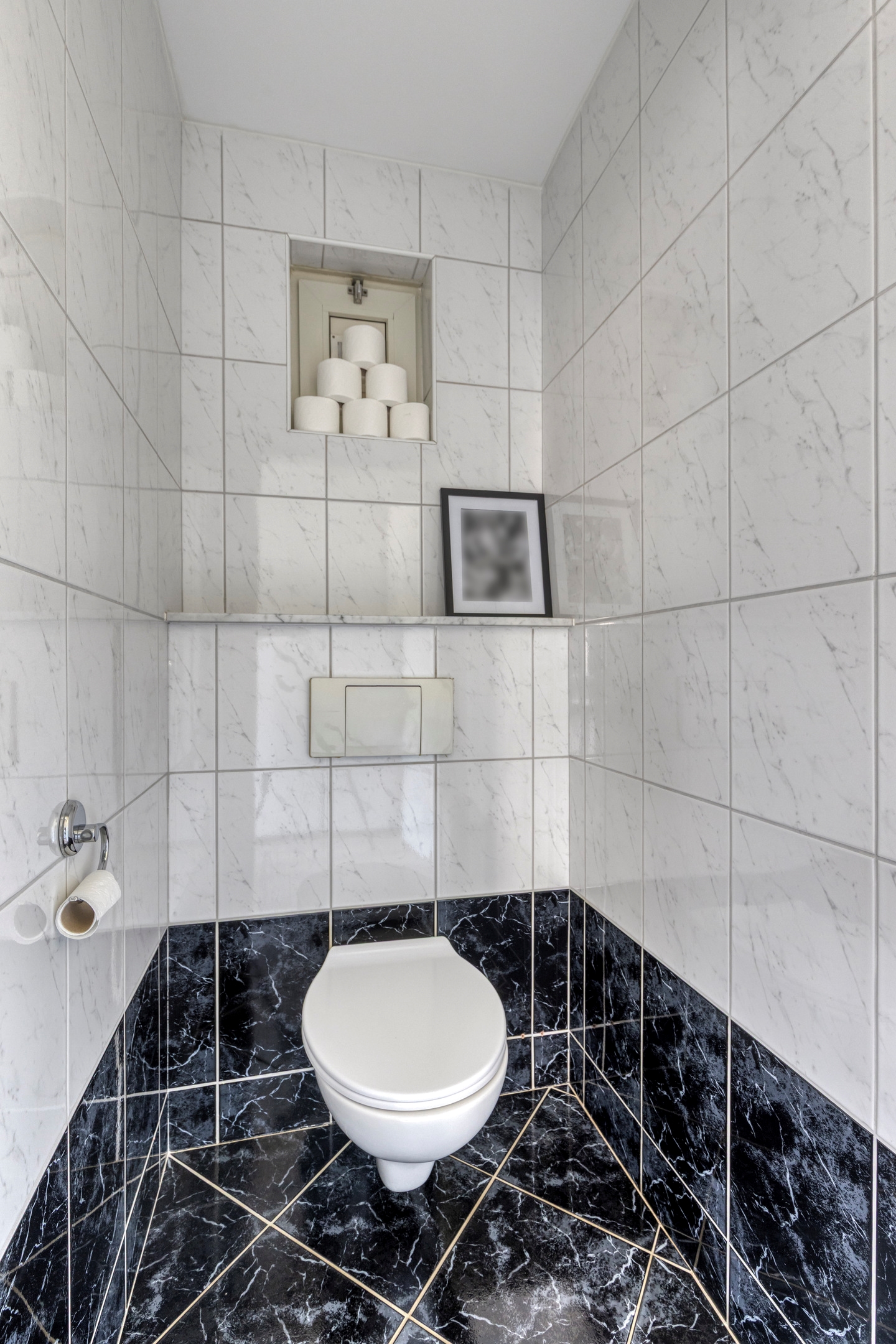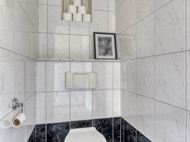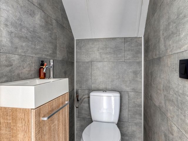 Het toilet is geheel betegeld en is voorzien van een wandcloset.